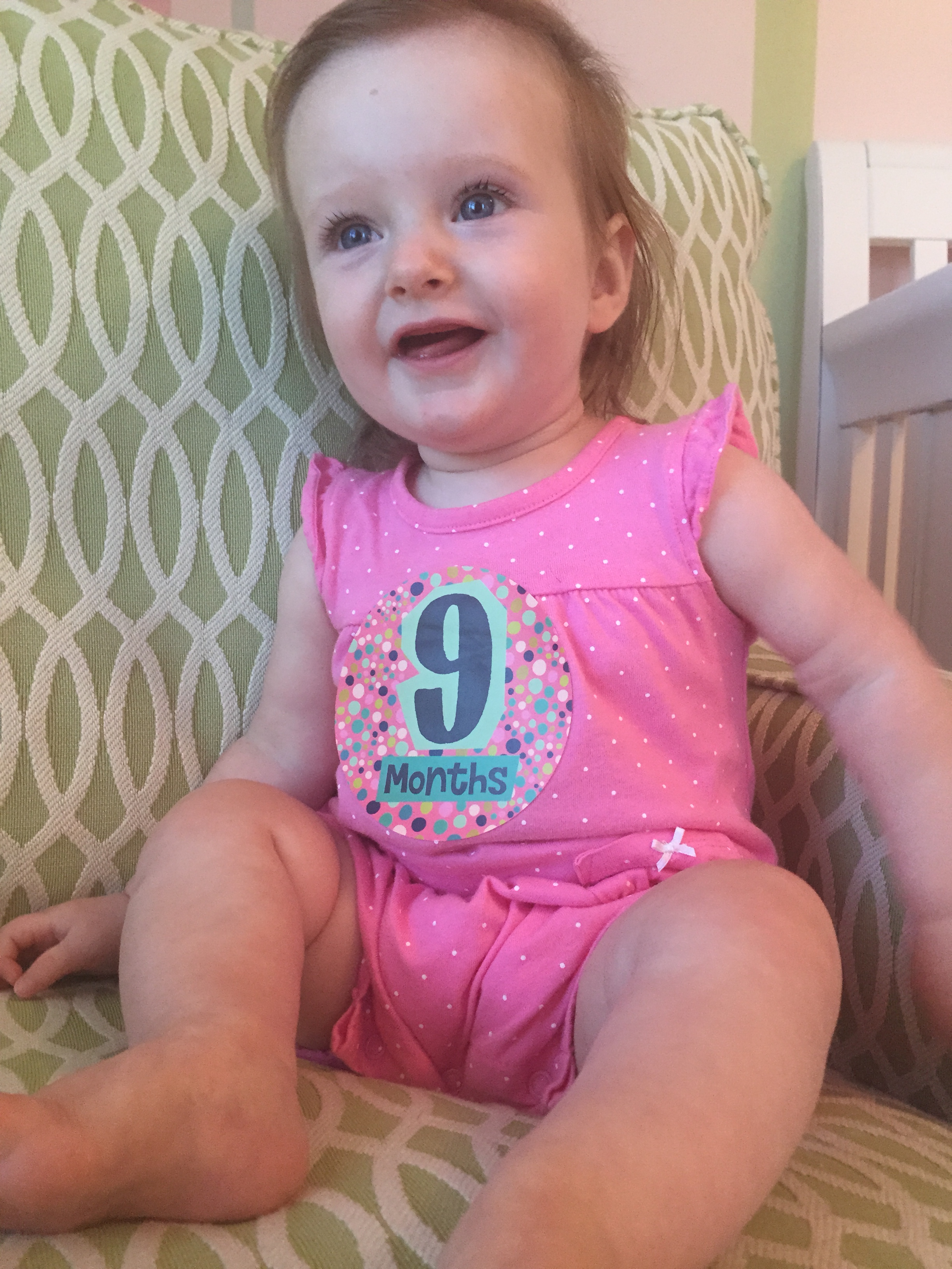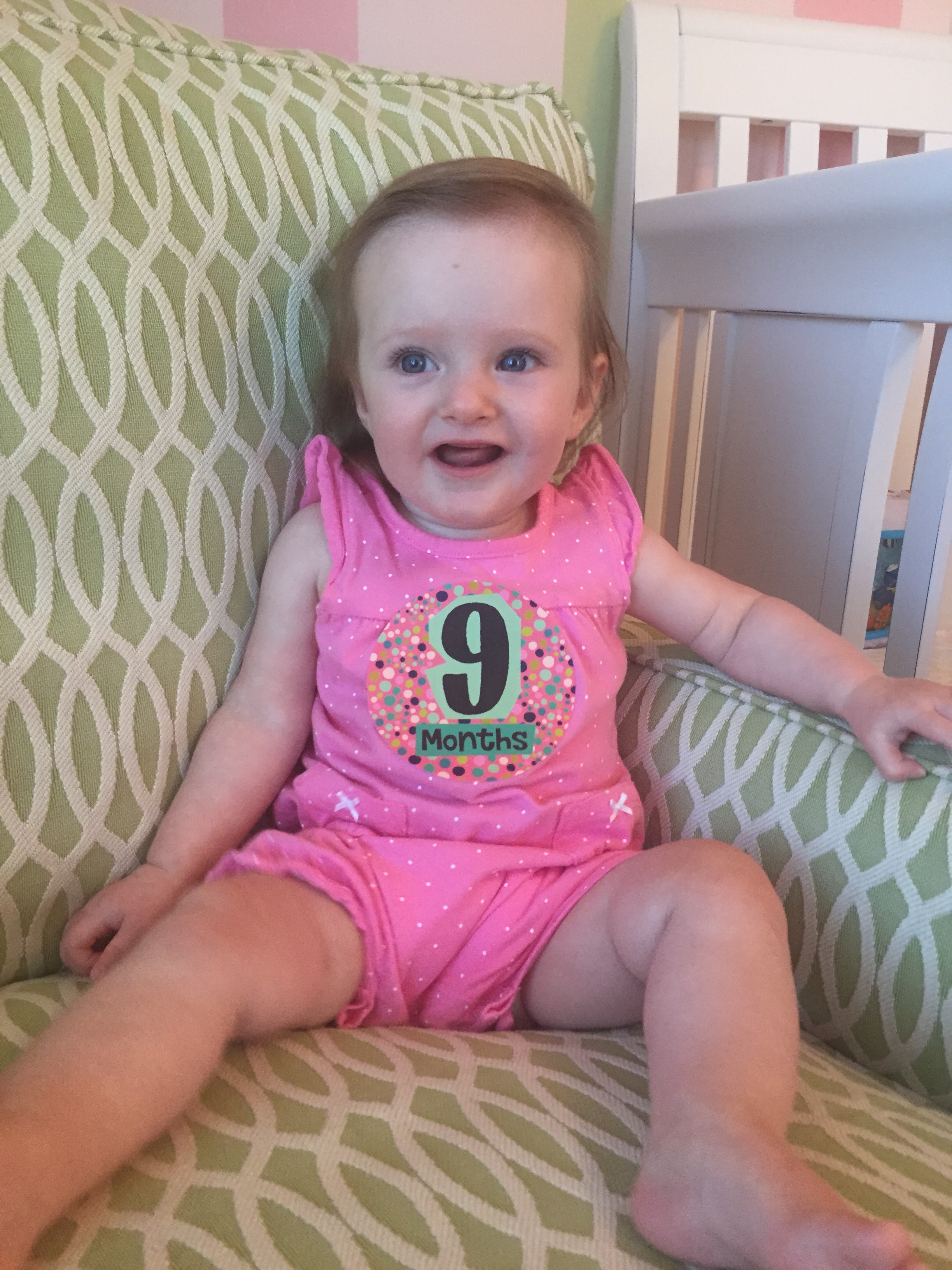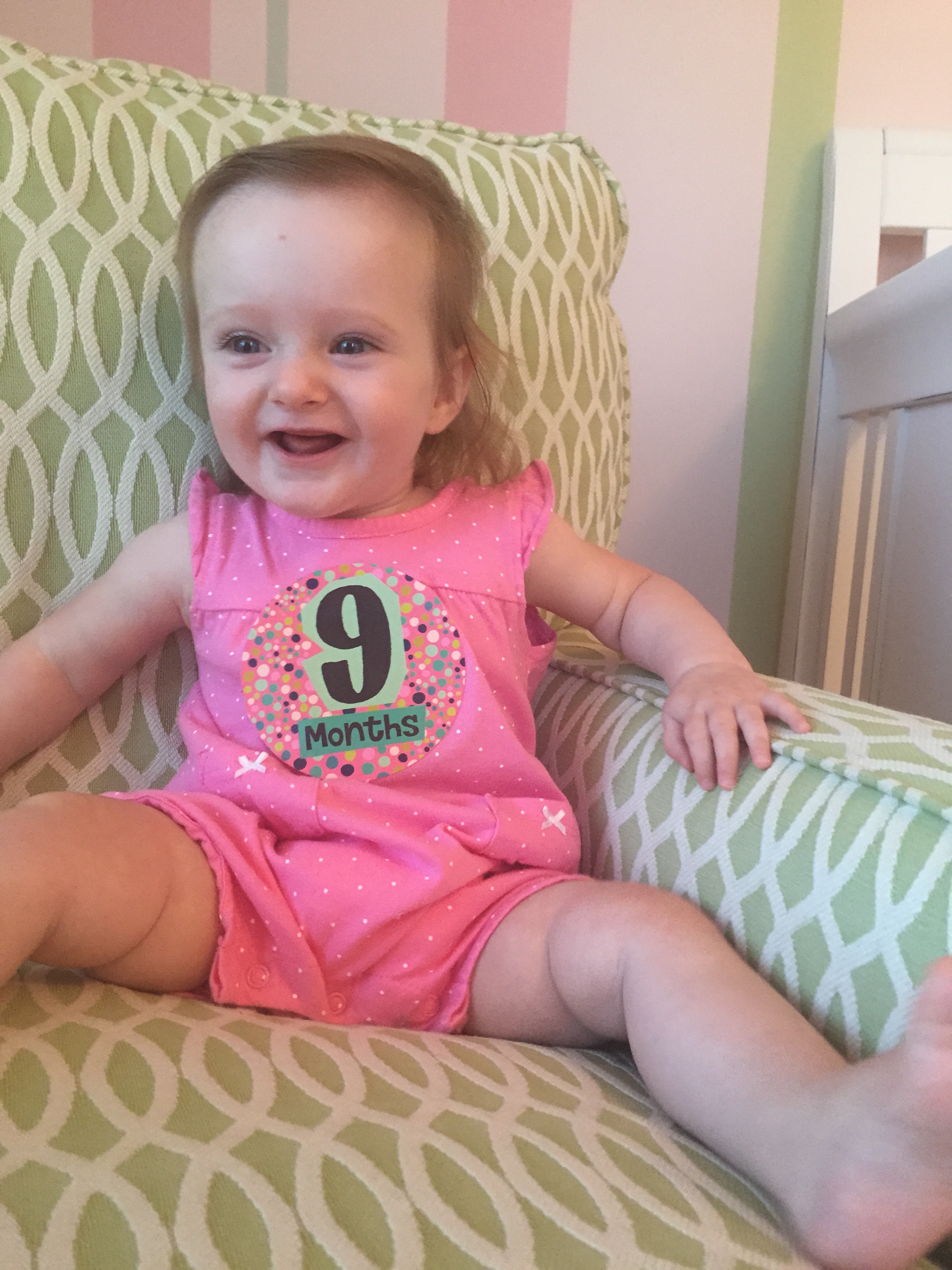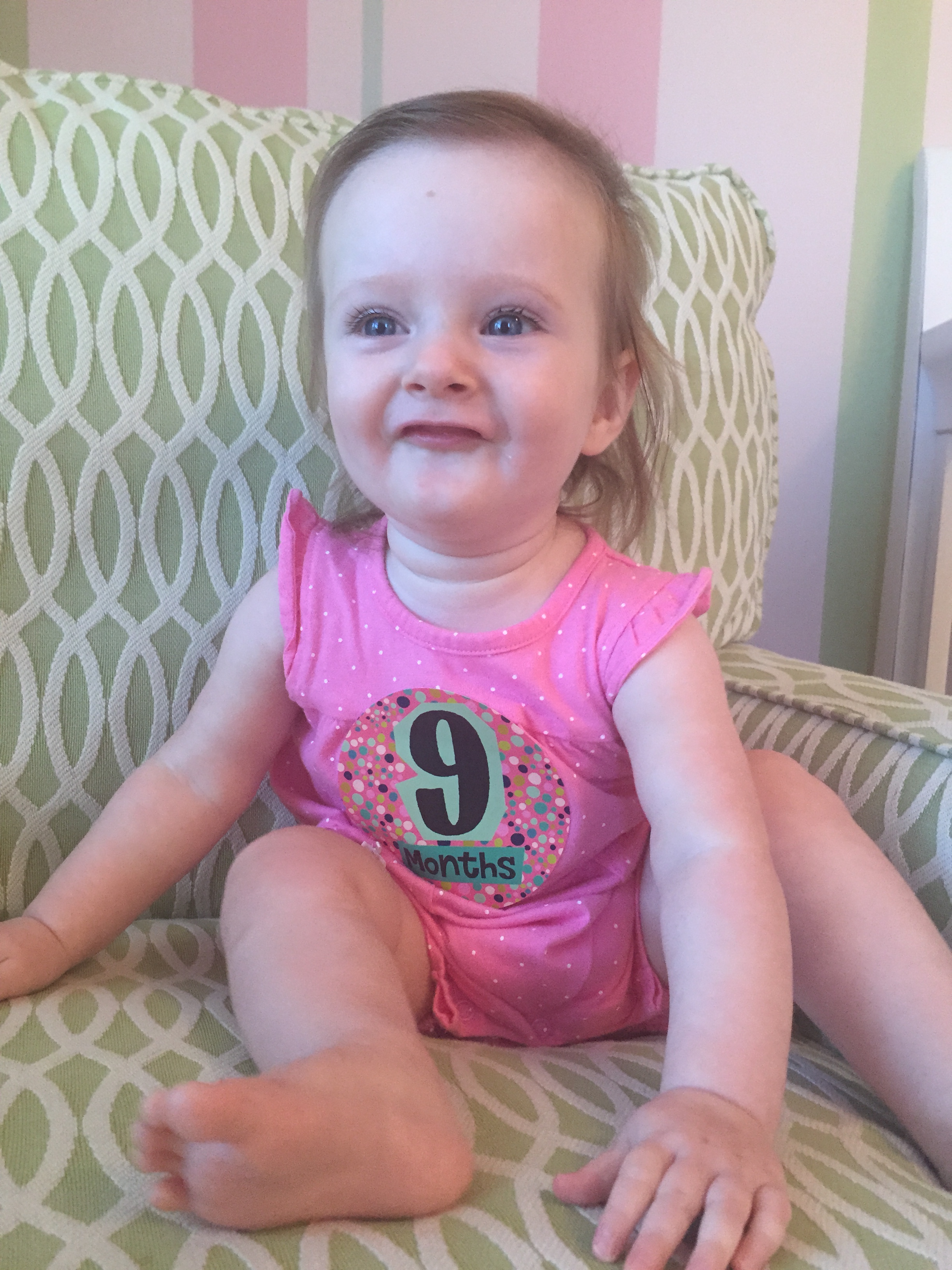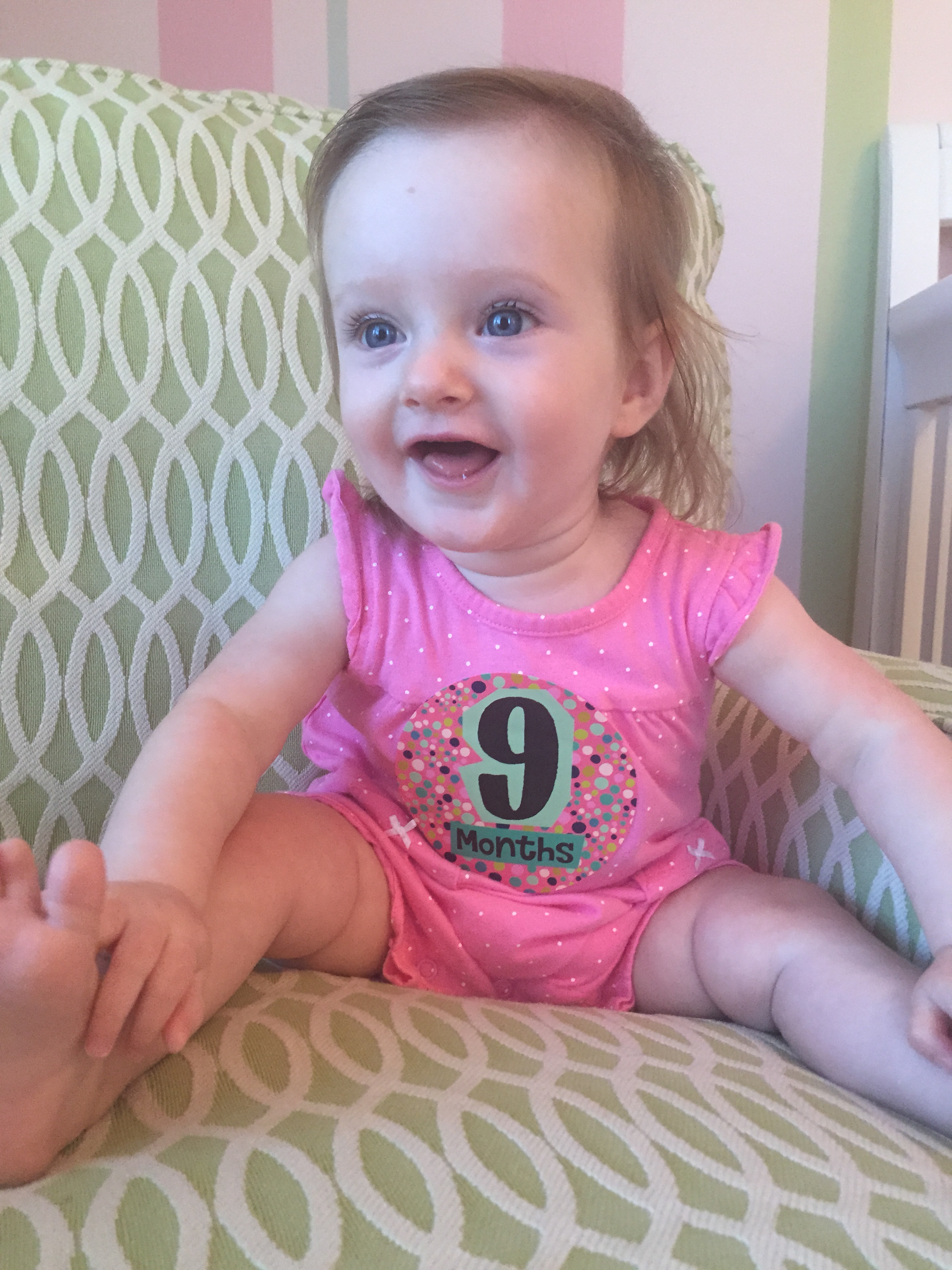 I can’t believe you are nine months old already…you are growing up way too fast!! We had your doctor’s appointment and you did very well. Dr. Wong was impressed that you are eating all solid foods and sleeping through the night. He said you are perfect. You had one vaccine and didn’t even cry when you got the shot…both the nurse and myself were shocked. You are such a tough little girl 🙂