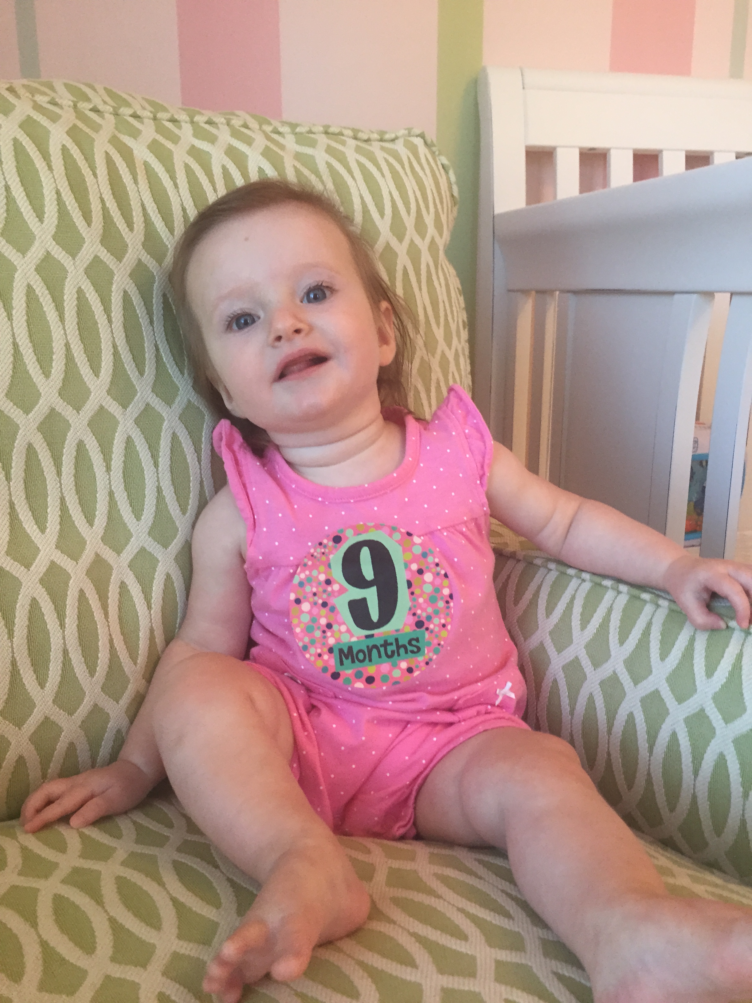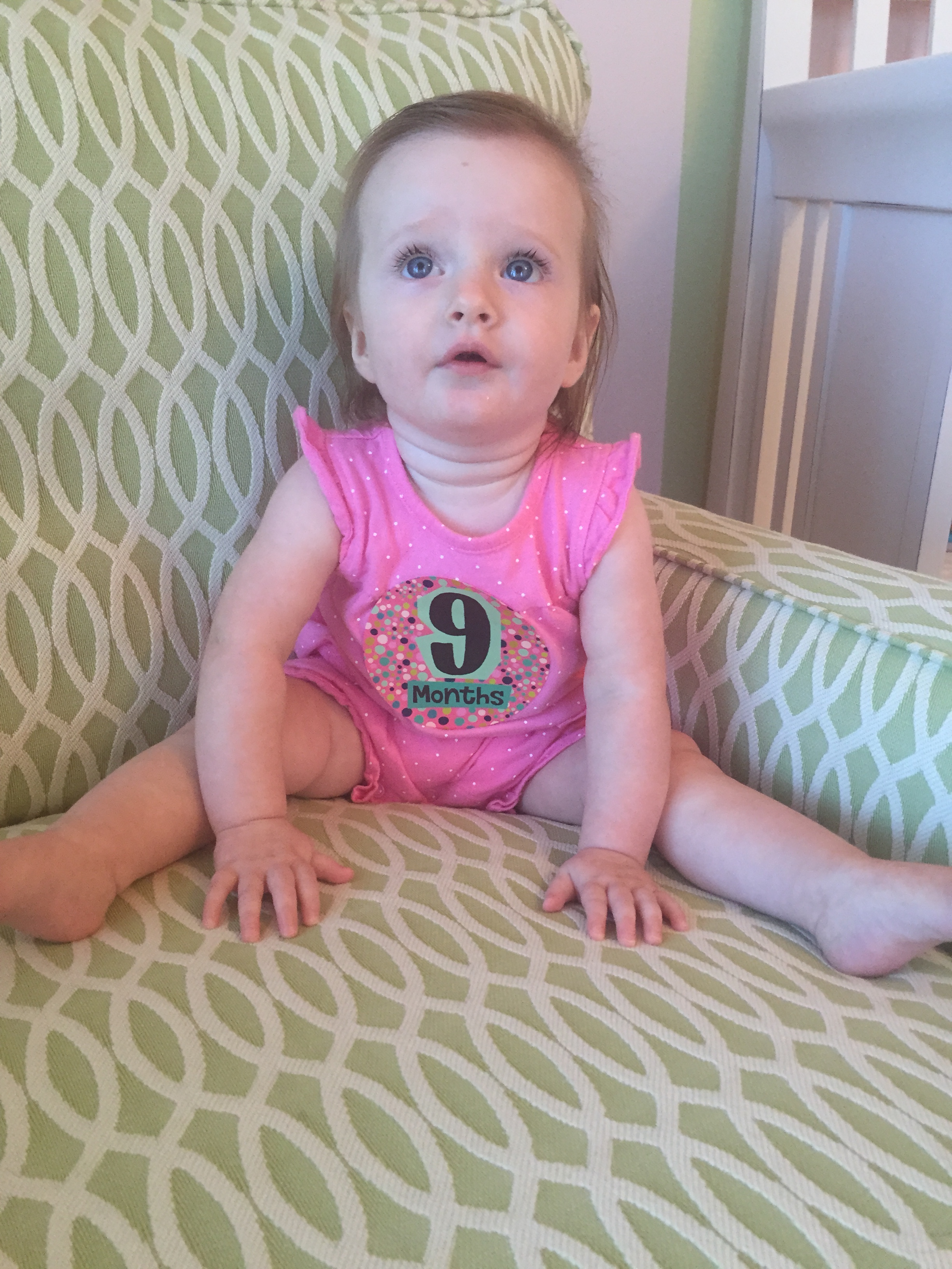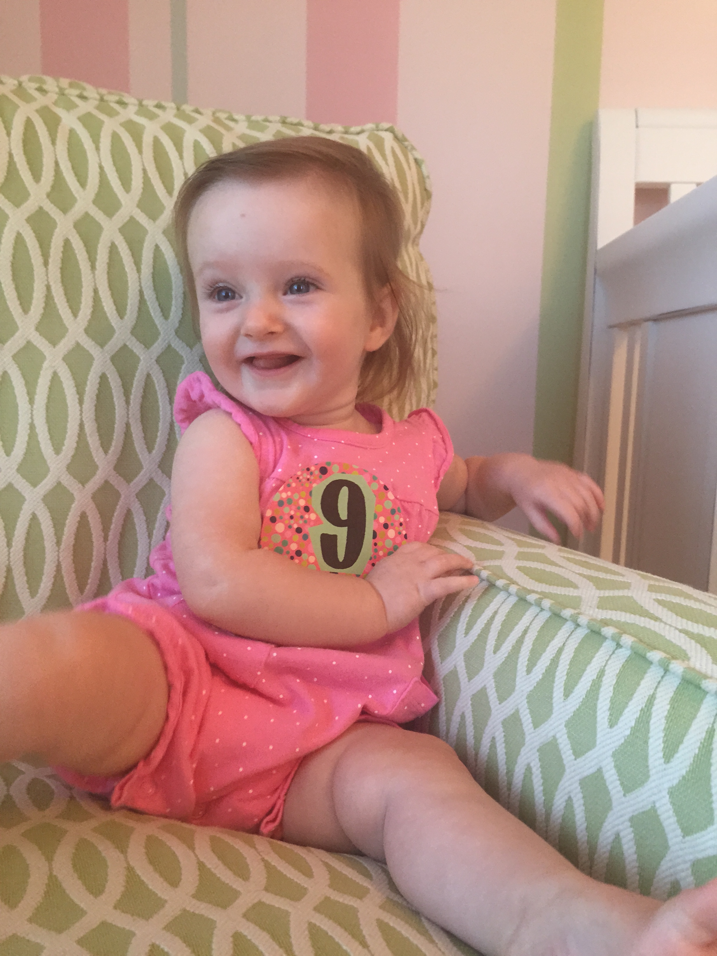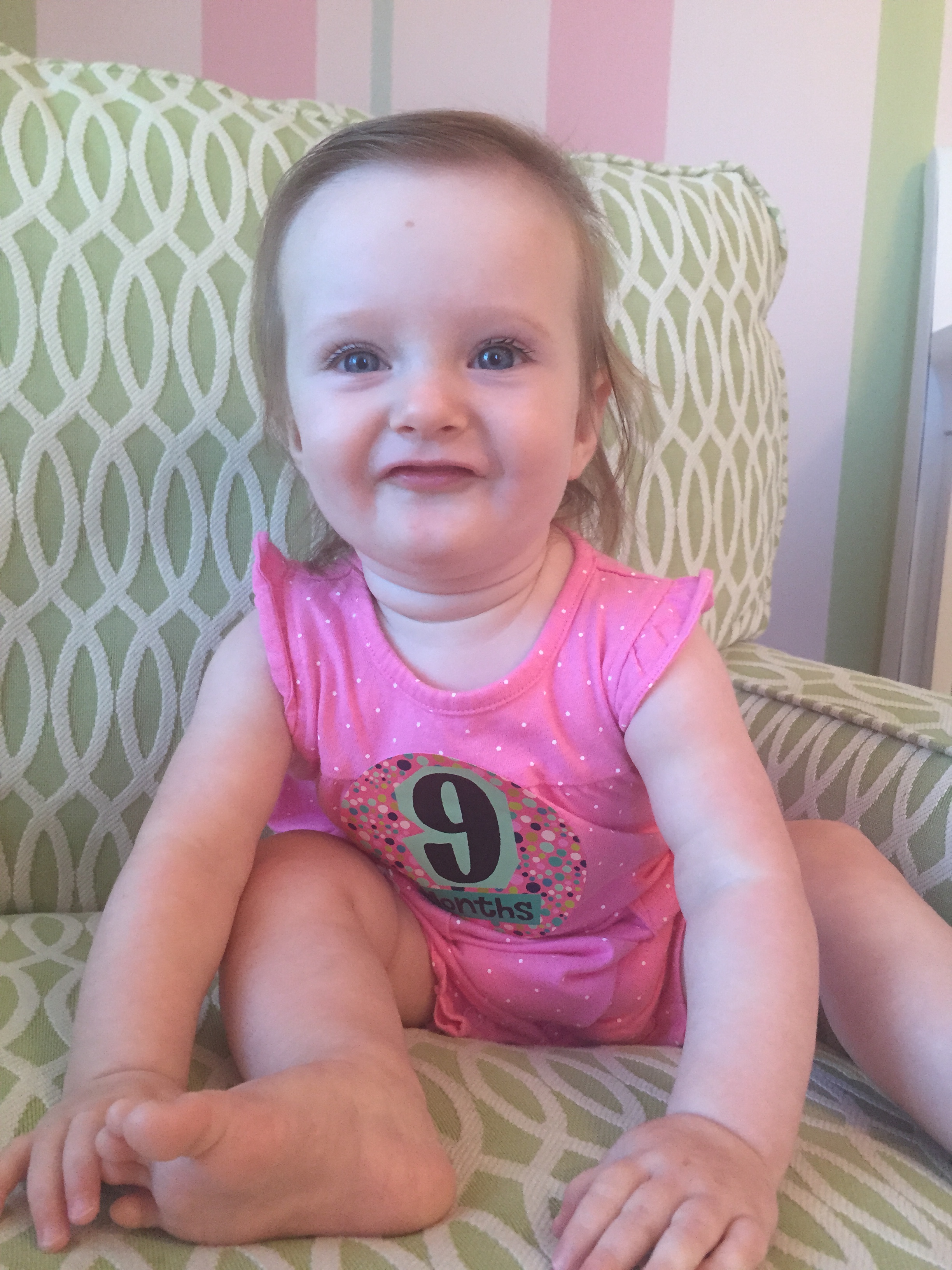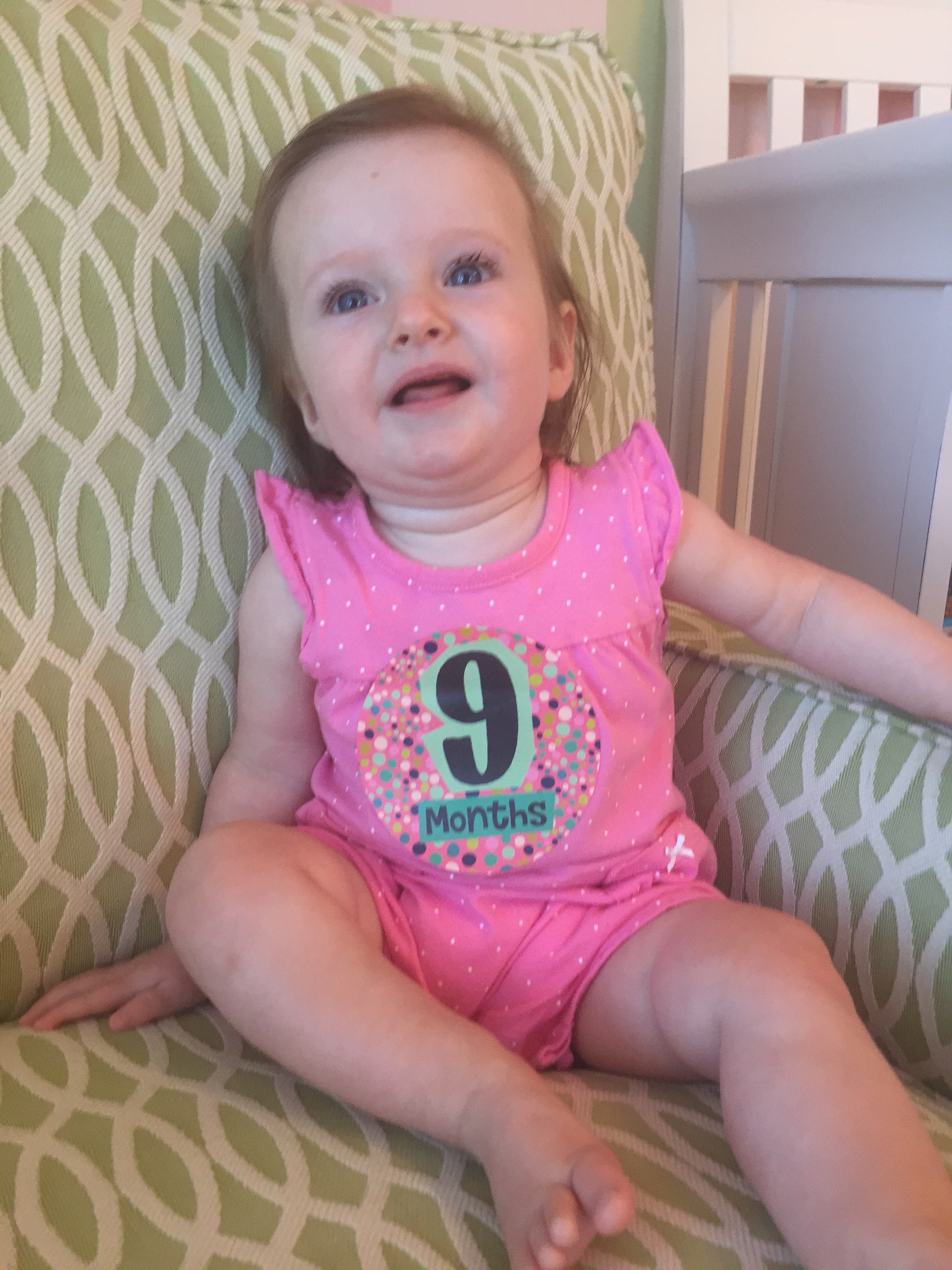 I can’t believe you are nine months old already…you are growing up way too fast!! We had your doctor’s appointment and you did very well. Dr. Wong was impressed that you are eating all solid foods and sleeping through the night. He said you are perfect. You had one vaccine and didn’t even cry when you got the shot…both the nurse and myself were shocked. You are such a tough little girl 🙂