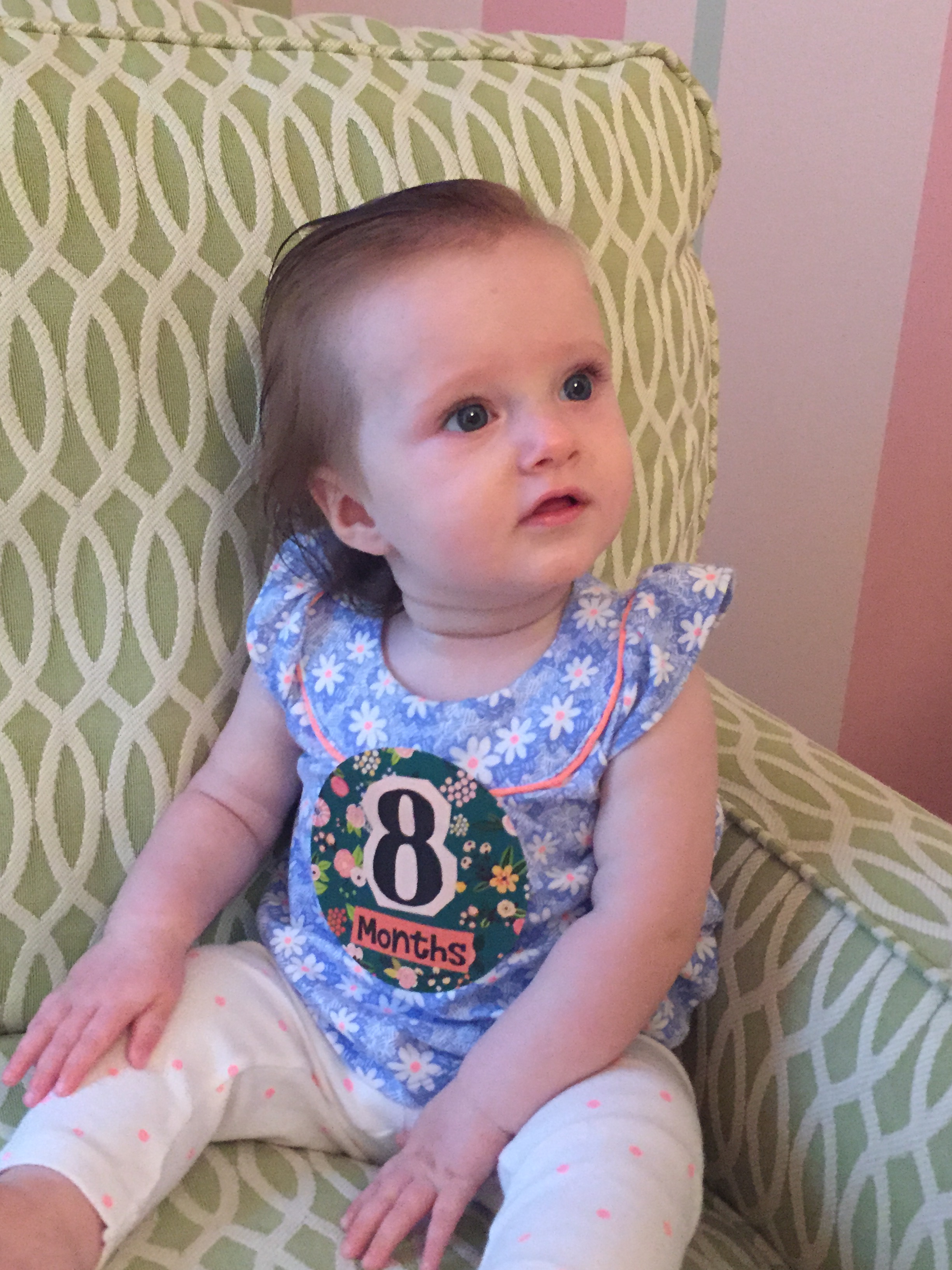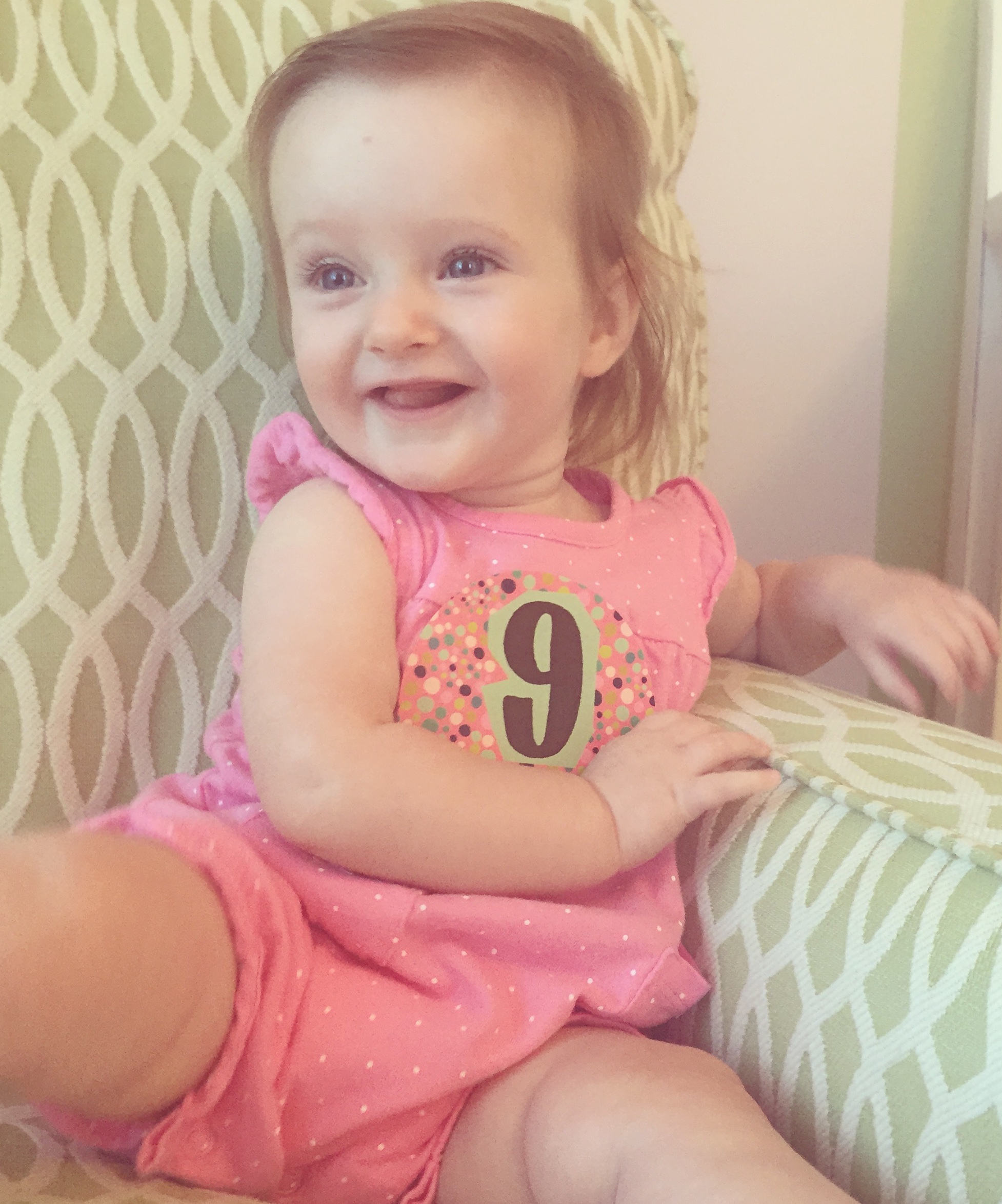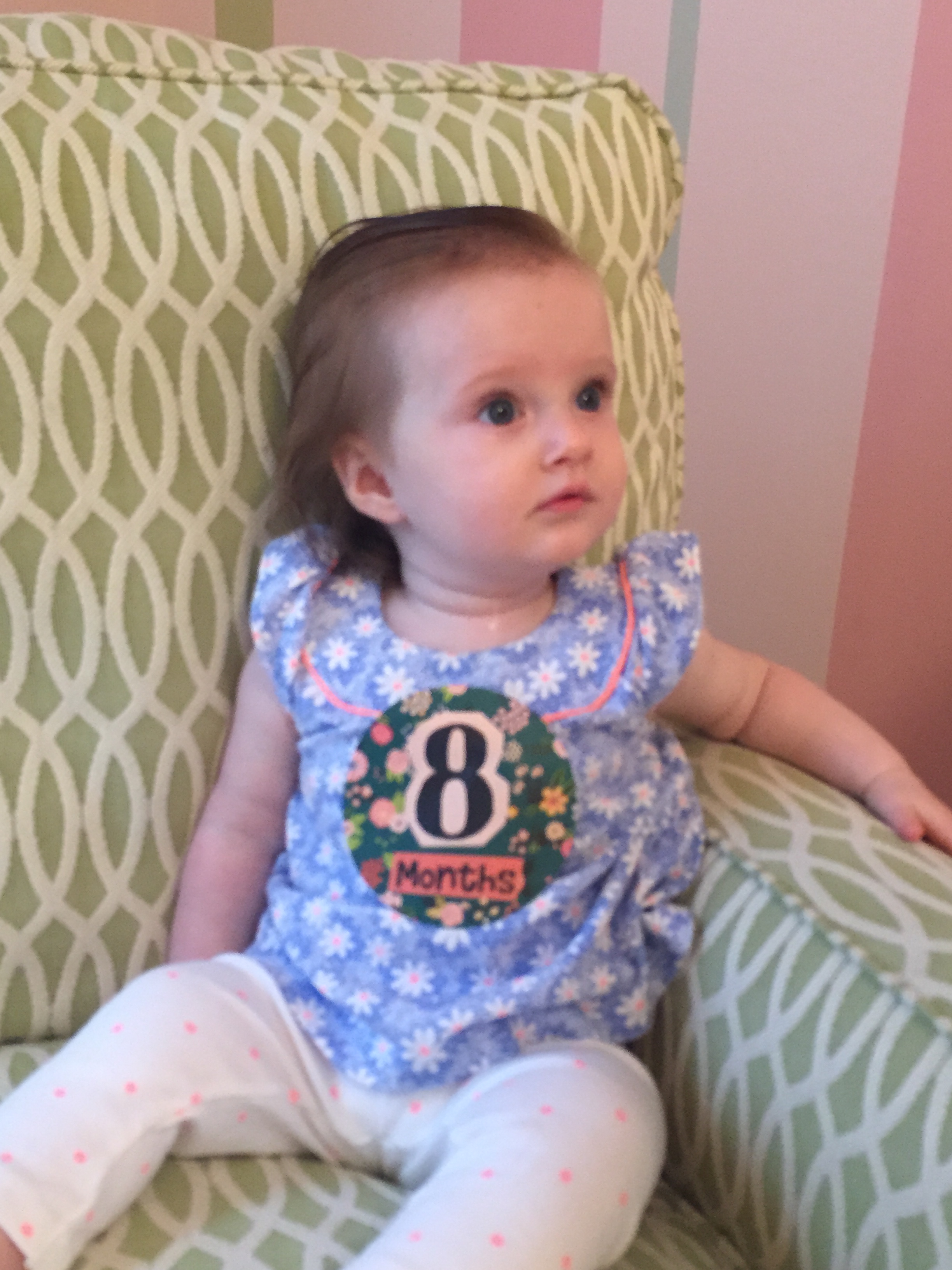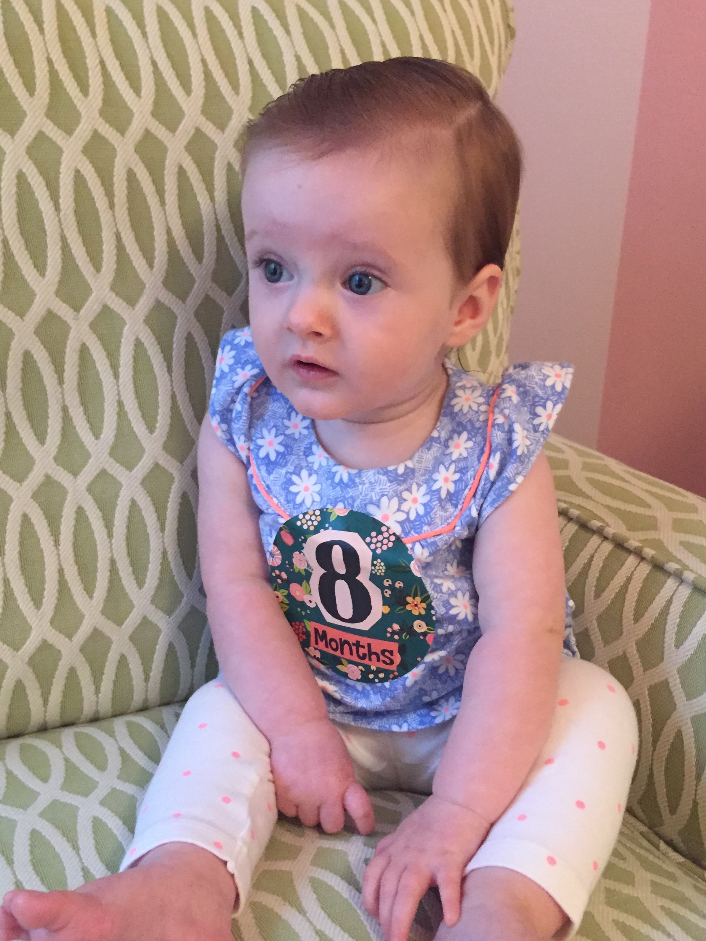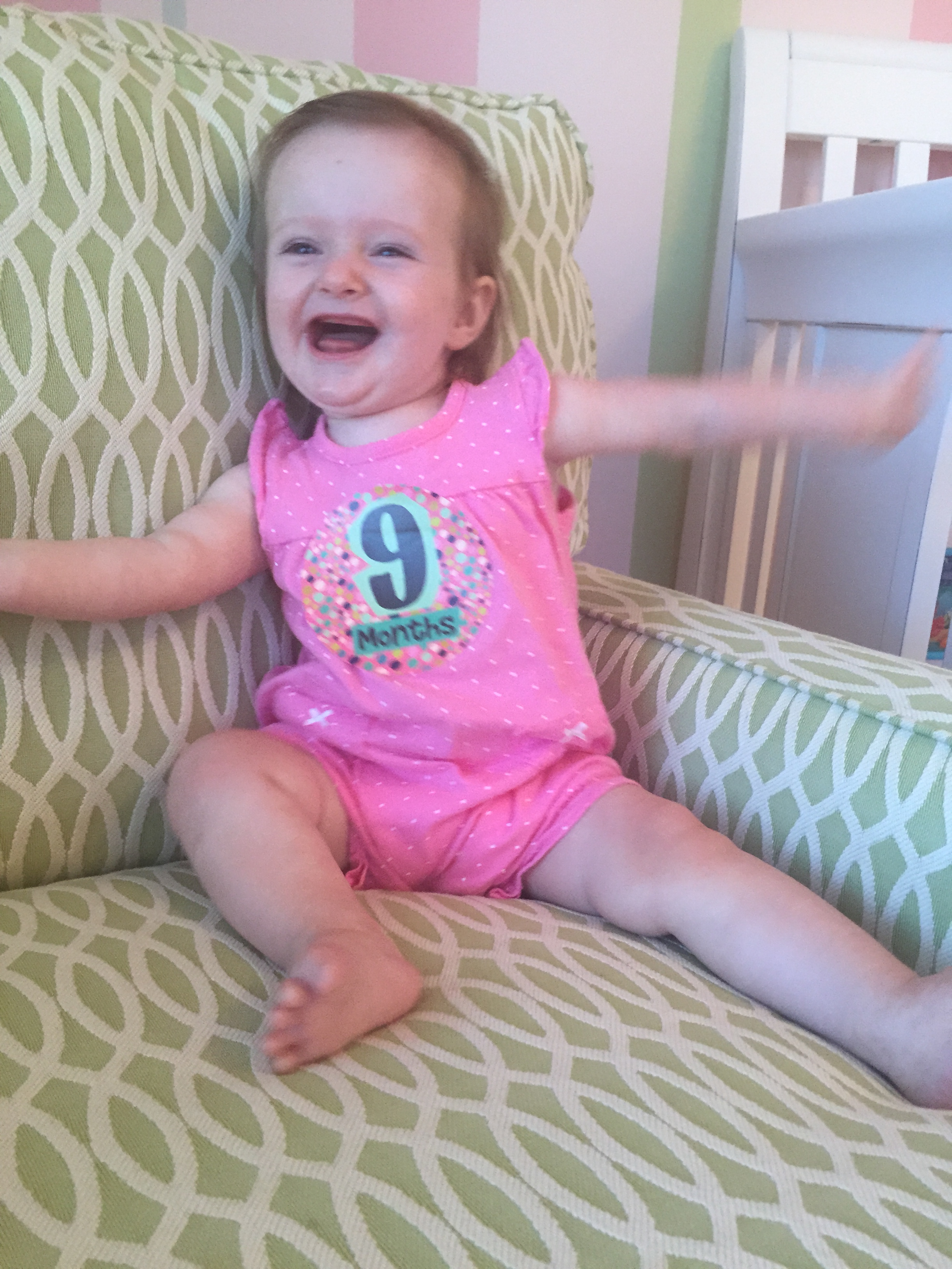 I can’t believe you are nine months old already…you are growing up way too fast!! We had your doctor’s appointment and you did very well. Dr. Wong was impressed that you are eating all solid foods and sleeping through the night. He said you are perfect. You had one vaccine and didn’t even cry when you got the shot…both the nurse and myself were shocked. You are such a tough little girl 🙂