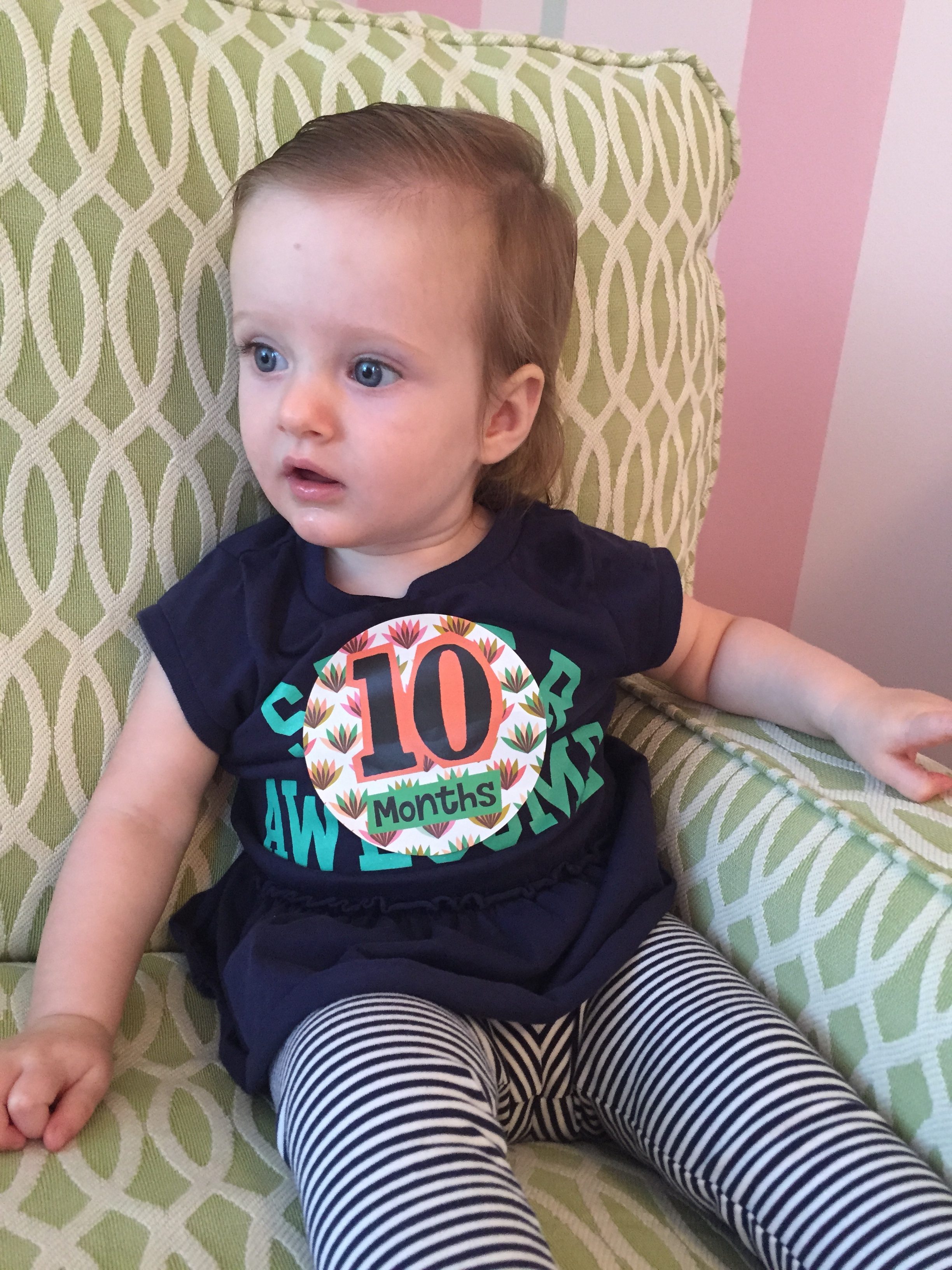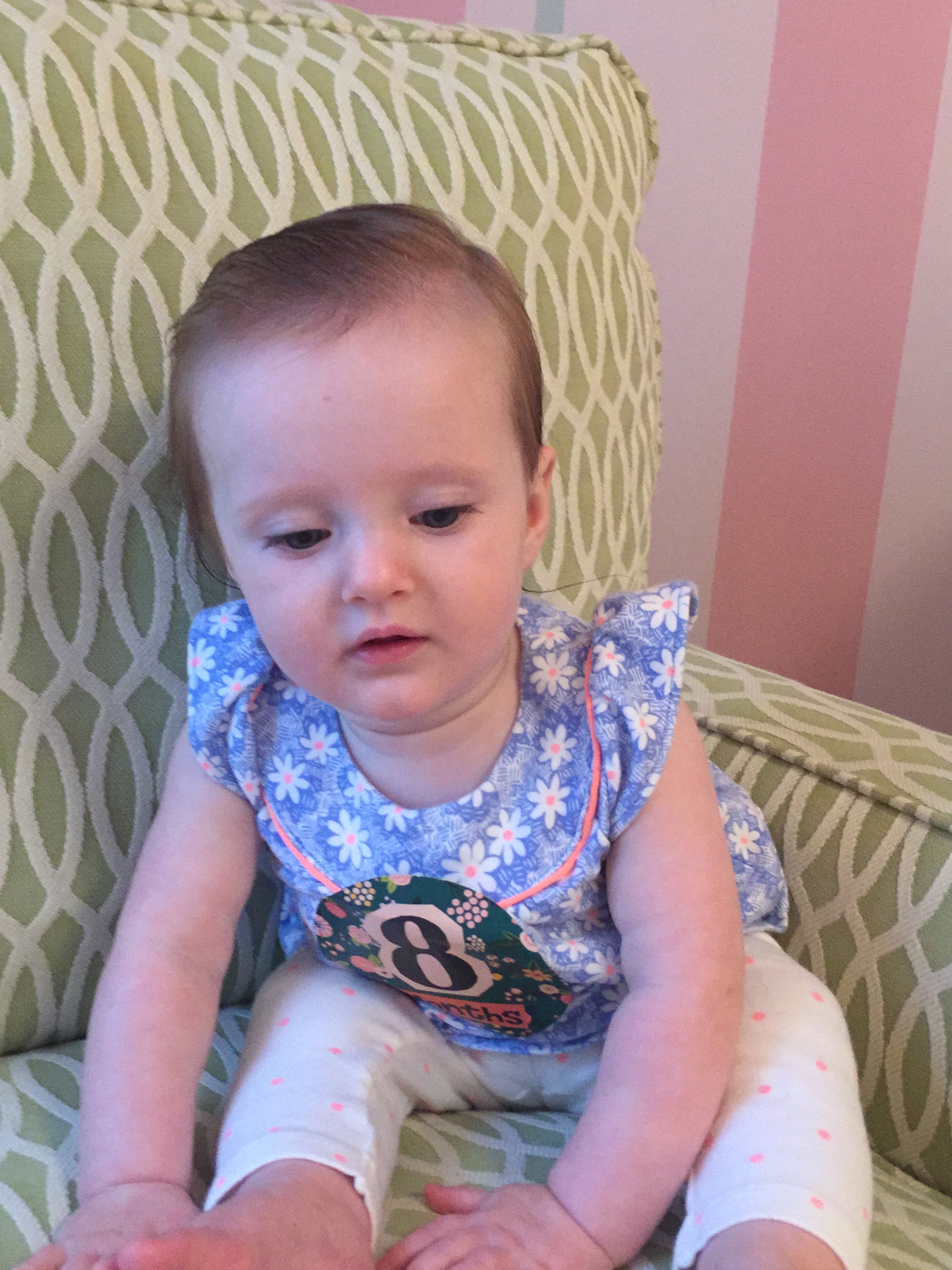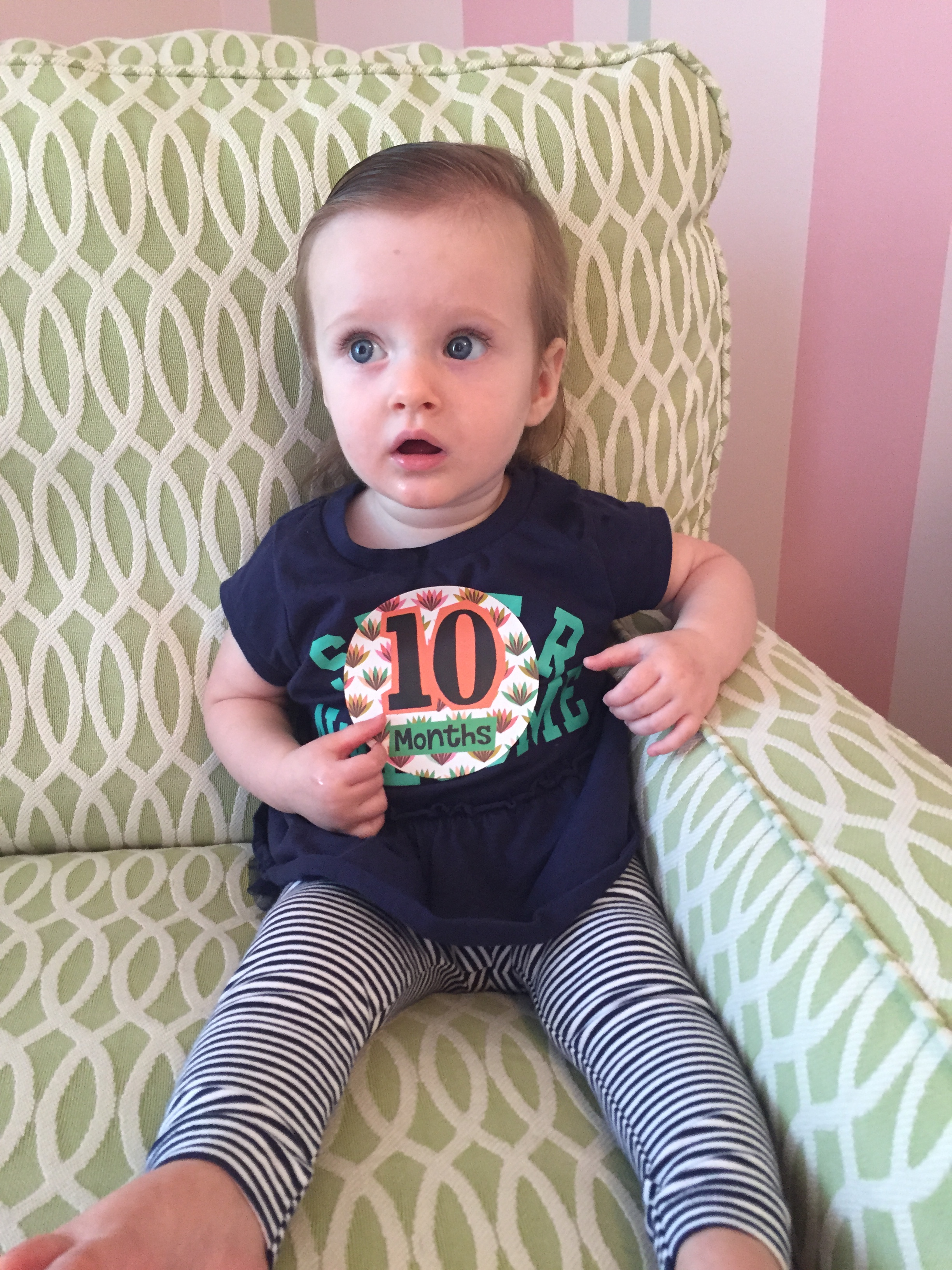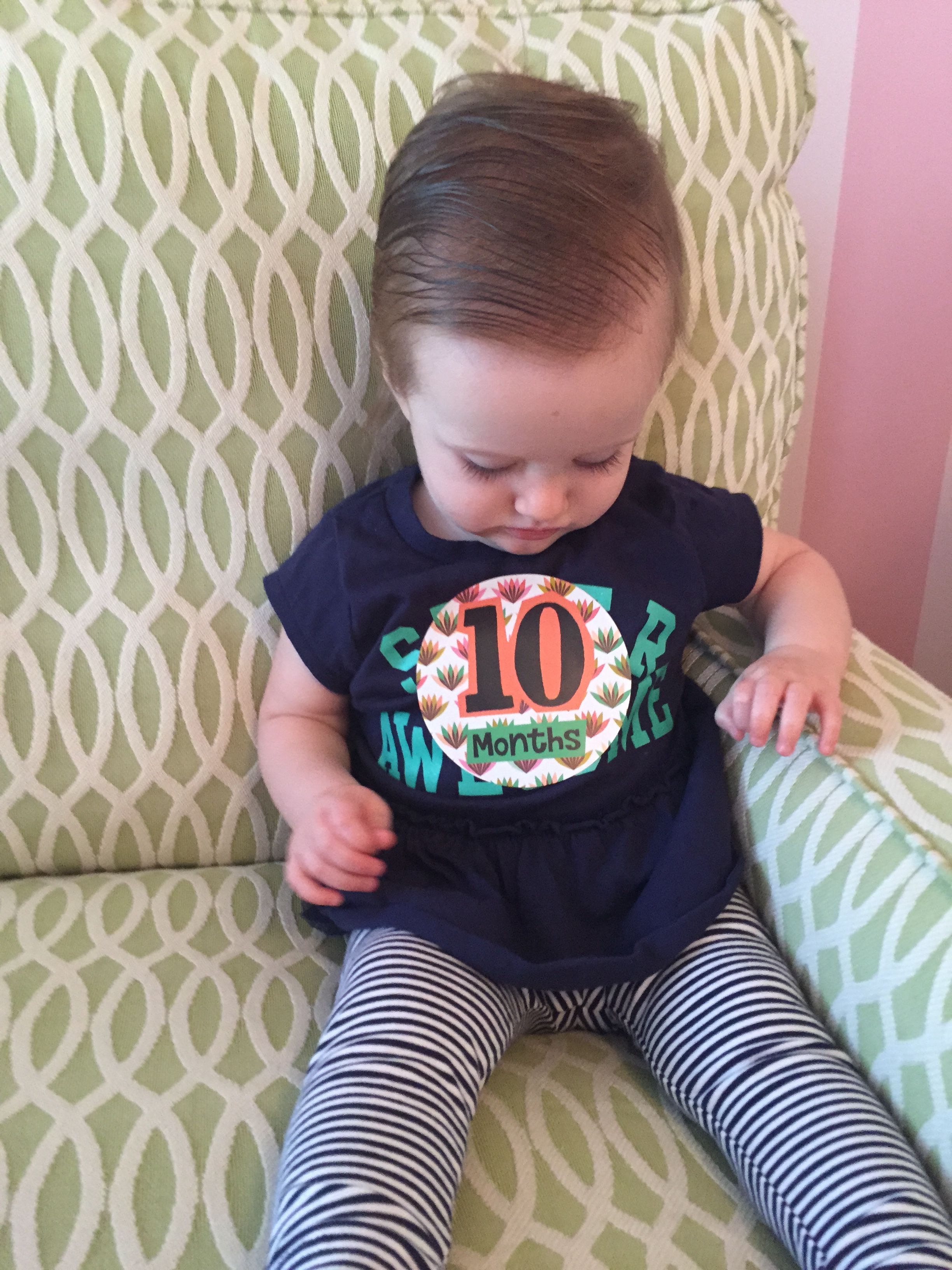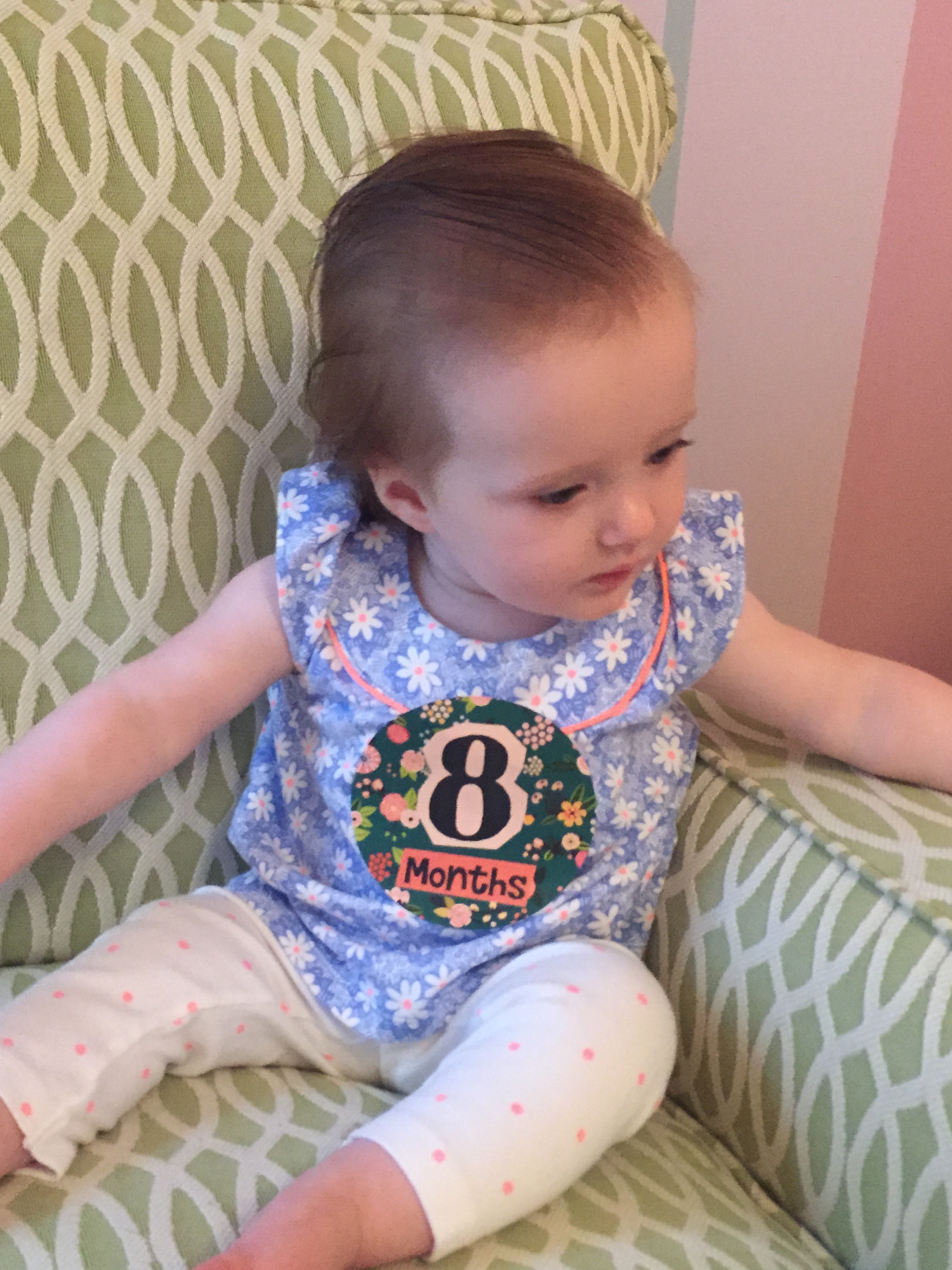 I can’t believe you are nine months old already…you are growing up way too fast!! We had your doctor’s appointment and you did very well. Dr. Wong was impressed that you are eating all solid foods and sleeping through the night. He said you are perfect. You had one vaccine and didn’t even cry when you got the shot…both the nurse and myself were shocked. You are such a tough little girl 🙂