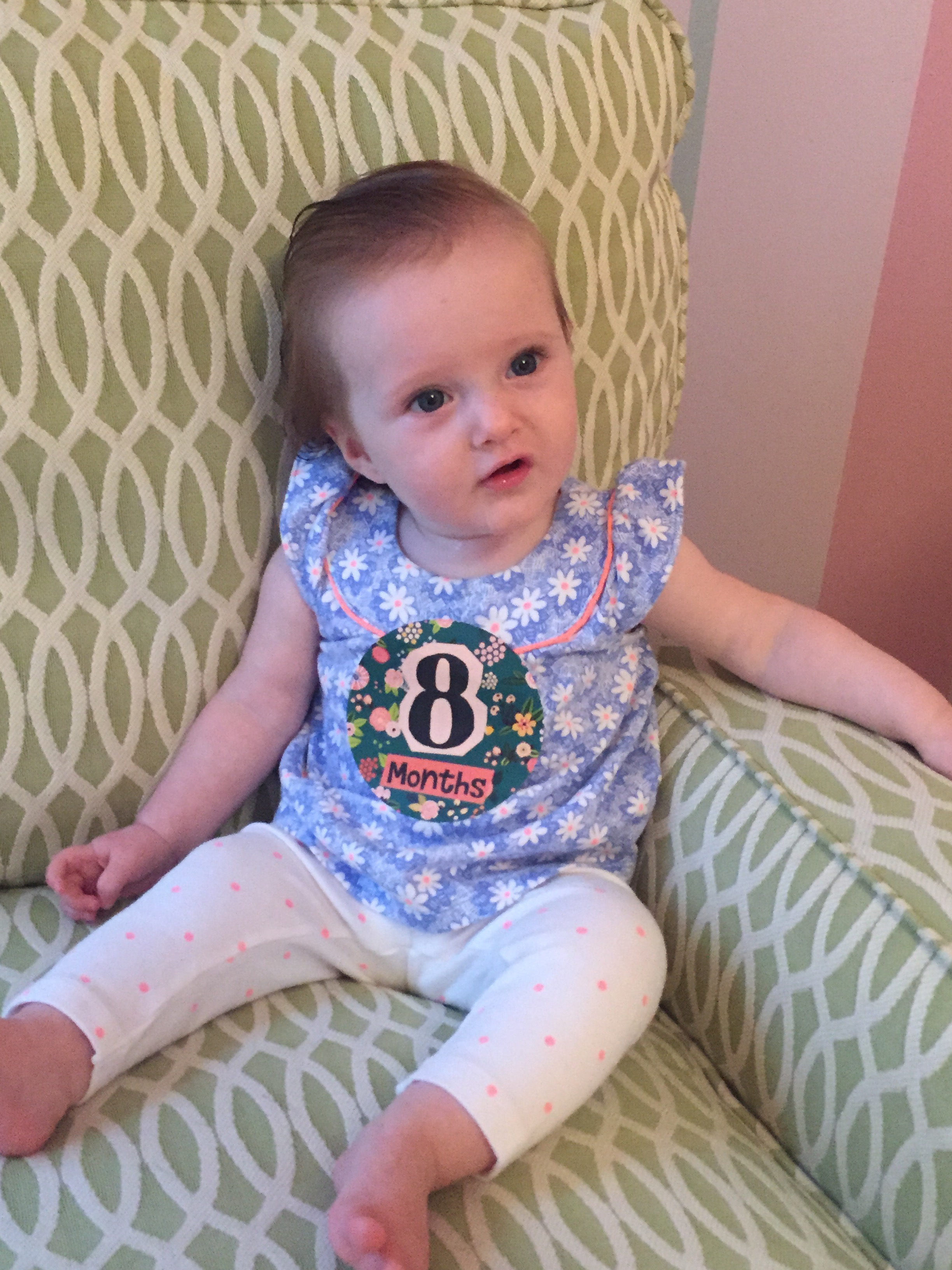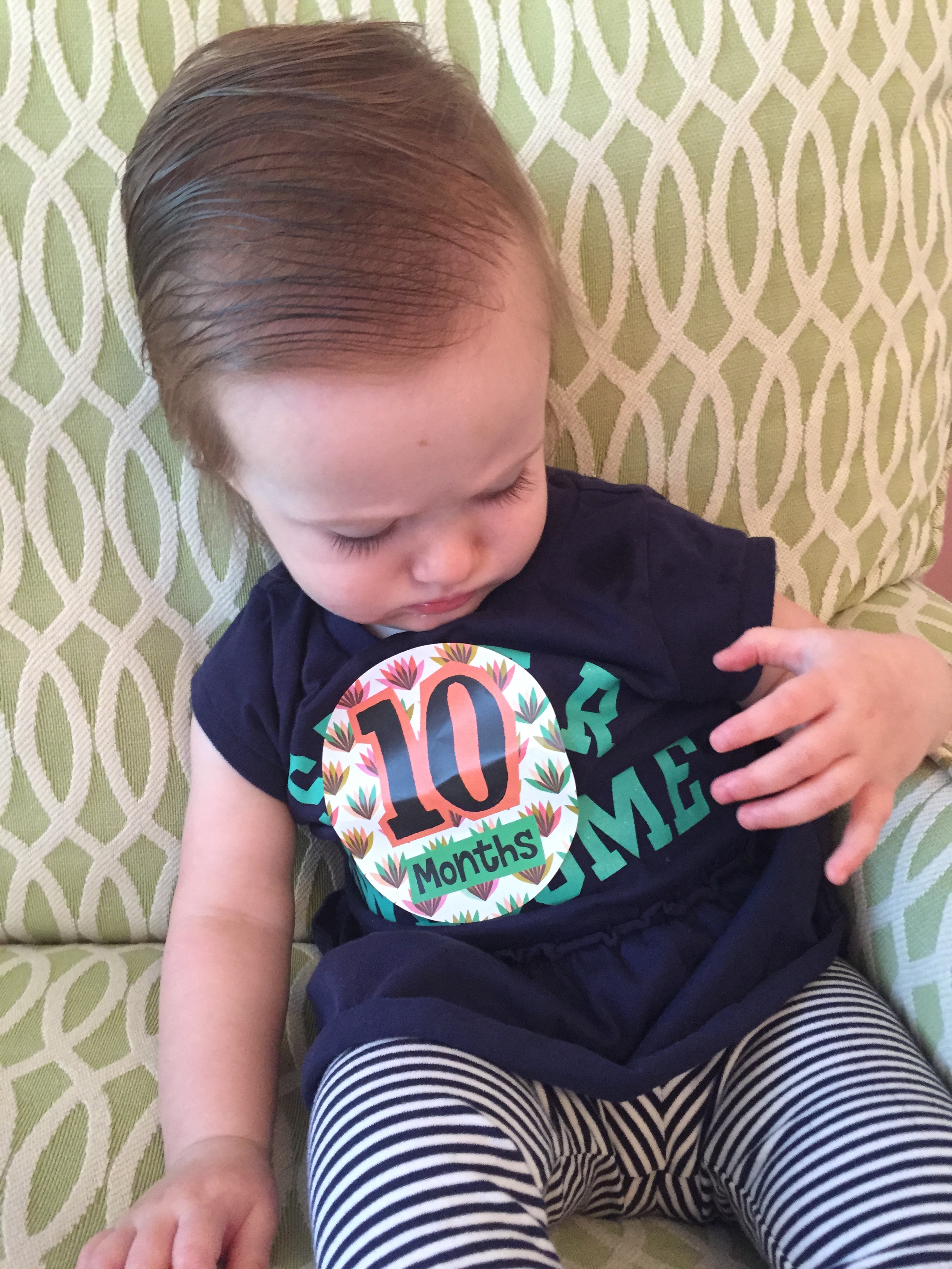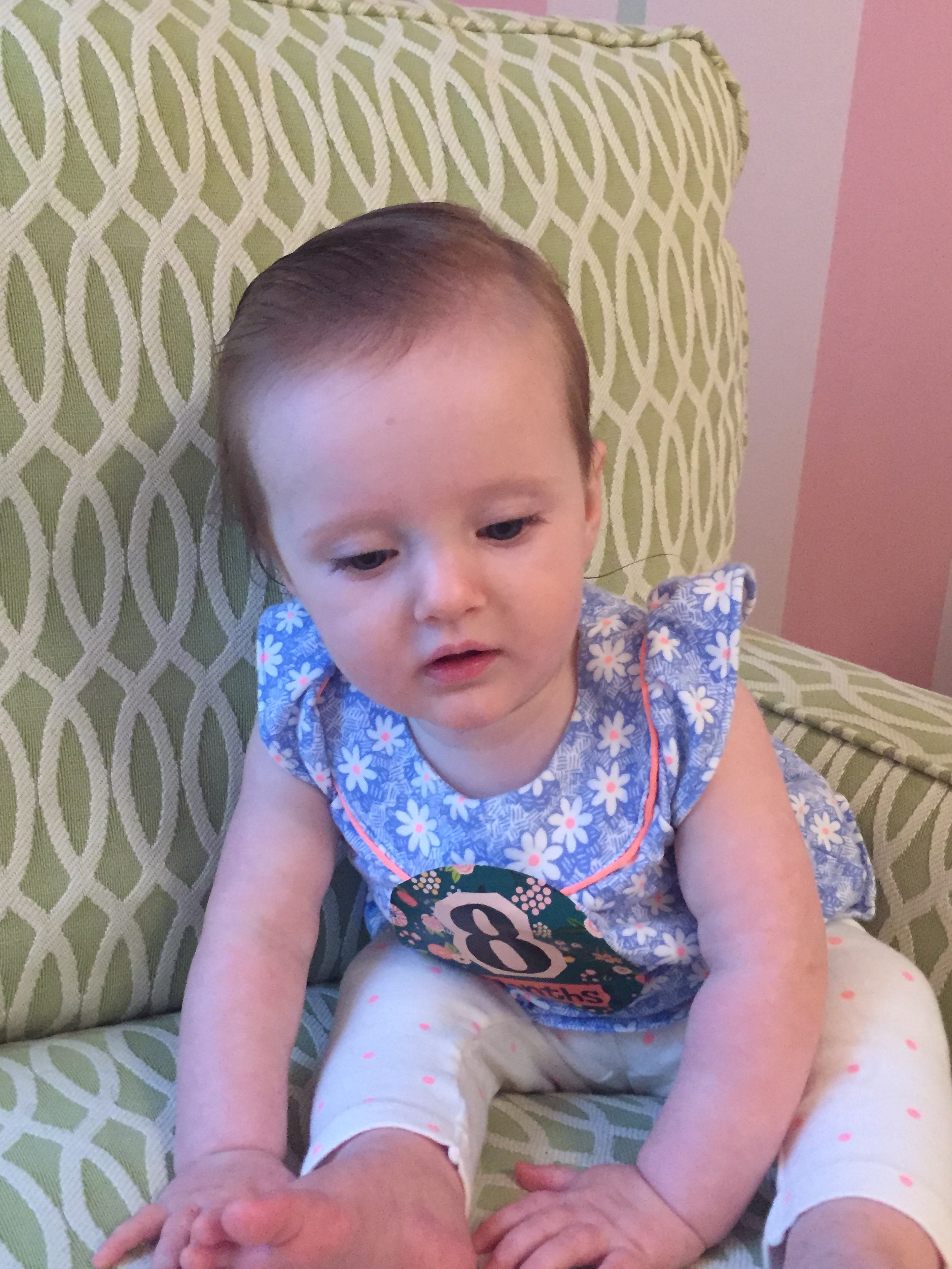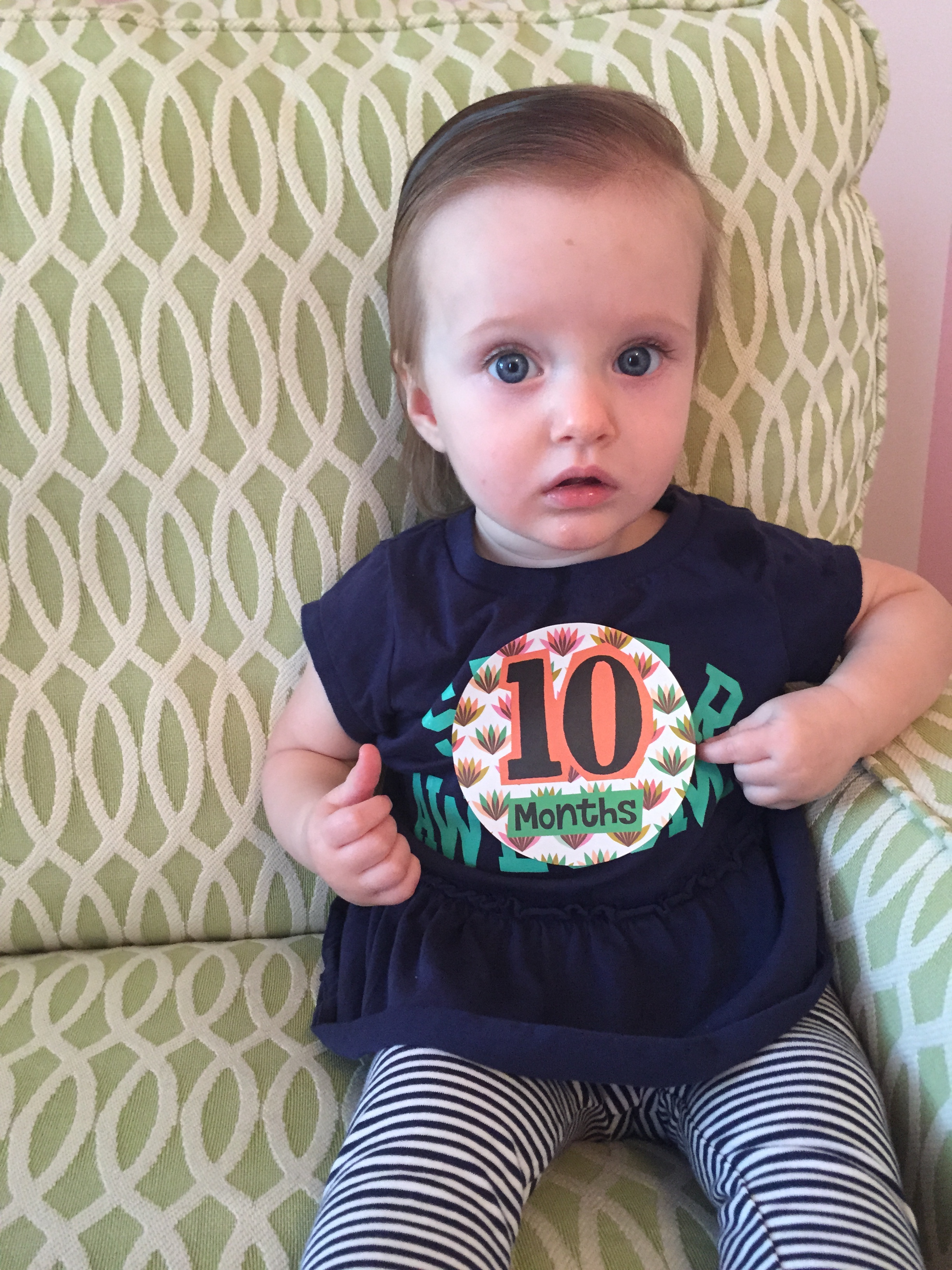 I can’t believe you are nine months old already…you are growing up way too fast!! We had your doctor’s appointment and you did very well. Dr. Wong was impressed that you are eating all solid foods and sleeping through the night. He said you are perfect. You had one vaccine and didn’t even cry when you got the shot…both the nurse and myself were shocked. You are such a tough little girl 🙂