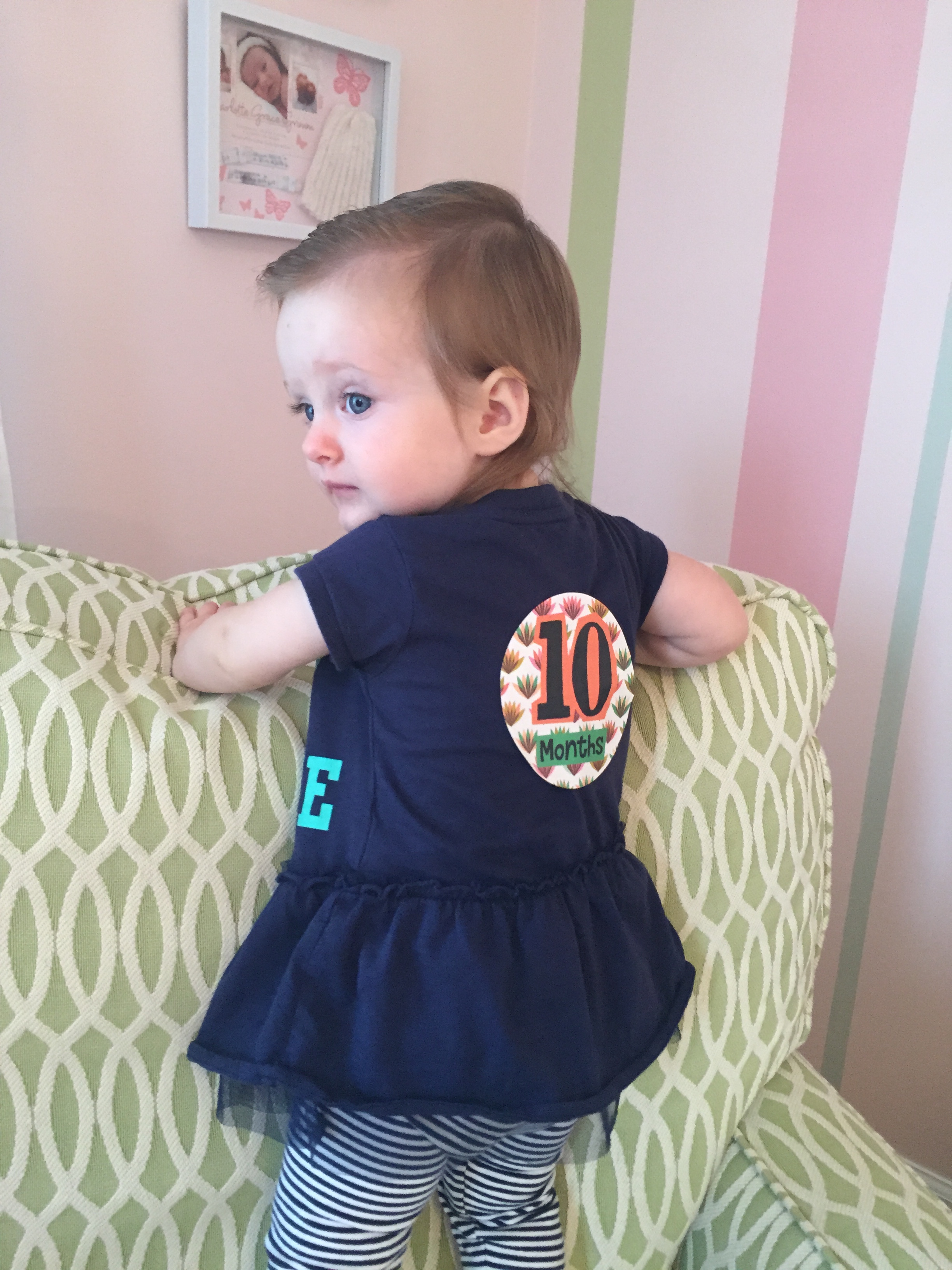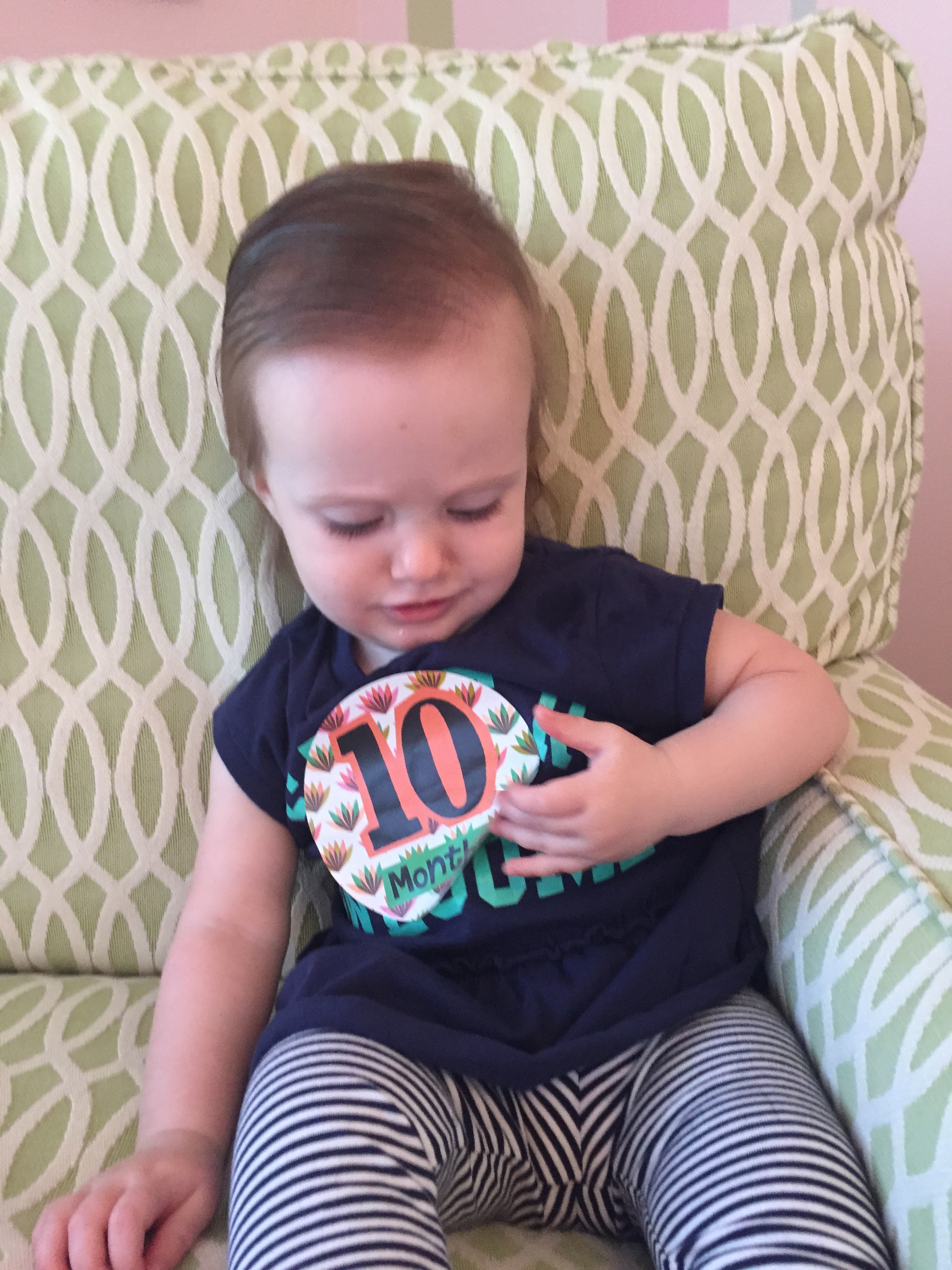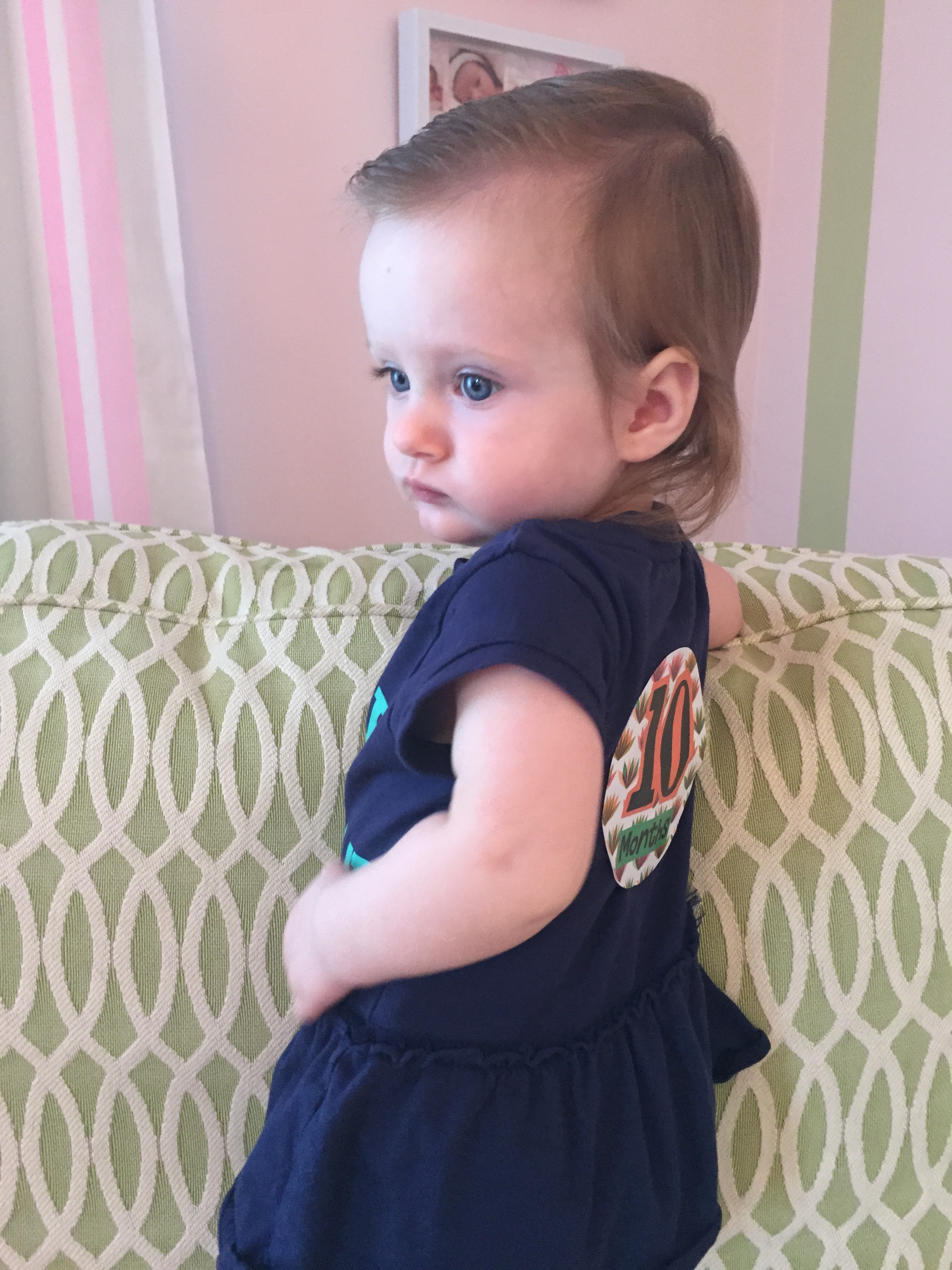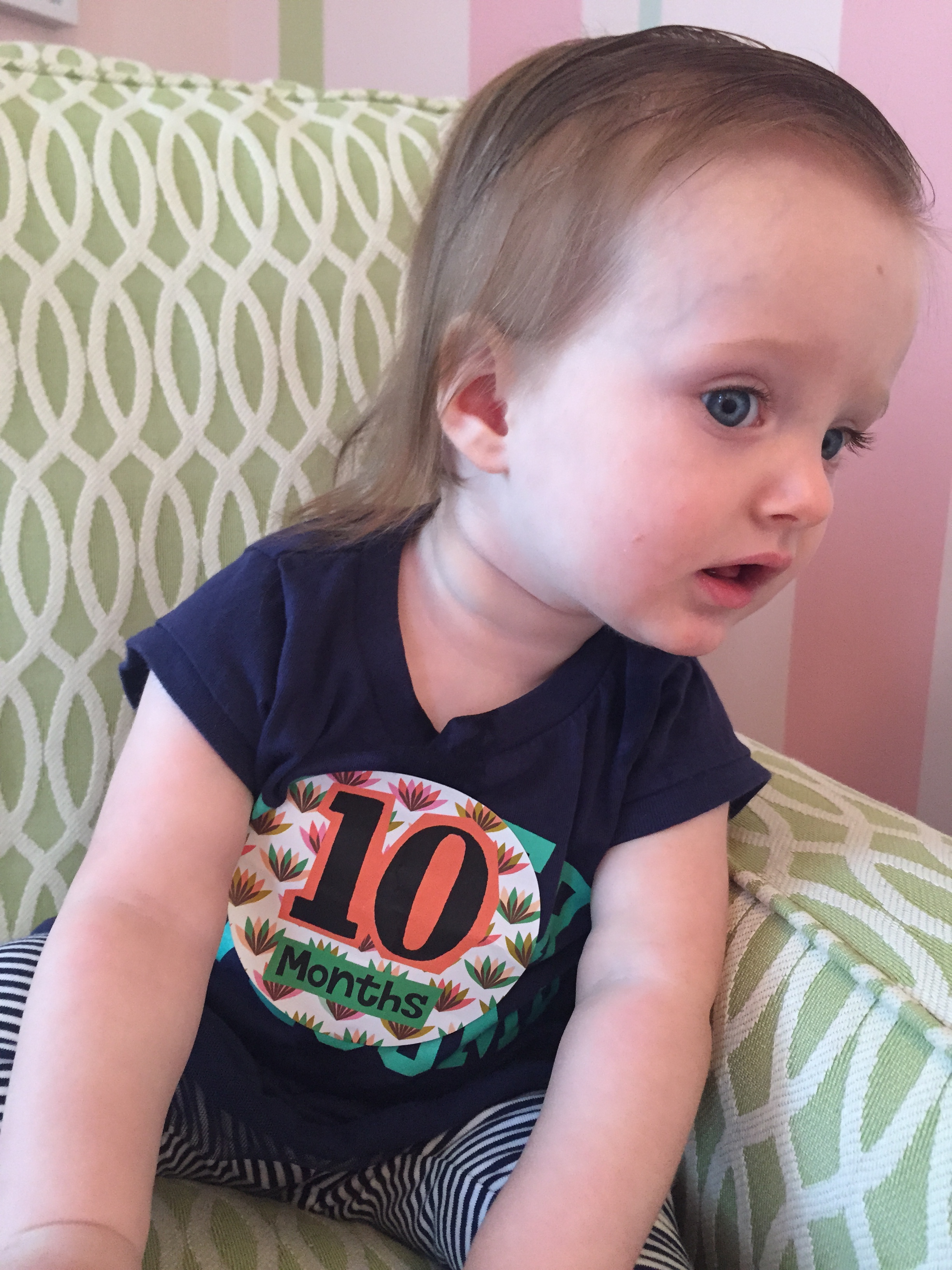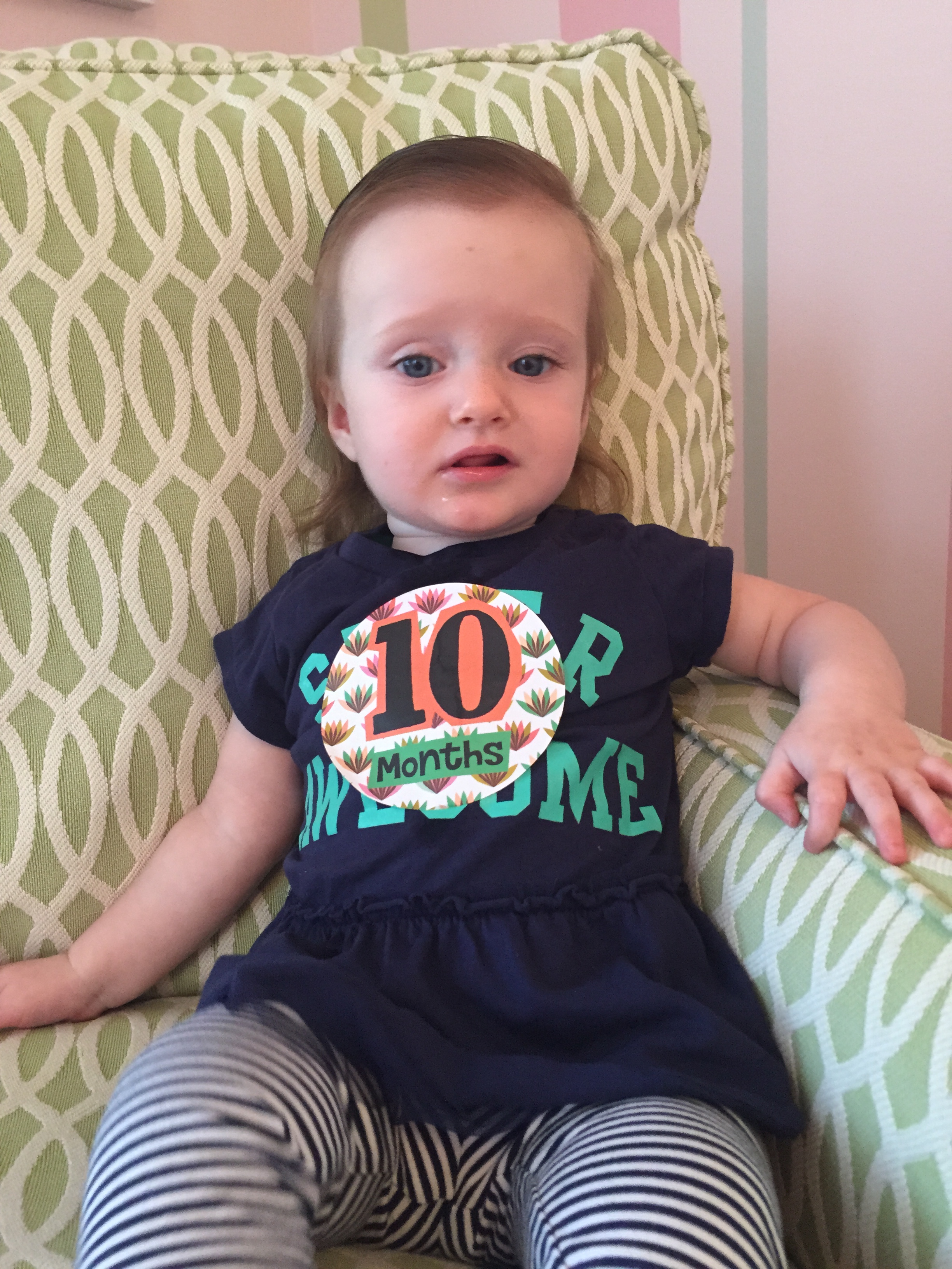 I can’t believe you are nine months old already…you are growing up way too fast!! We had your doctor’s appointment and you did very well. Dr. Wong was impressed that you are eating all solid foods and sleeping through the night. He said you are perfect. You had one vaccine and didn’t even cry when you got the shot…both the nurse and myself were shocked. You are such a tough little girl 🙂