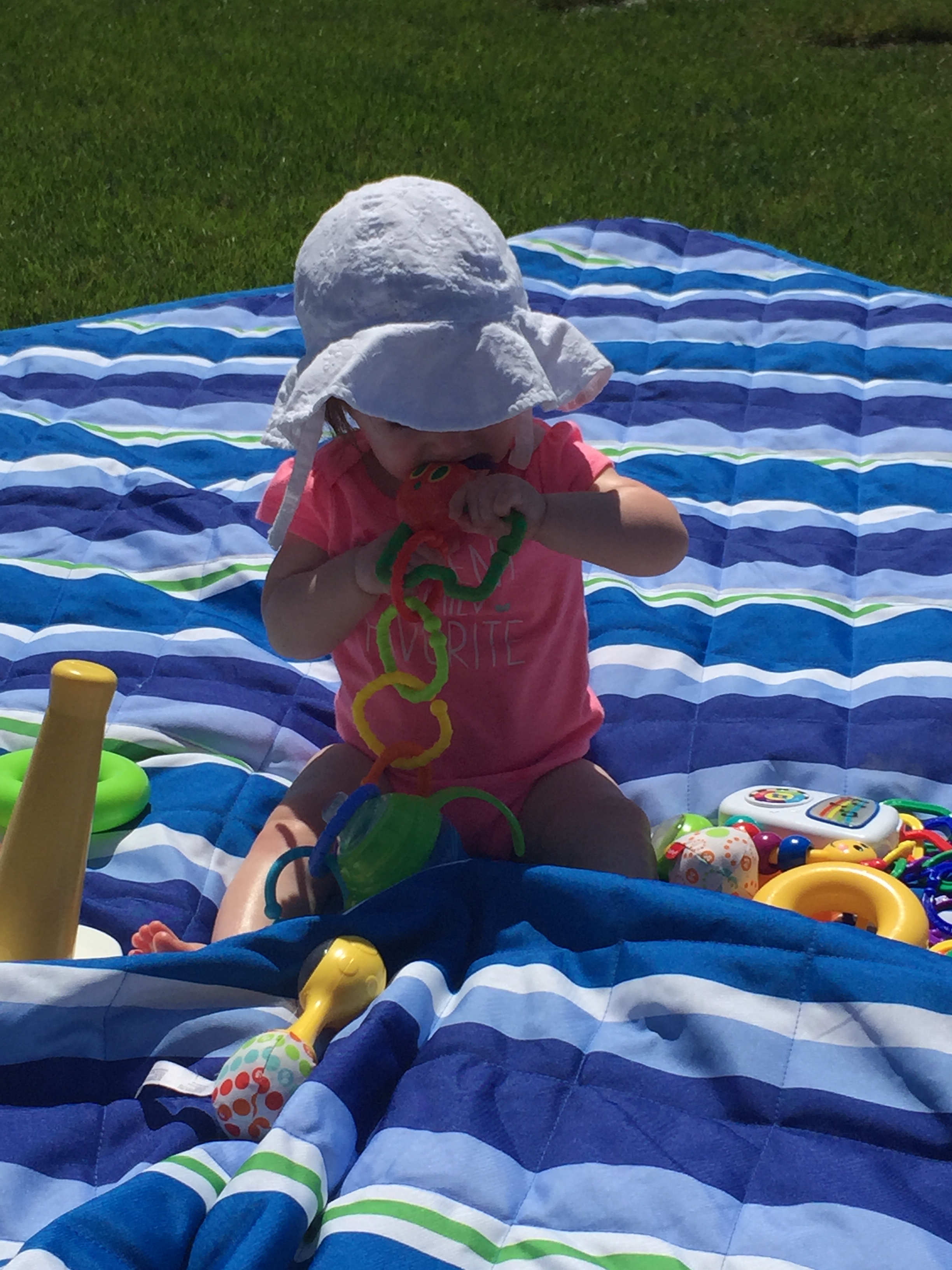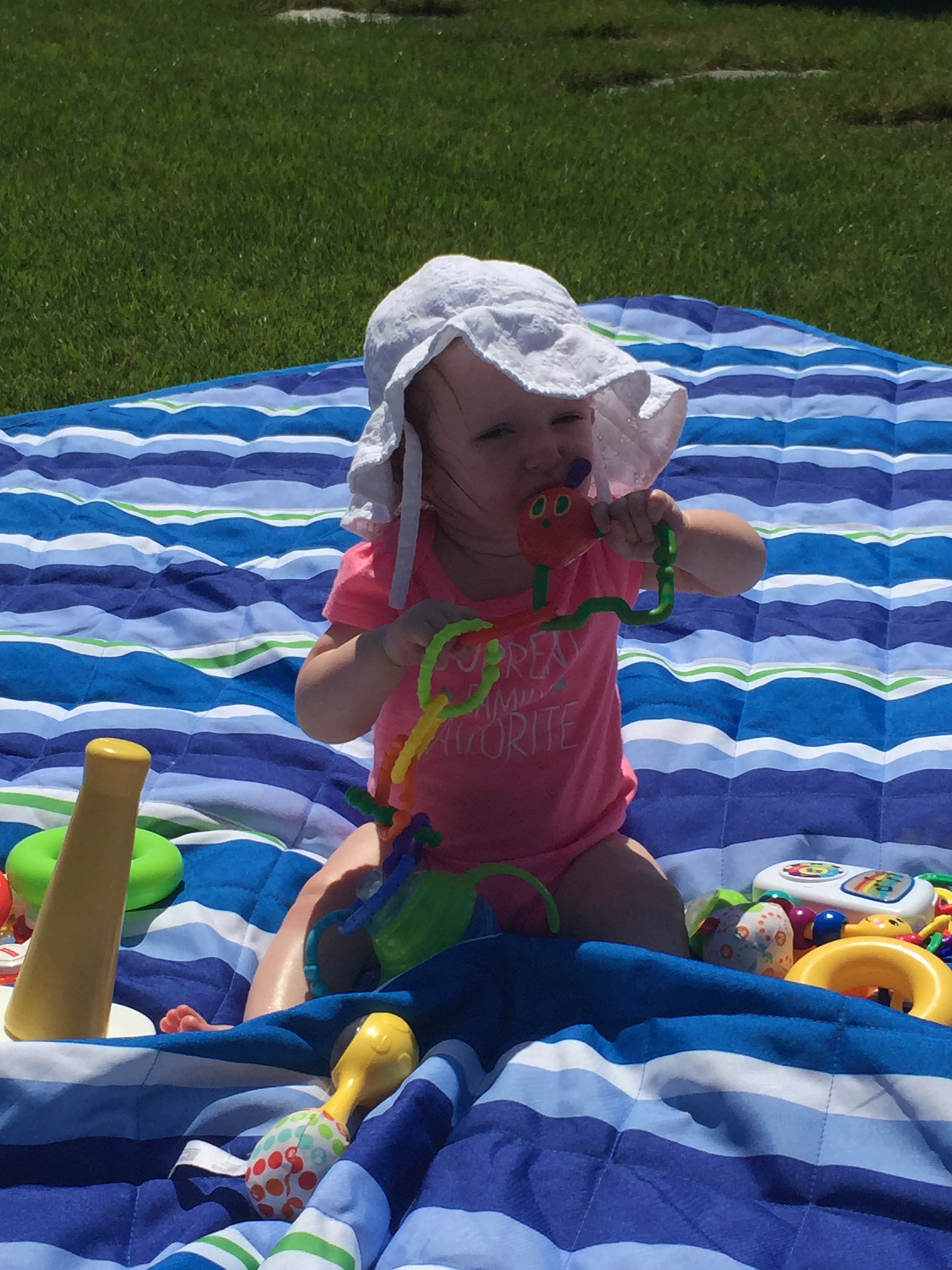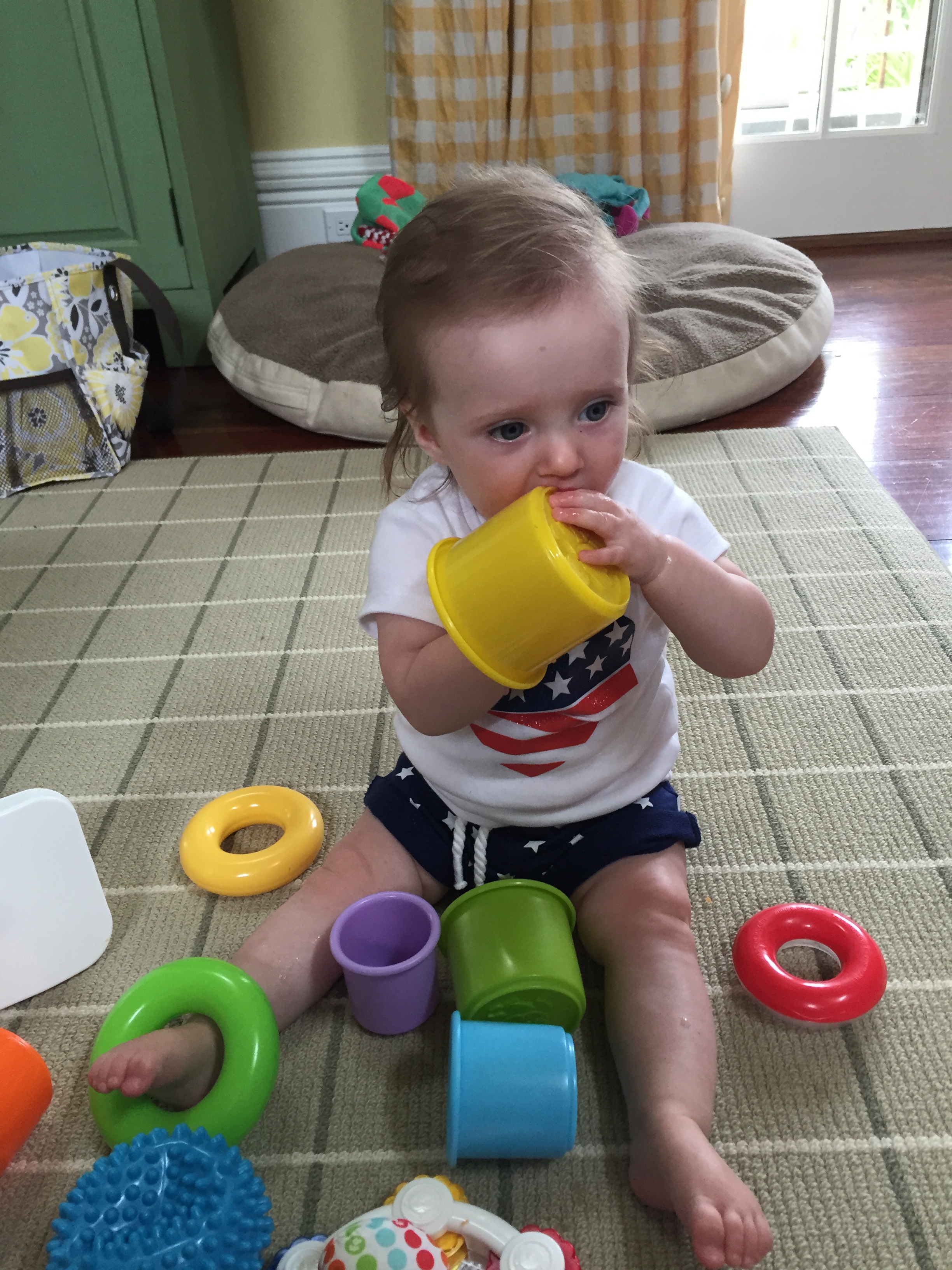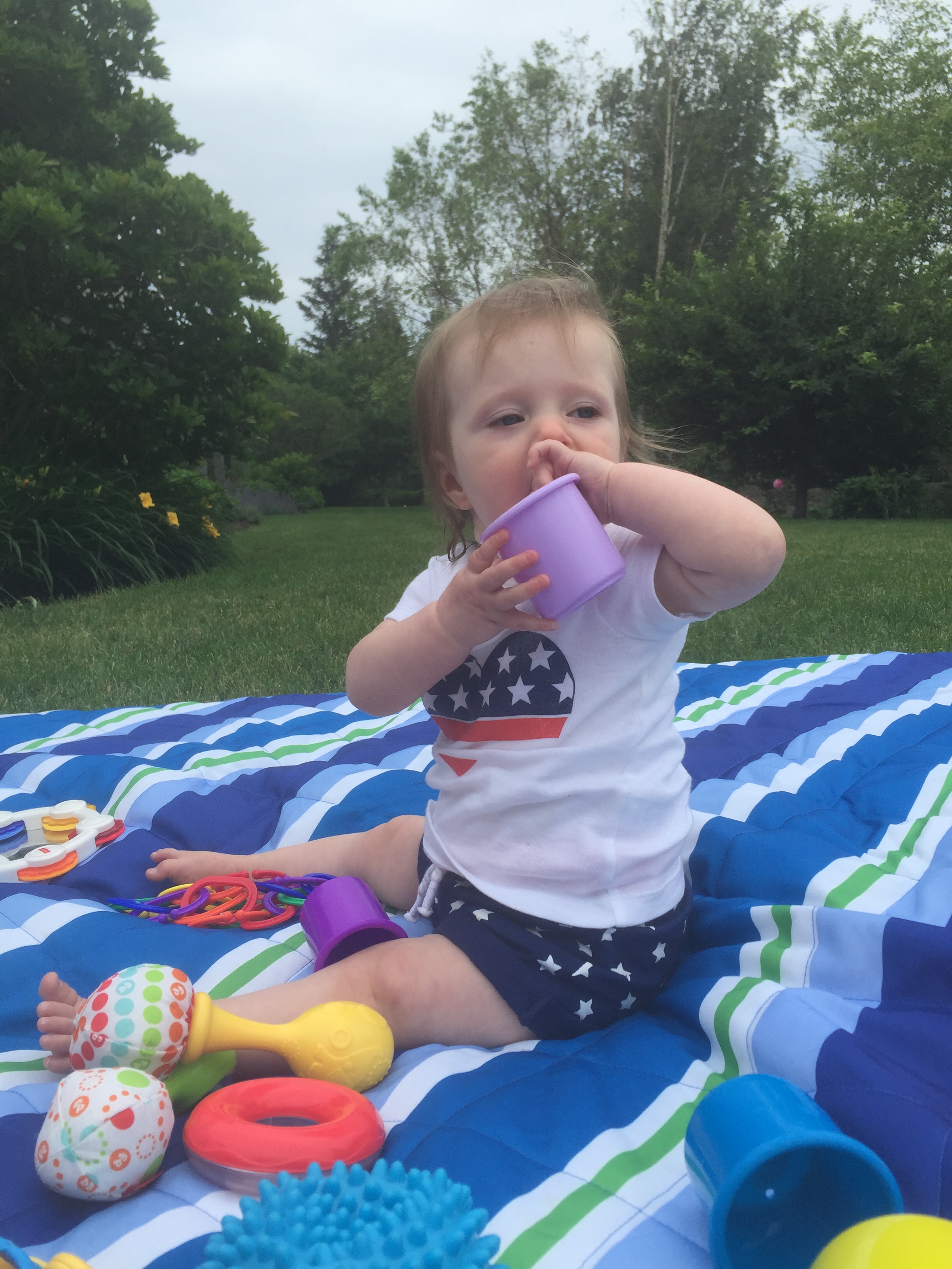 We traveled to Raleigh to finally meet your Aunt Treecie! She had waited a long time to meet you and we had a blast. We stayed at Aunt Treecie’s with Sergey, and their two Jack Russell Terriers – Misty and Jack. It was also Father’s Day Weekend – you celebrated your first one with Daddy – he loves you so much. Our trip was fun yet hot – it was record temps in the high 90’s but you survived and we went to the pool to cool off. We also visited with Nana, Aunt Jeanine, Aunt Katie and your cousin Brycen who were down for the week. We will definitely go visit Aunt Treecie again soon!