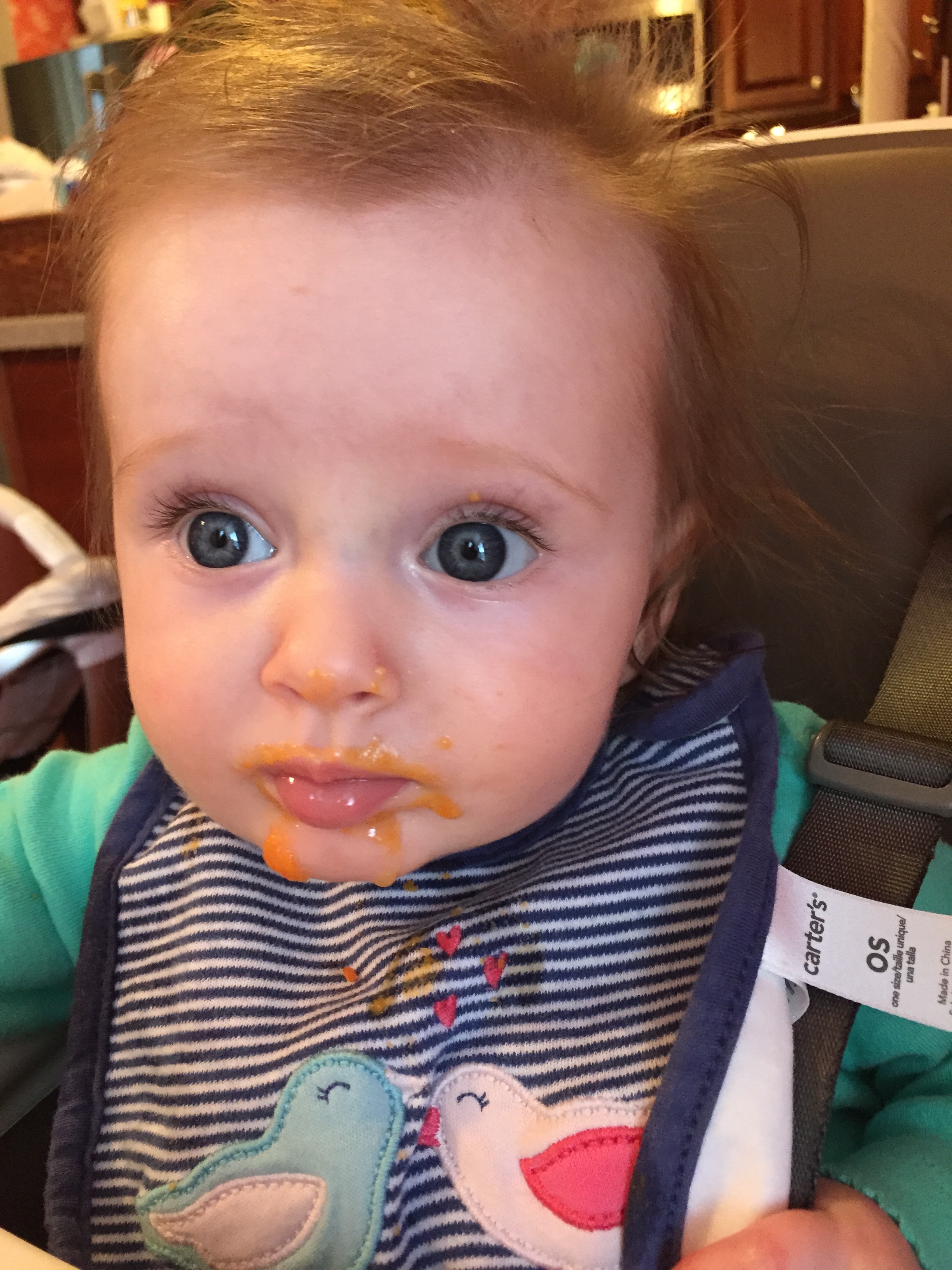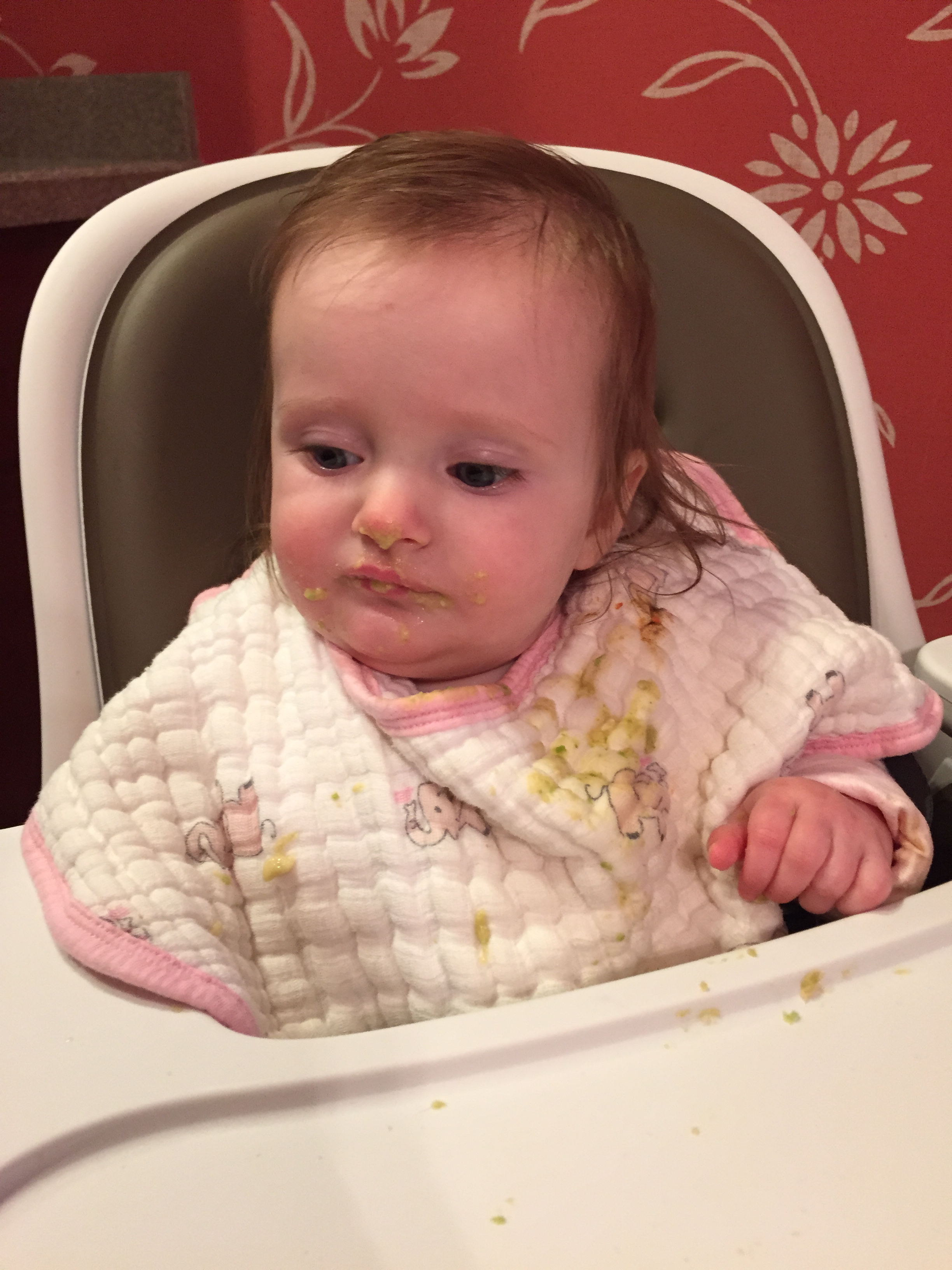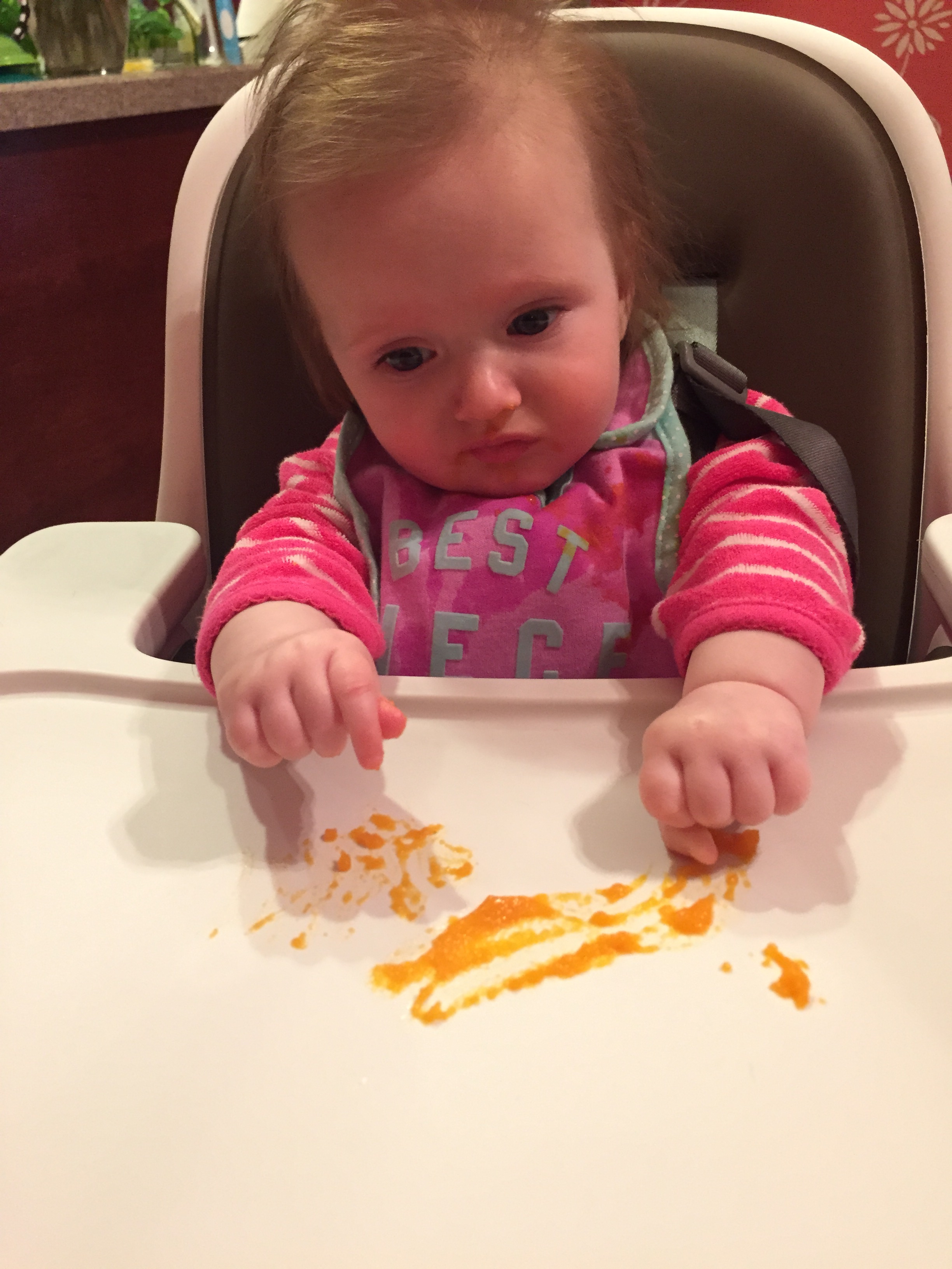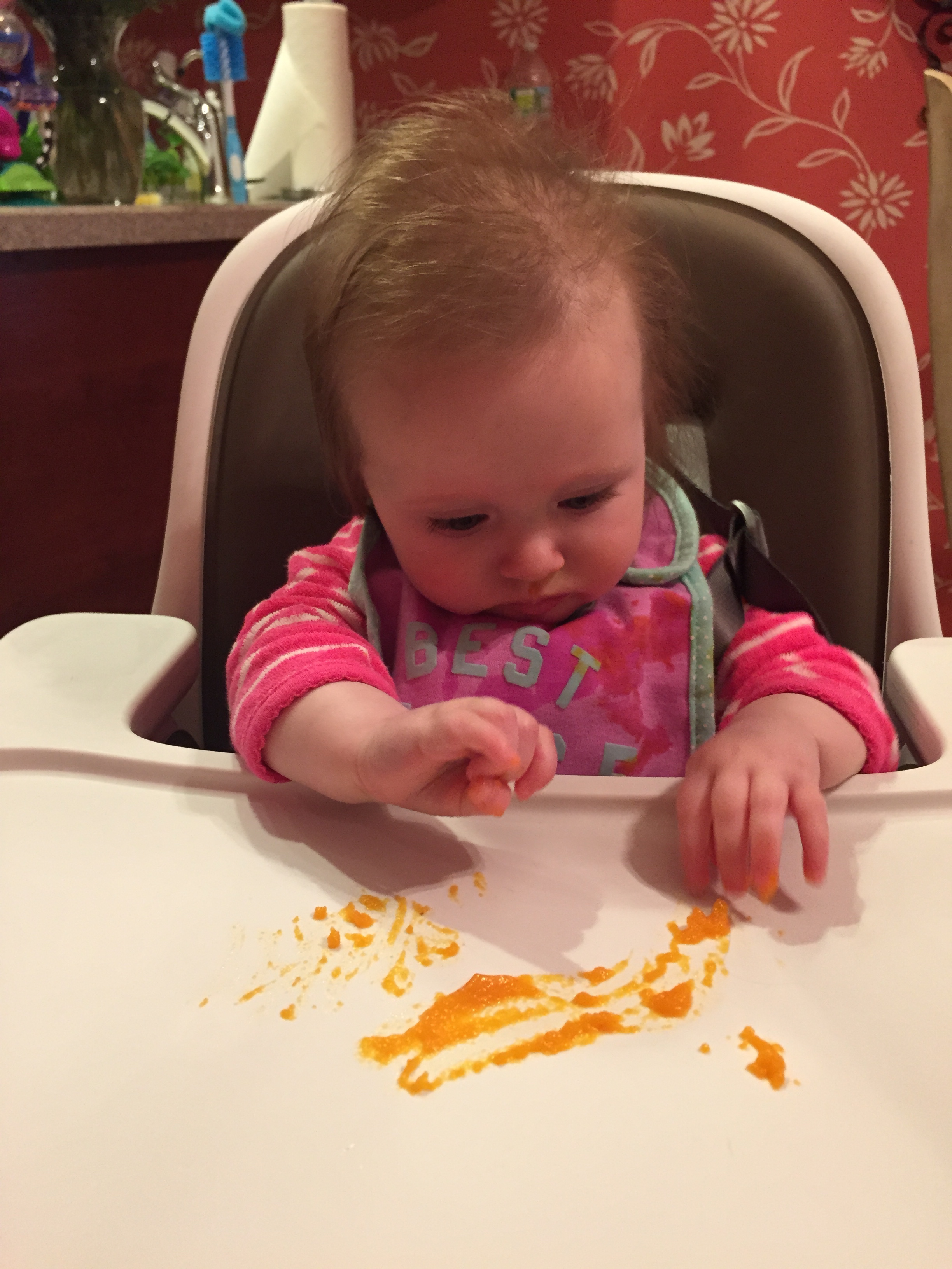 Charlotte we have moved on to fruits and veggies in your diet and boy has it been fun! Mommy has been making you homemade purees which has been pretty simple. The first veggie you tasted was carrots and you HATED them. I know hate is a strong word but you couldn’t spit them out fast enough. Since then we have tried avocado, butternut squash, sweet potato and banana – all of which you love 🙂 Next we are going to try apples and pears which I’m sure you will love! Tyson and Layla sit at the side of your highchair waiting for you to throw them a dropping or two – it won’t be long before you are feeding them your food.