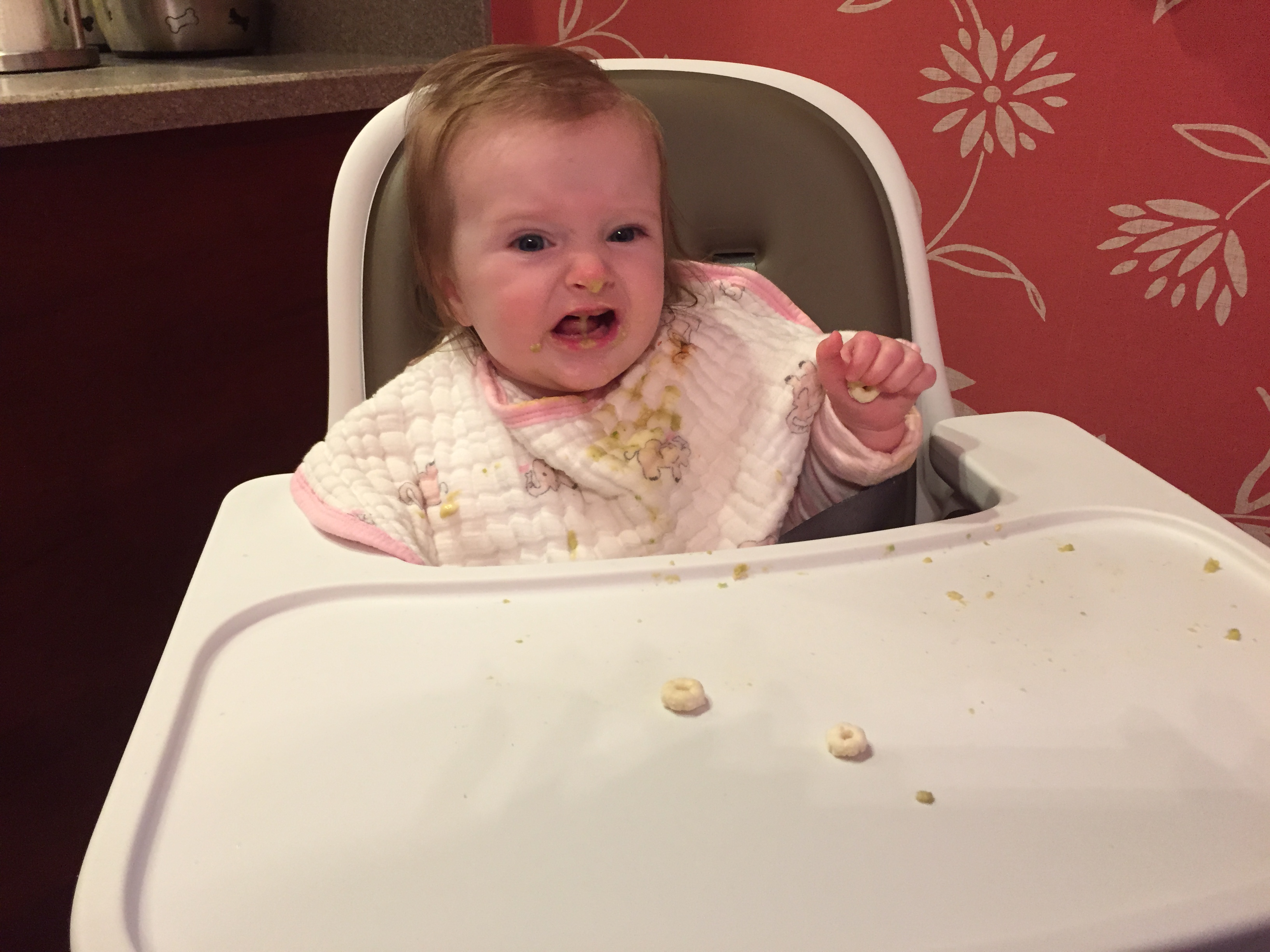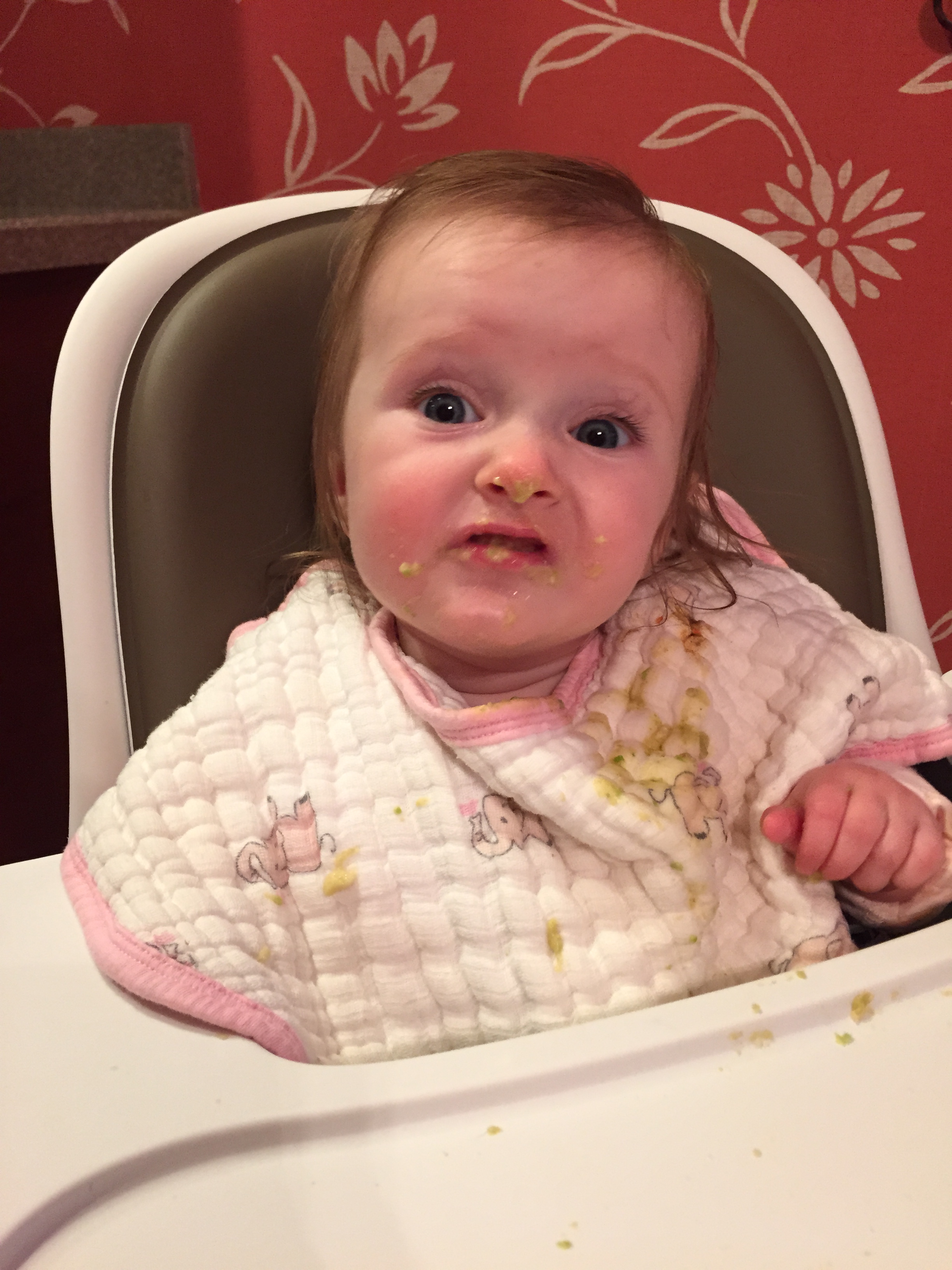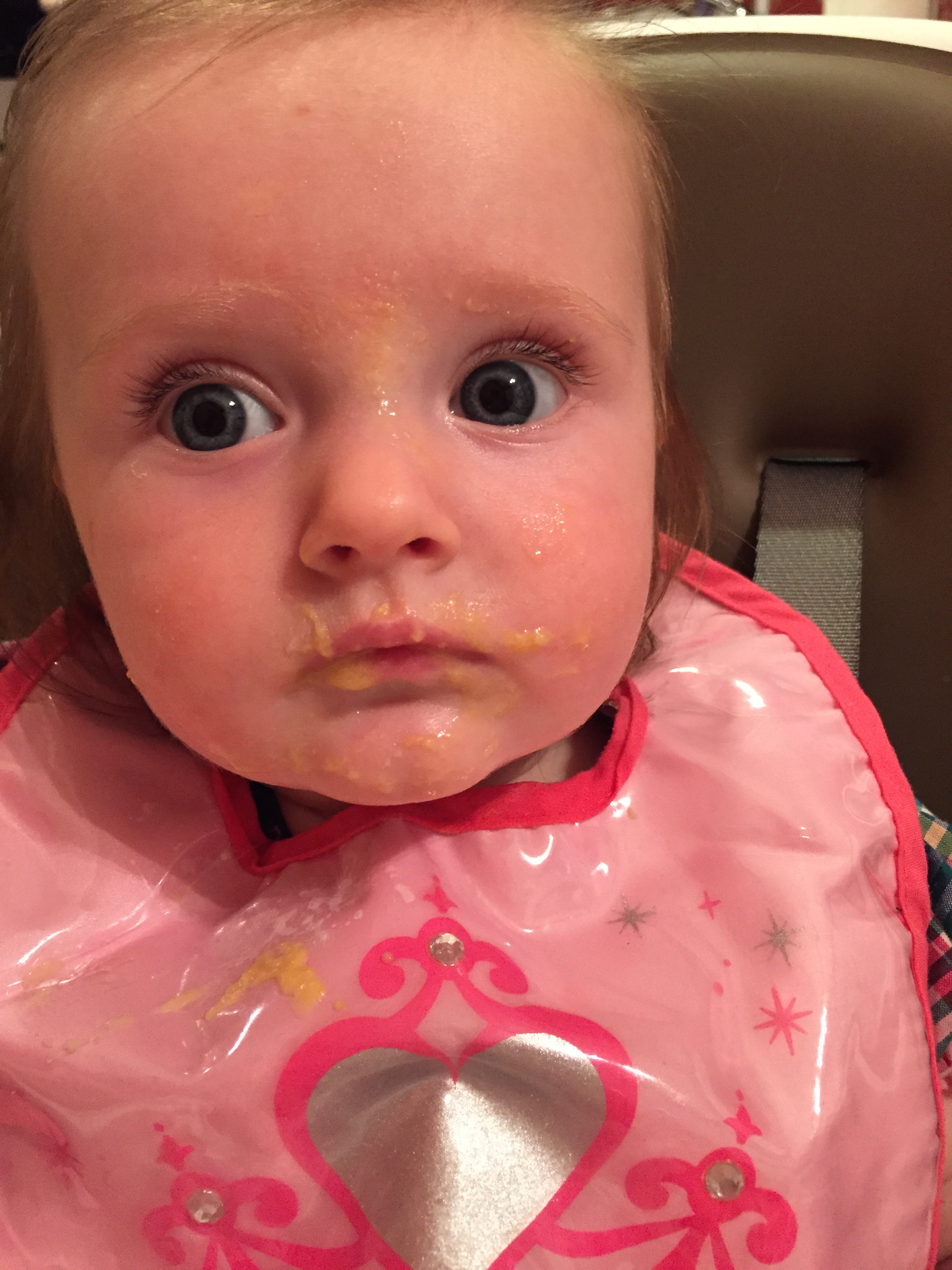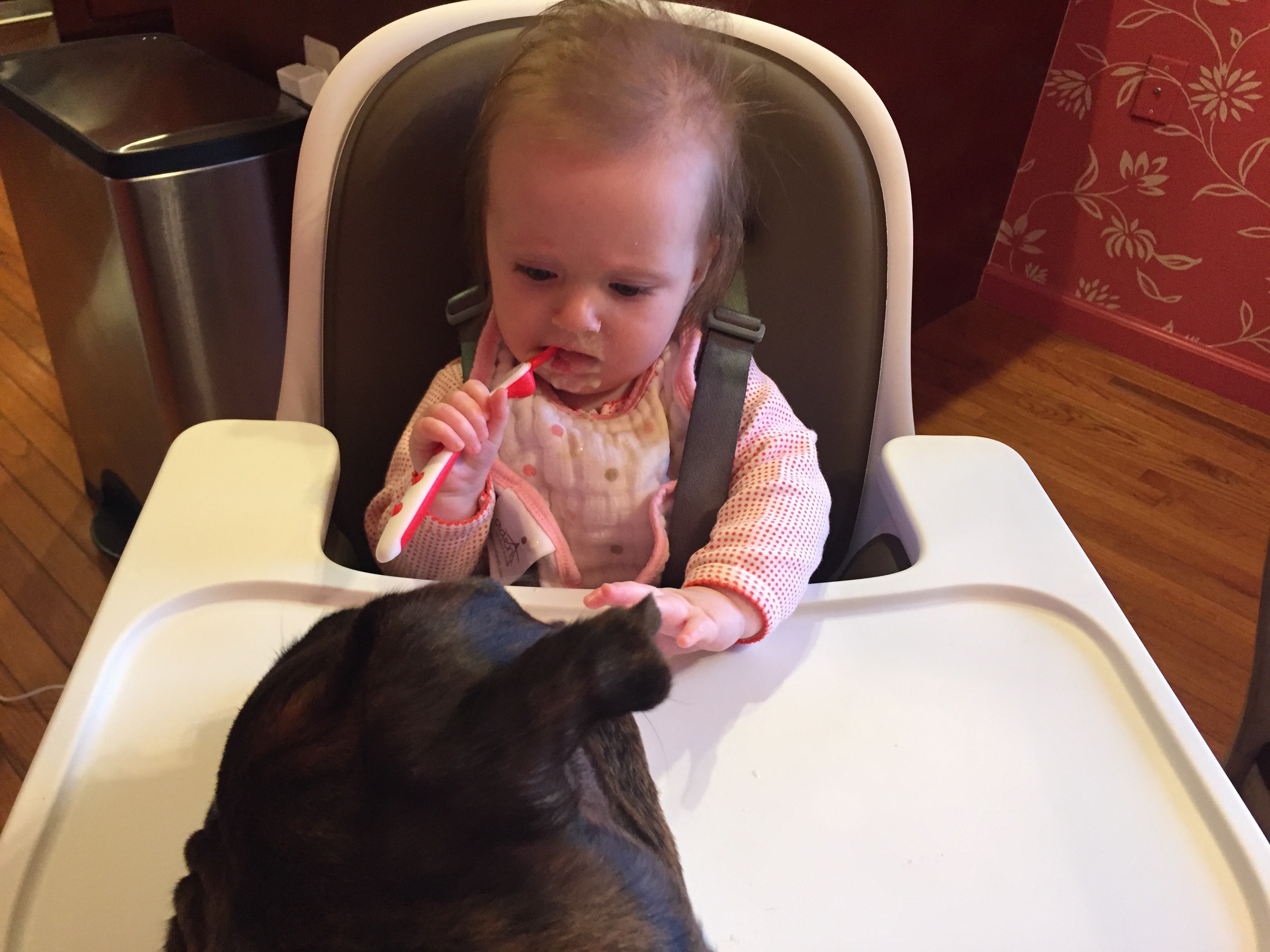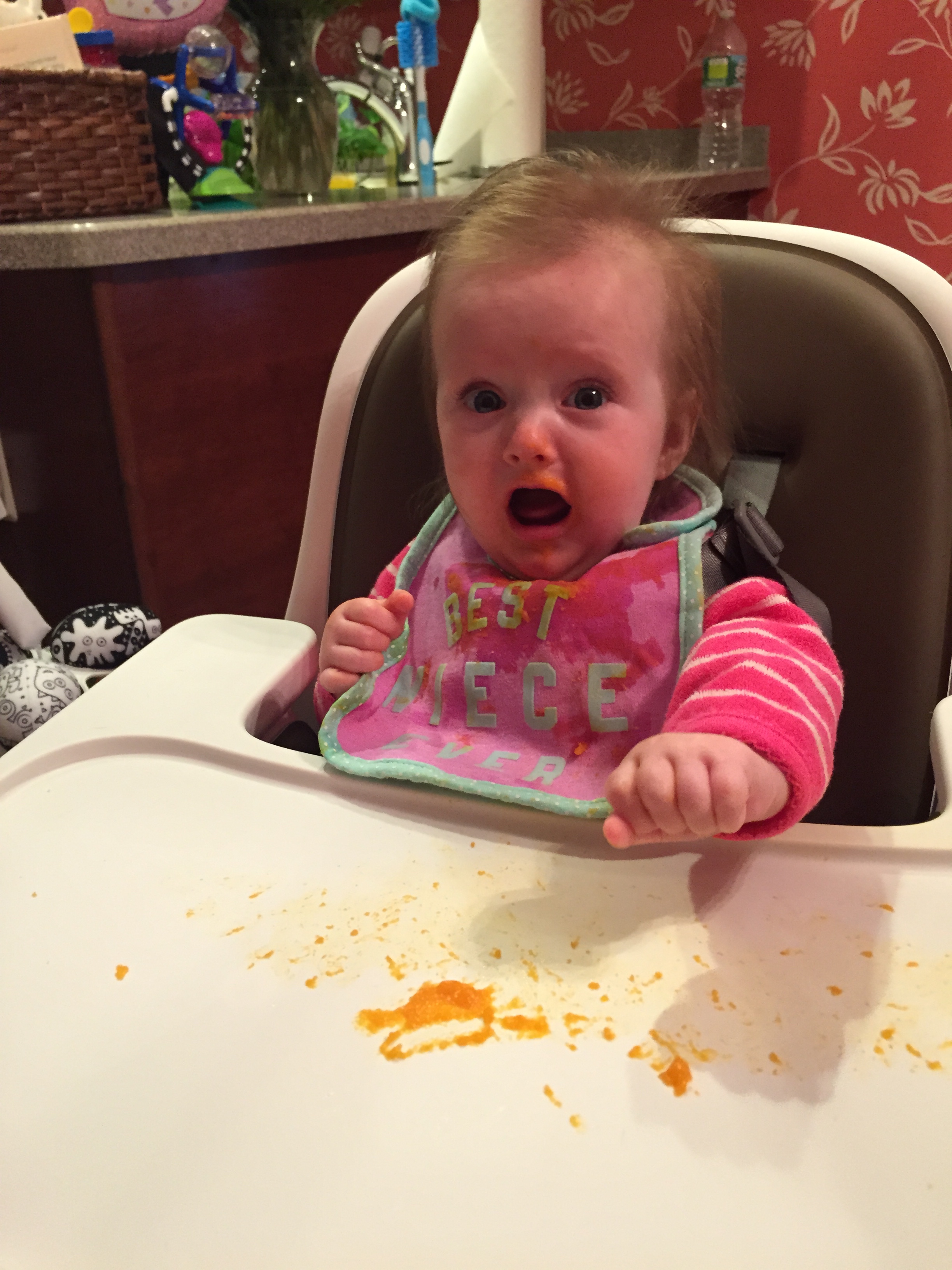 Charlotte we have moved on to fruits and veggies in your diet and boy has it been fun! Mommy has been making you homemade purees which has been pretty simple. The first veggie you tasted was carrots and you HATED them. I know hate is a strong word but you couldn’t spit them out fast enough. Since then we have tried avocado, butternut squash, sweet potato and banana – all of which you love 🙂 Next we are going to try apples and pears which I’m sure you will love! Tyson and Layla sit at the side of your highchair waiting for you to throw them a dropping or two – it won’t be long before you are feeding them your food.