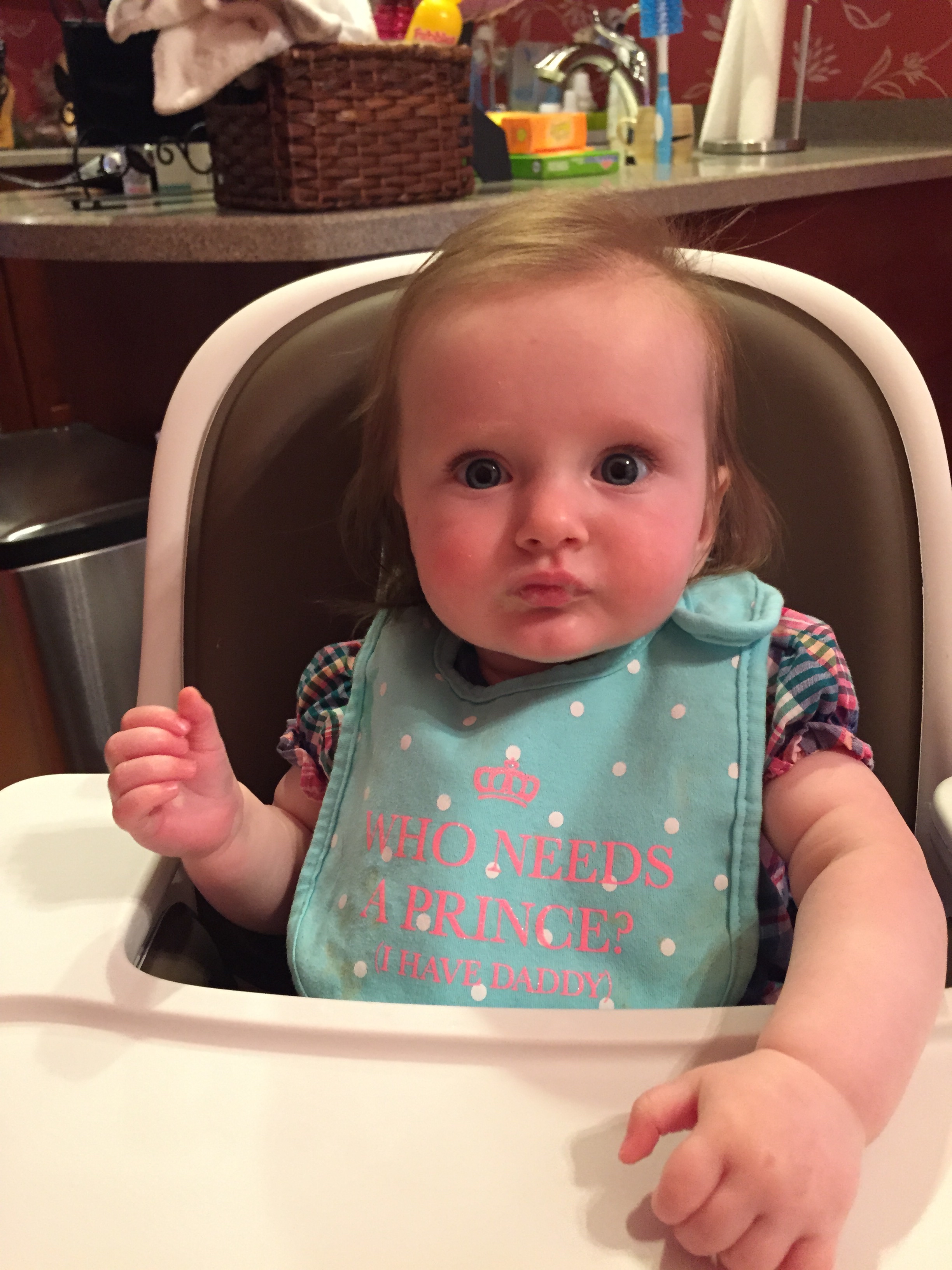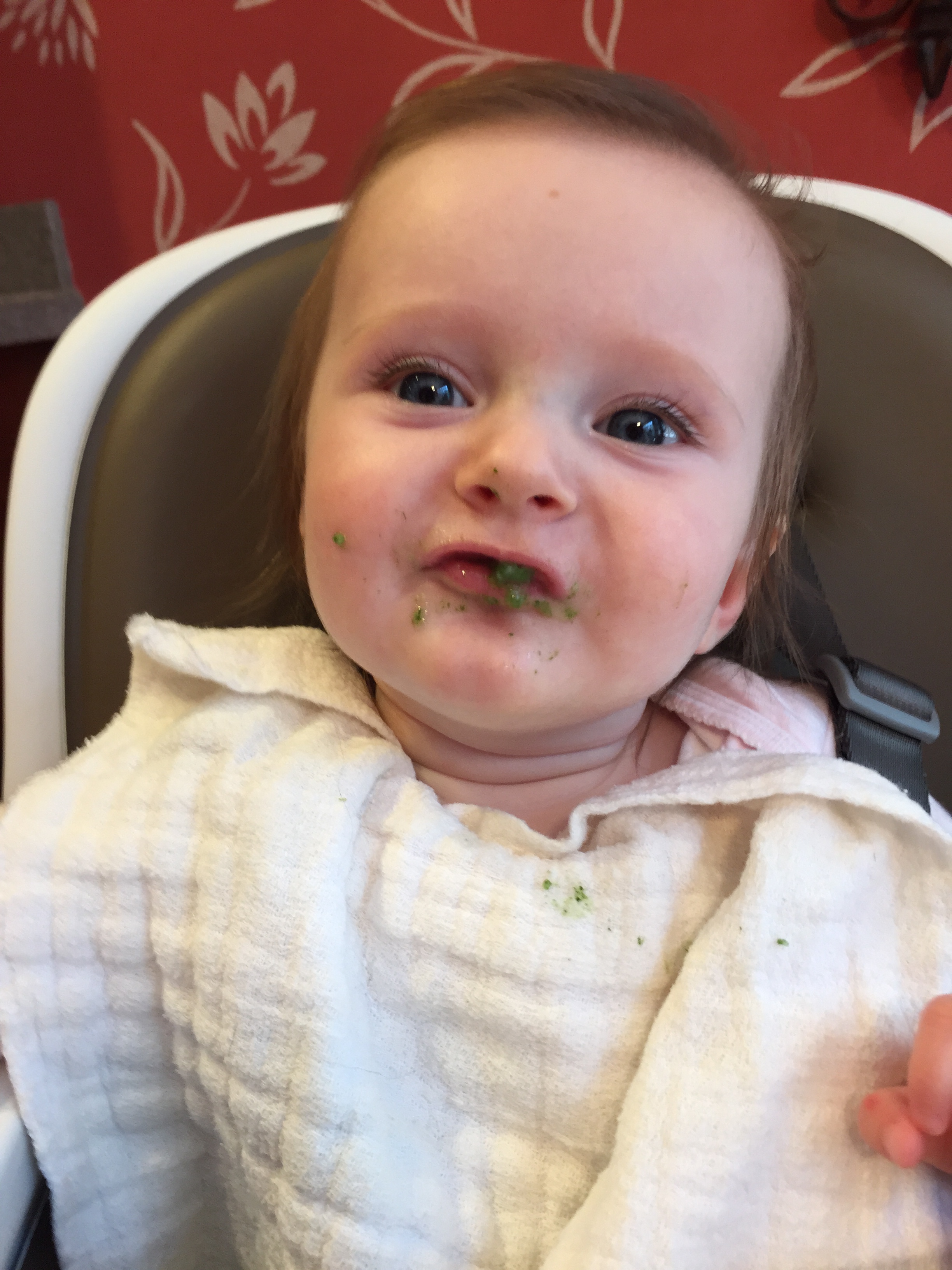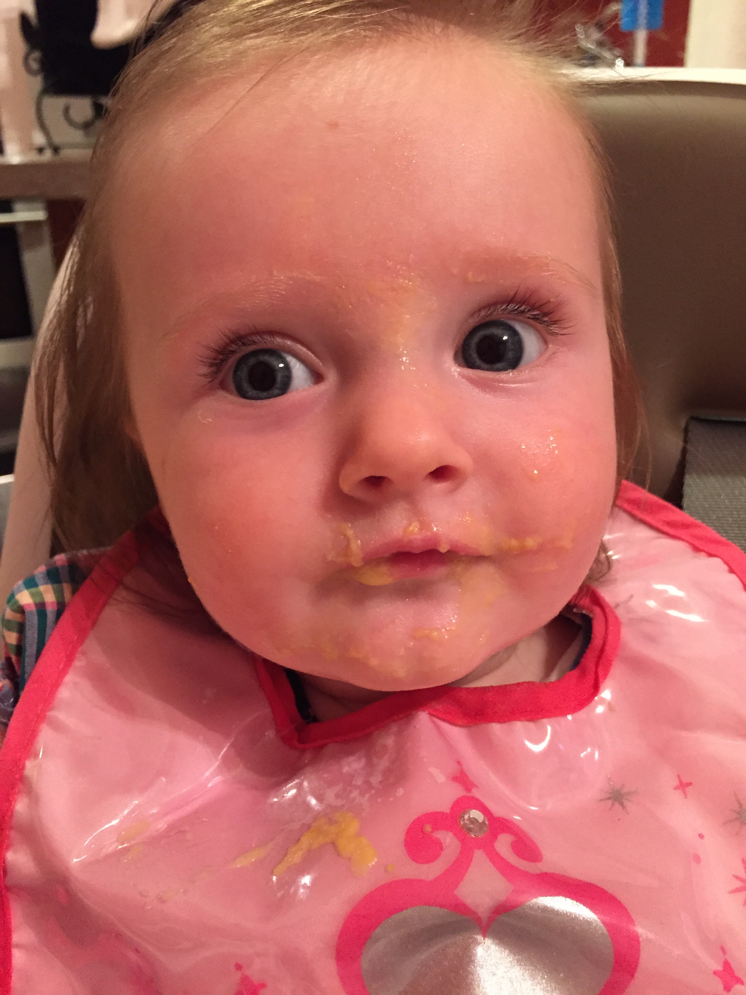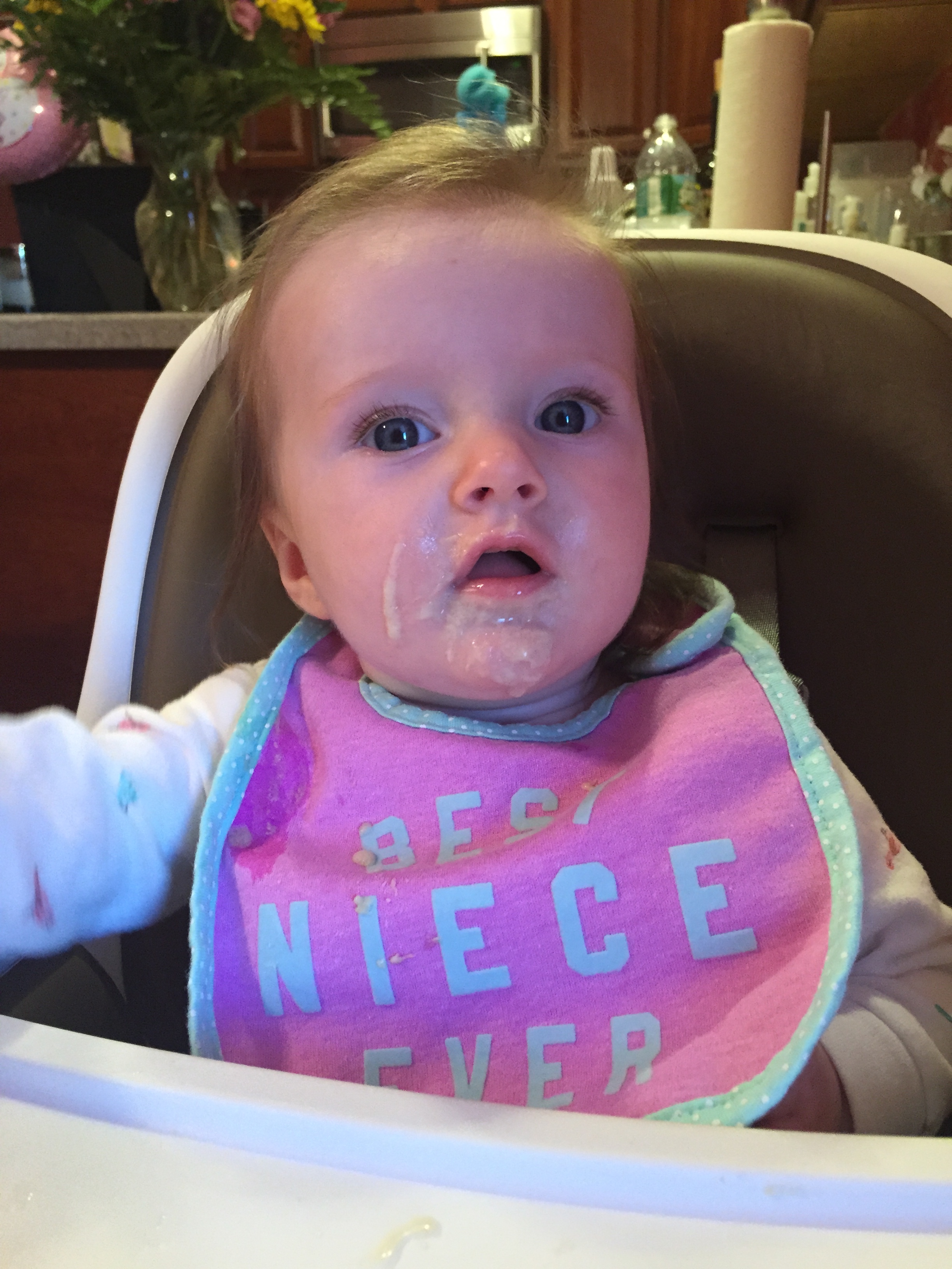 Charlotte we have moved on to fruits and veggies in your diet and boy has it been fun! Mommy has been making you homemade purees which has been pretty simple. The first veggie you tasted was carrots and you HATED them. I know hate is a strong word but you couldn’t spit them out fast enough. Since then we have tried avocado, butternut squash, sweet potato and banana – all of which you love 🙂 Next we are going to try apples and pears which I’m sure you will love! Tyson and Layla sit at the side of your highchair waiting for you to throw them a dropping or two – it won’t be long before you are feeding them your food.