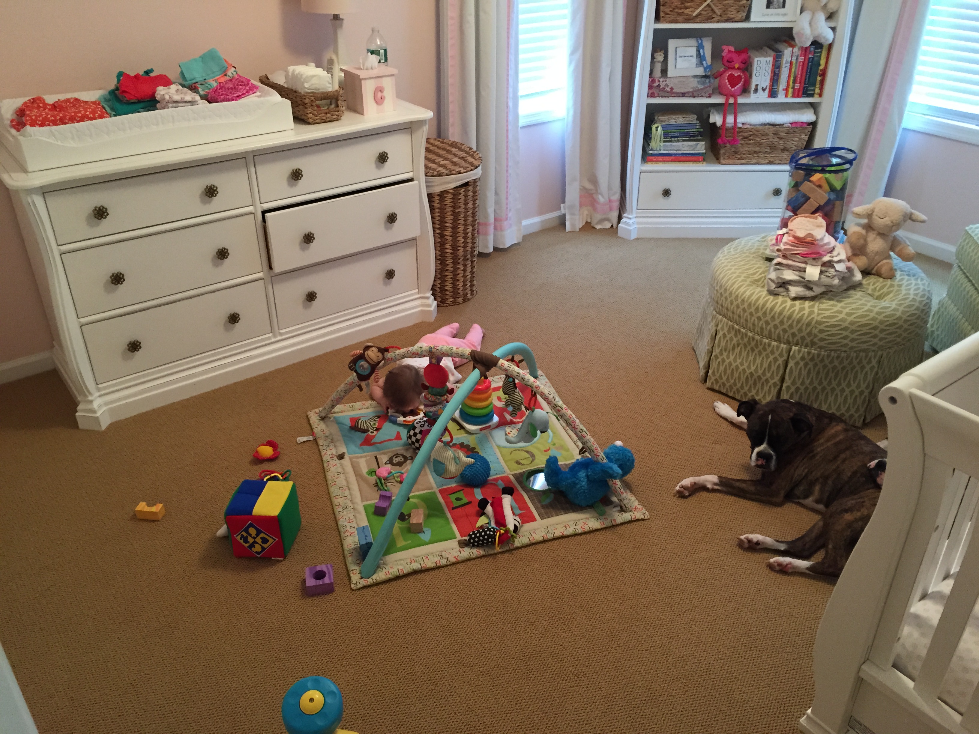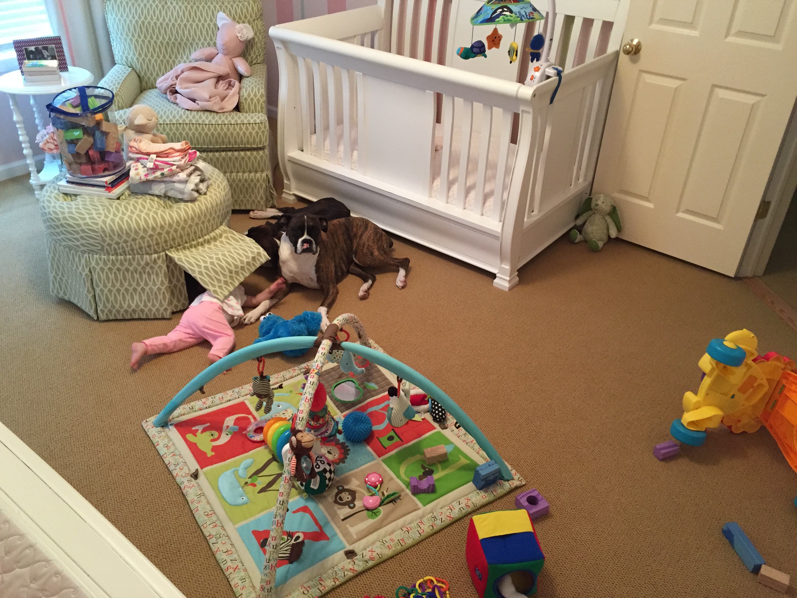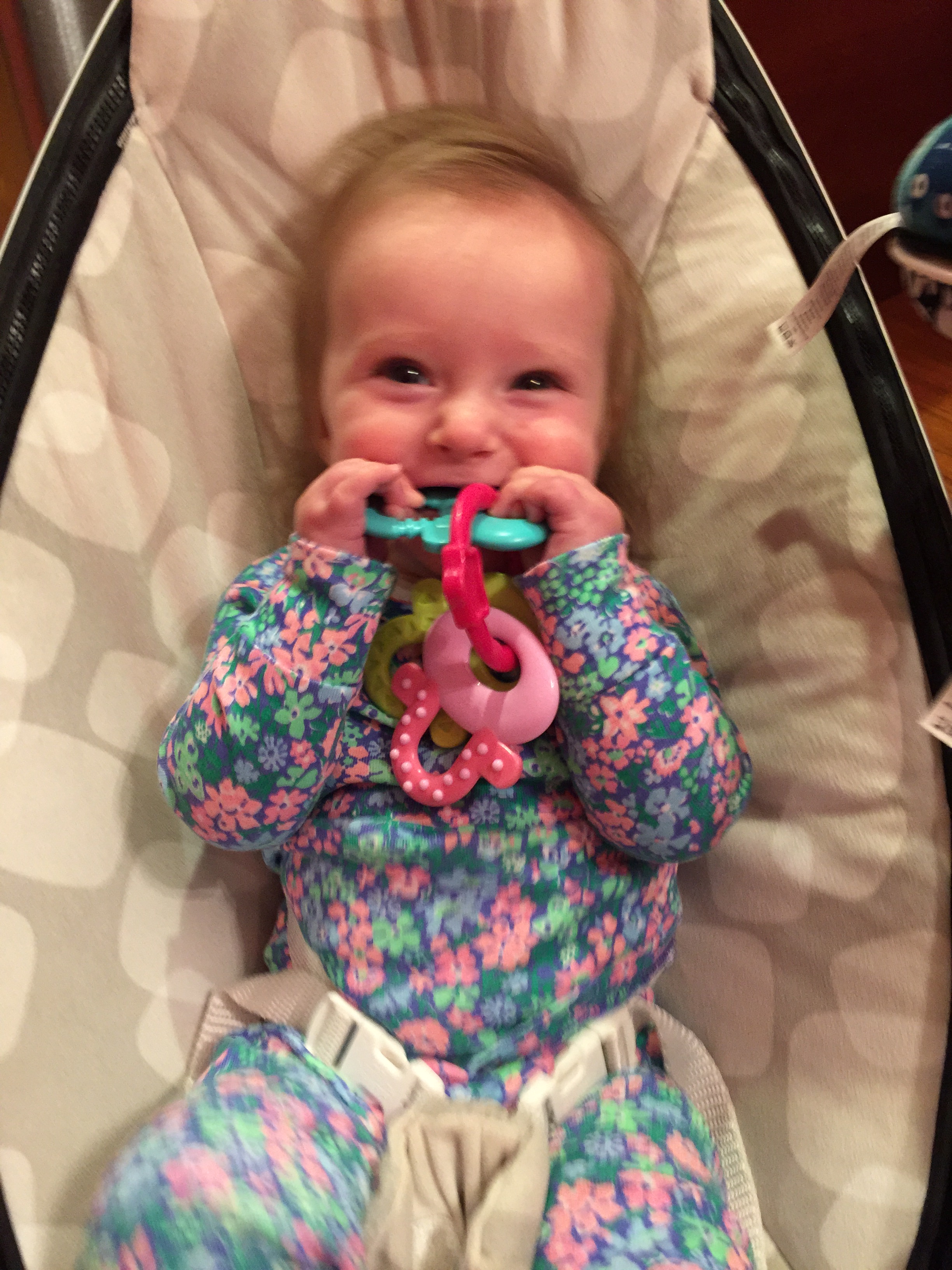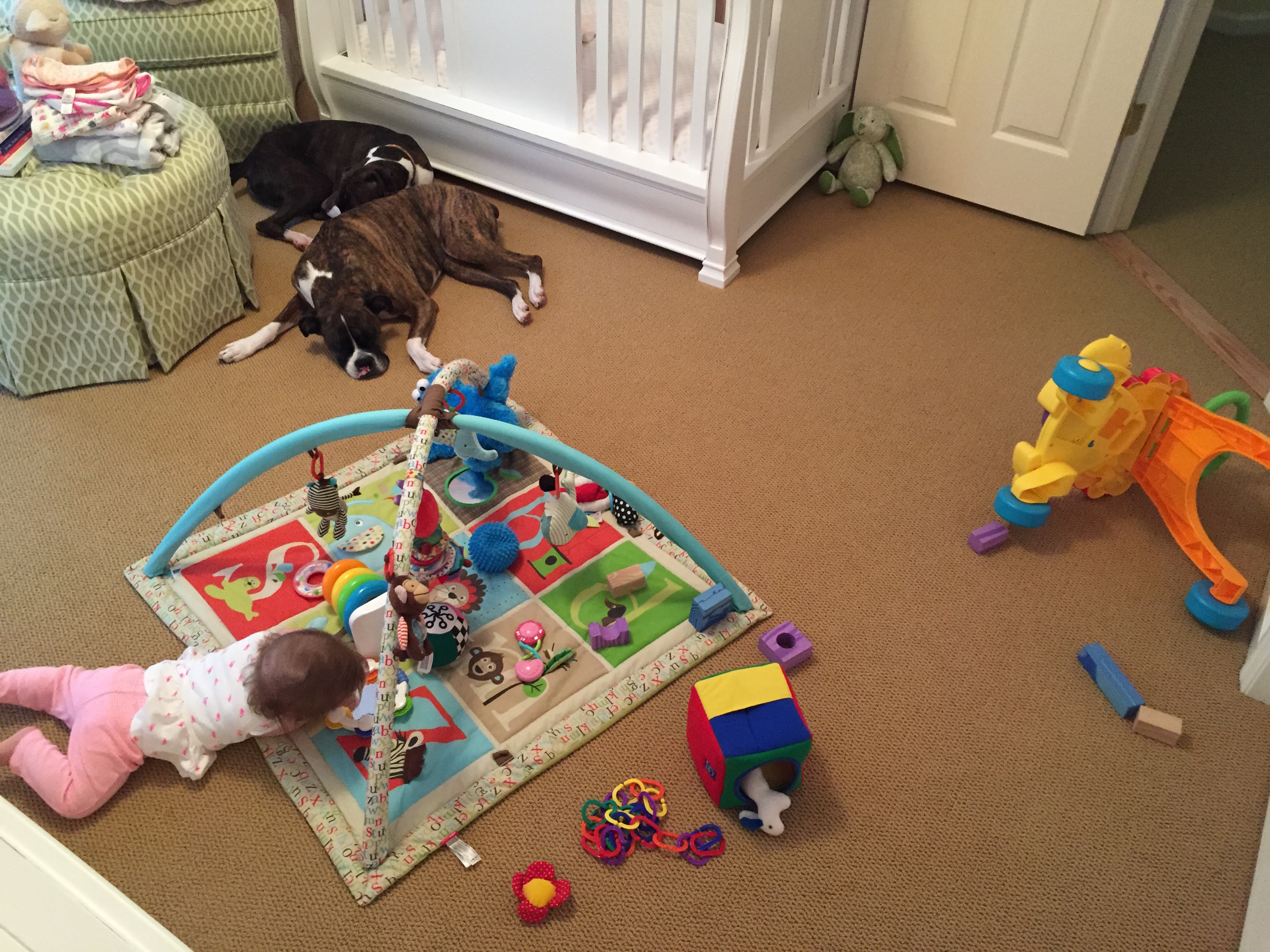 Charlotte we have moved on to fruits and veggies in your diet and boy has it been fun! Mommy has been making you homemade purees which has been pretty simple. The first veggie you tasted was carrots and you HATED them. I know hate is a strong word but you couldn’t spit them out fast enough. Since then we have tried avocado, butternut squash, sweet potato and banana – all of which you love 🙂 Next we are going to try apples and pears which I’m sure you will love! Tyson and Layla sit at the side of your highchair waiting for you to throw them a dropping or two – it won’t be long before you are feeding them your food.