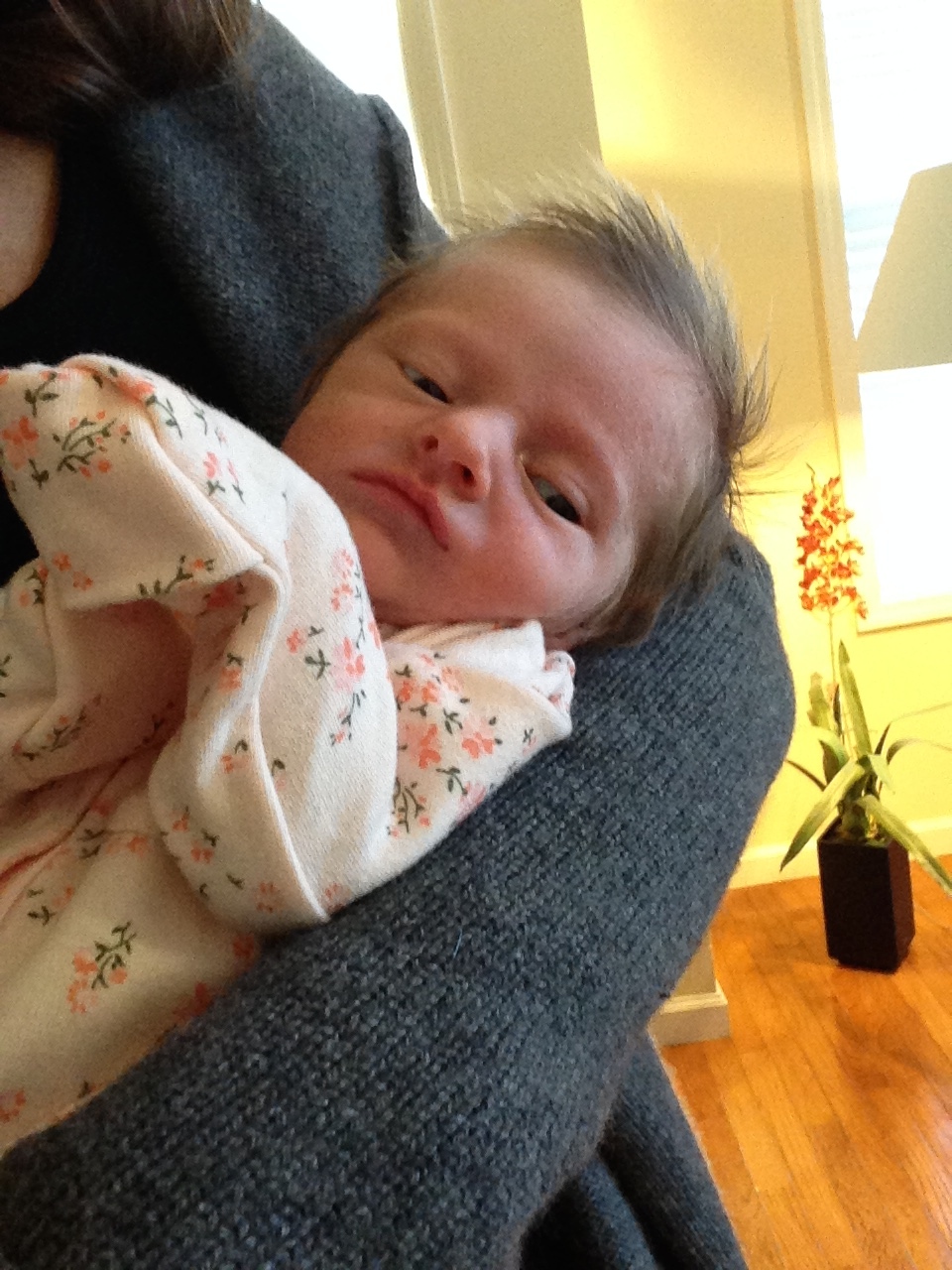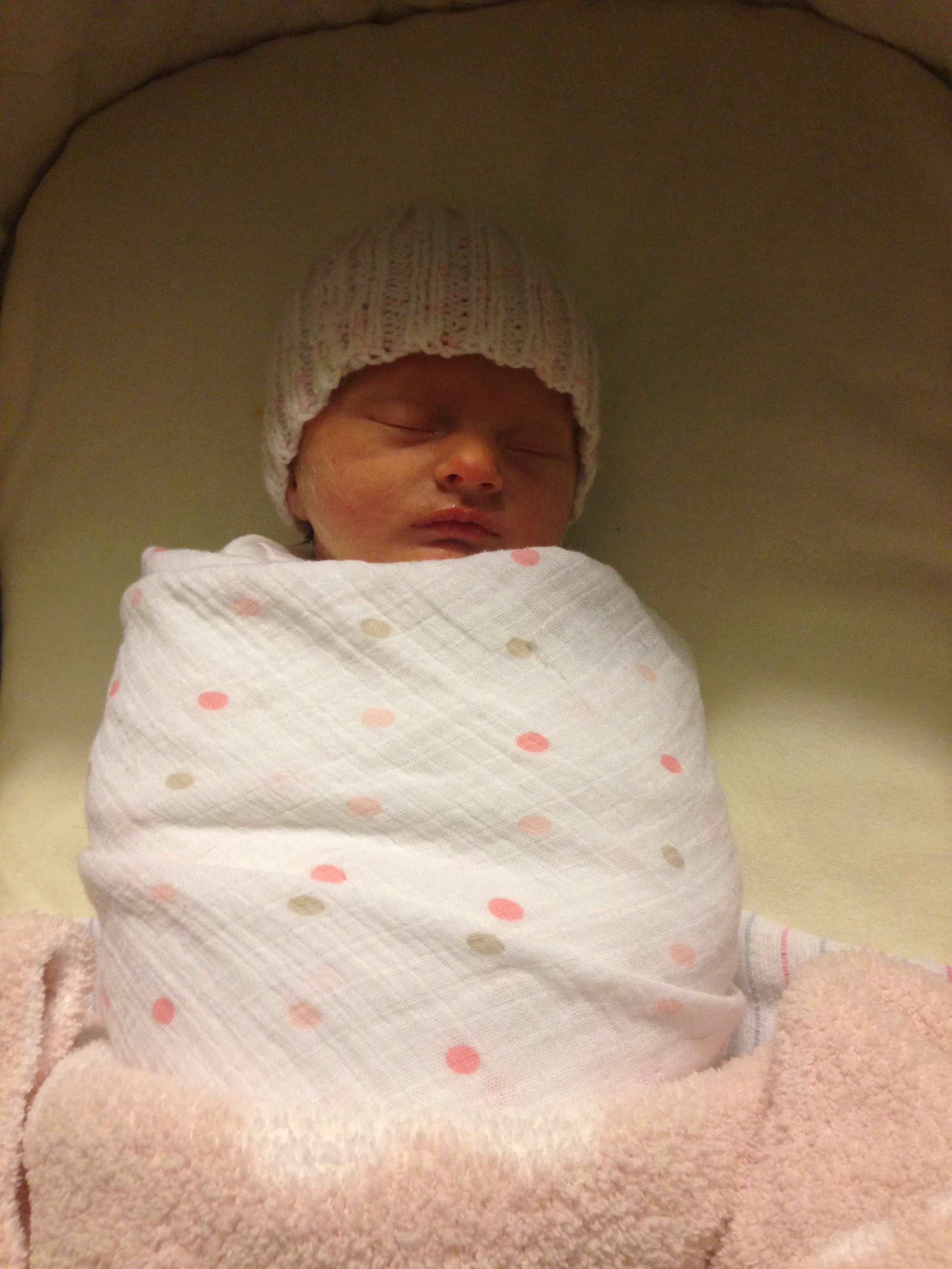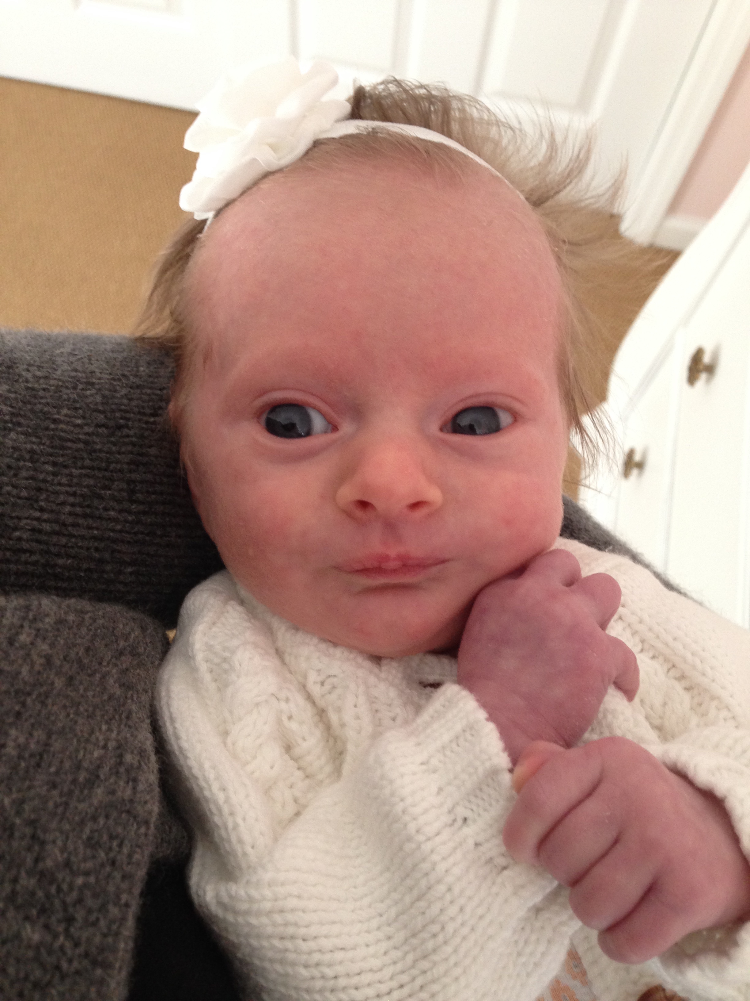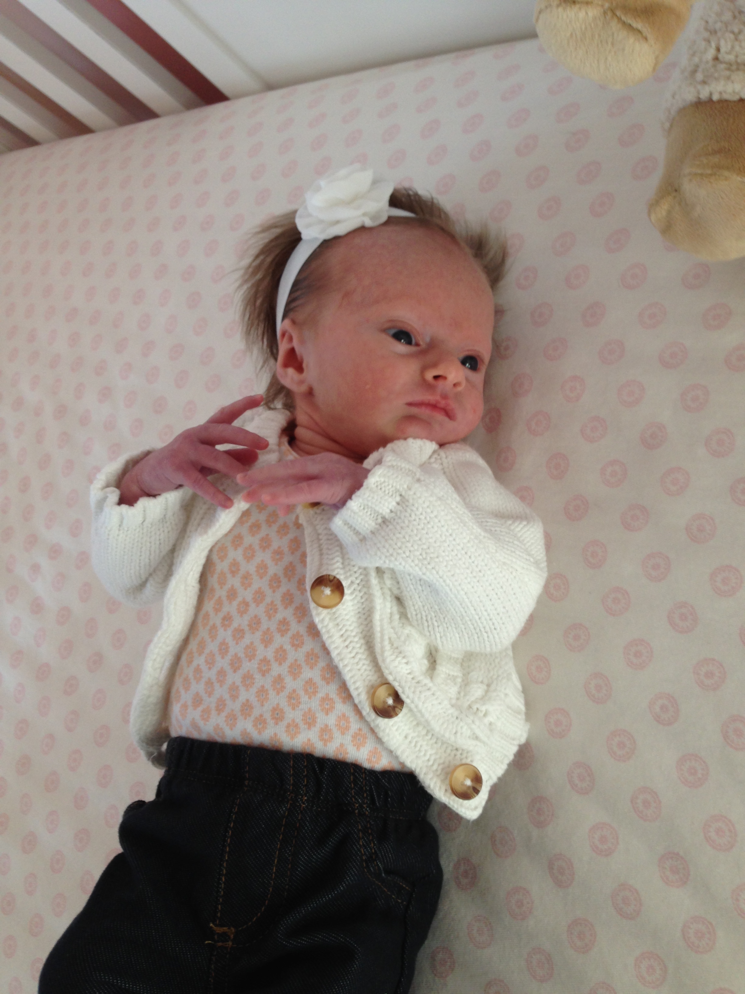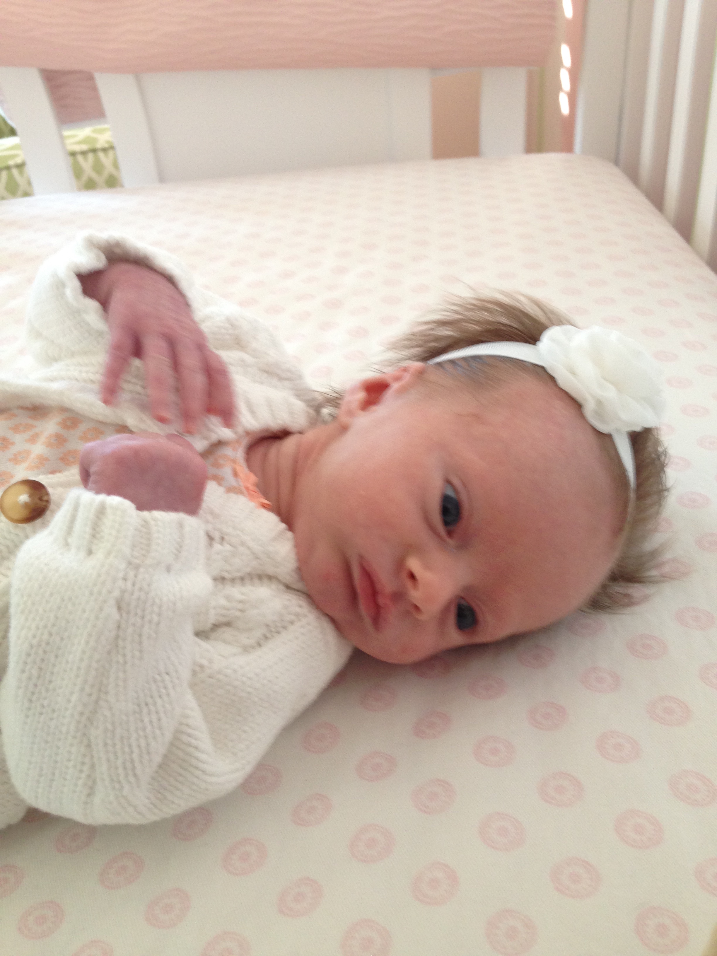 Charlotte you are almost 5 weeks old now and we survived our first month together…I have to say it went by very quickly. You are getting big and starting to pack on more weight which makes mommy very happy. At your doctor’s appointment this week you weighed 7lbs 2 oz and were 21 1/2 inches long. You also got your second hepatitis shot and you did not like it…and mommy did not like seeing you scream 😦 You are so much more alert and aware of your surroundings – watching everything, smiling and cooing. And on the down side you like to pee every time mommy goes to change your diaper – this time you peed all over our bed…on mommy’s side – no bueno!