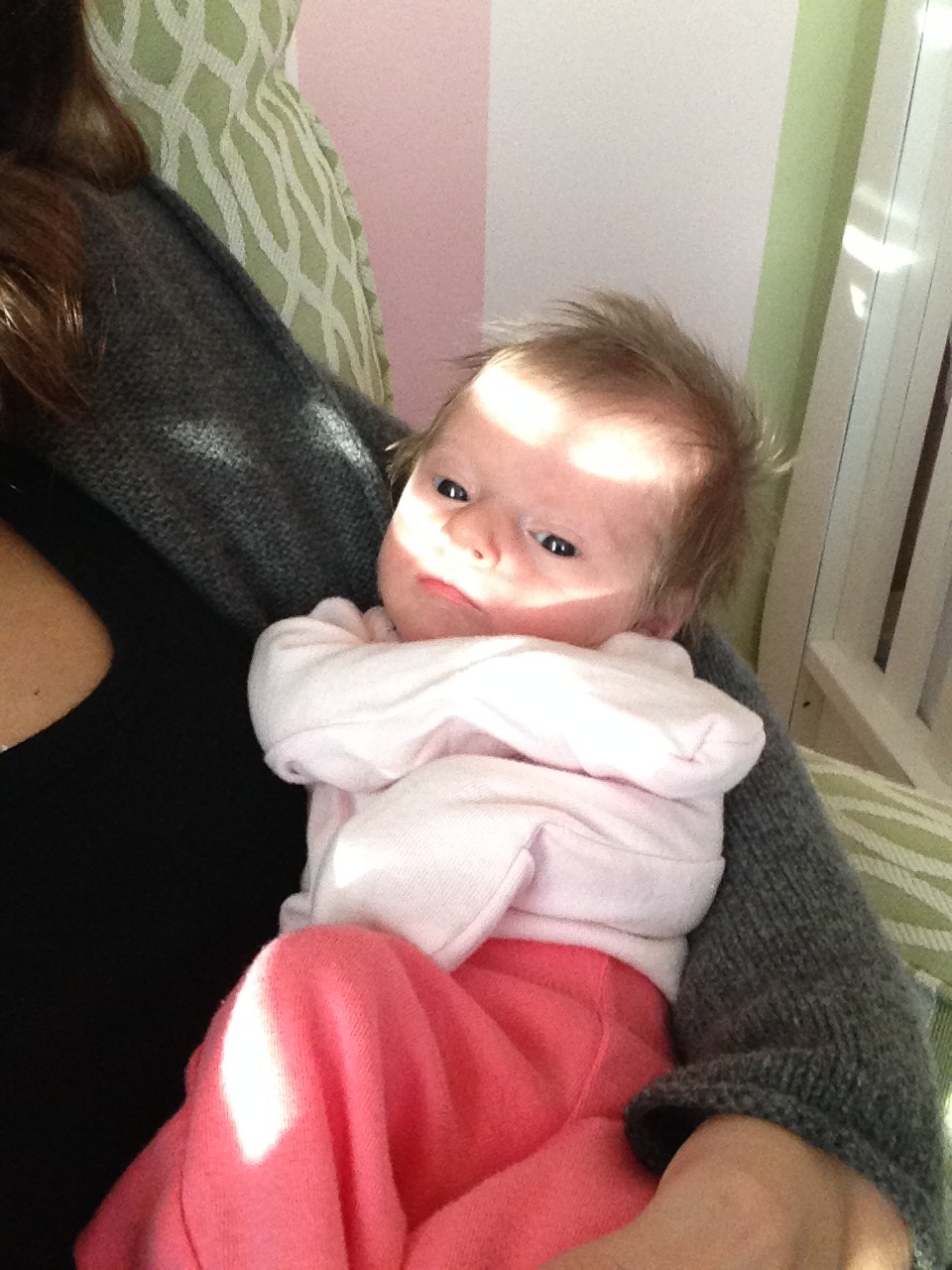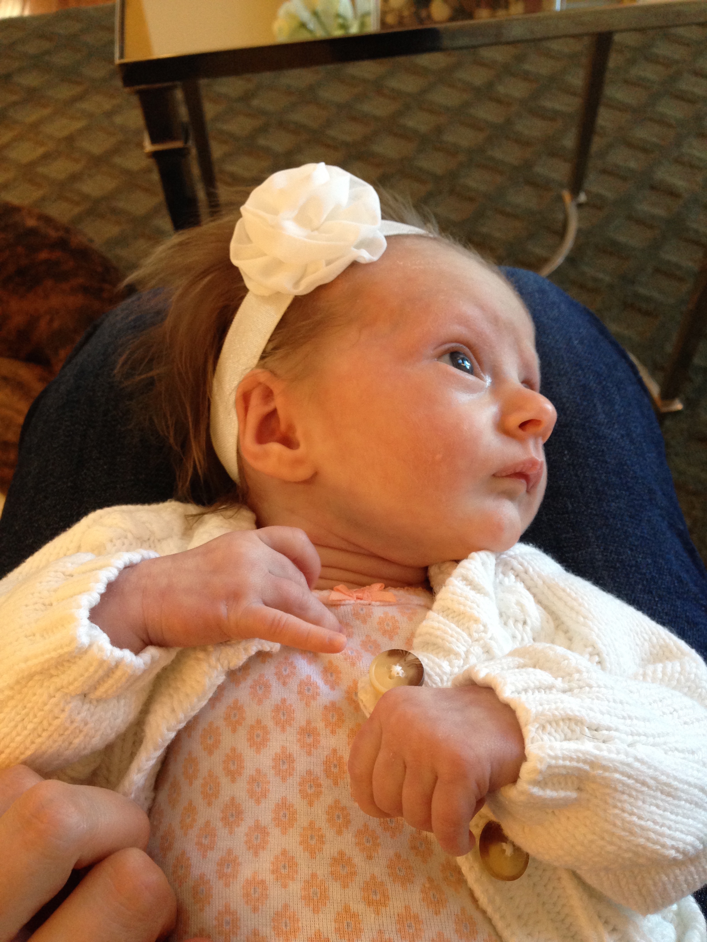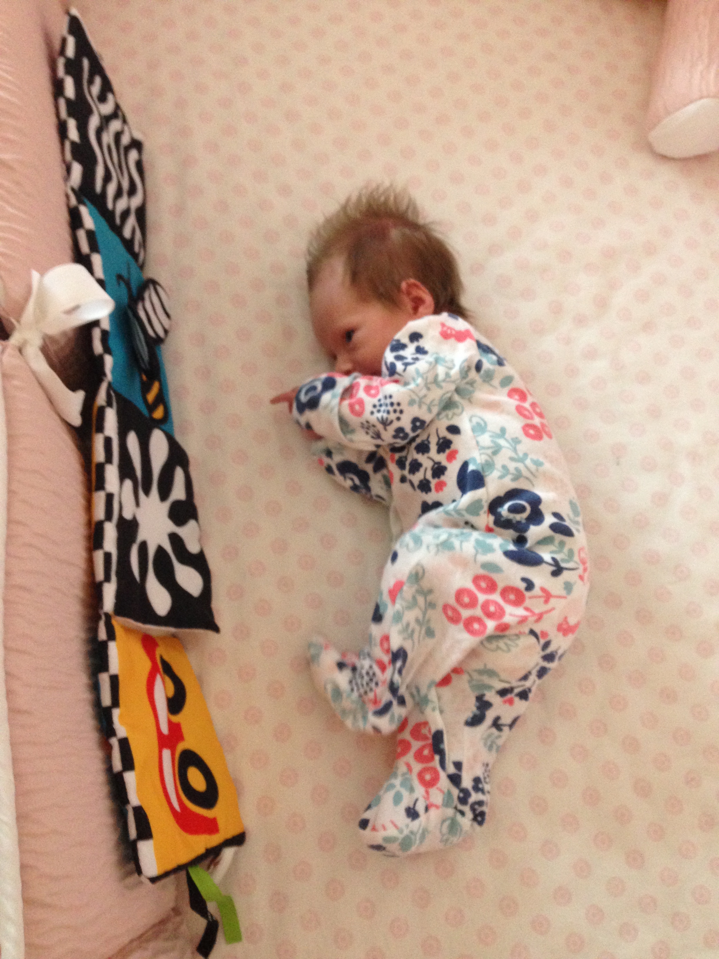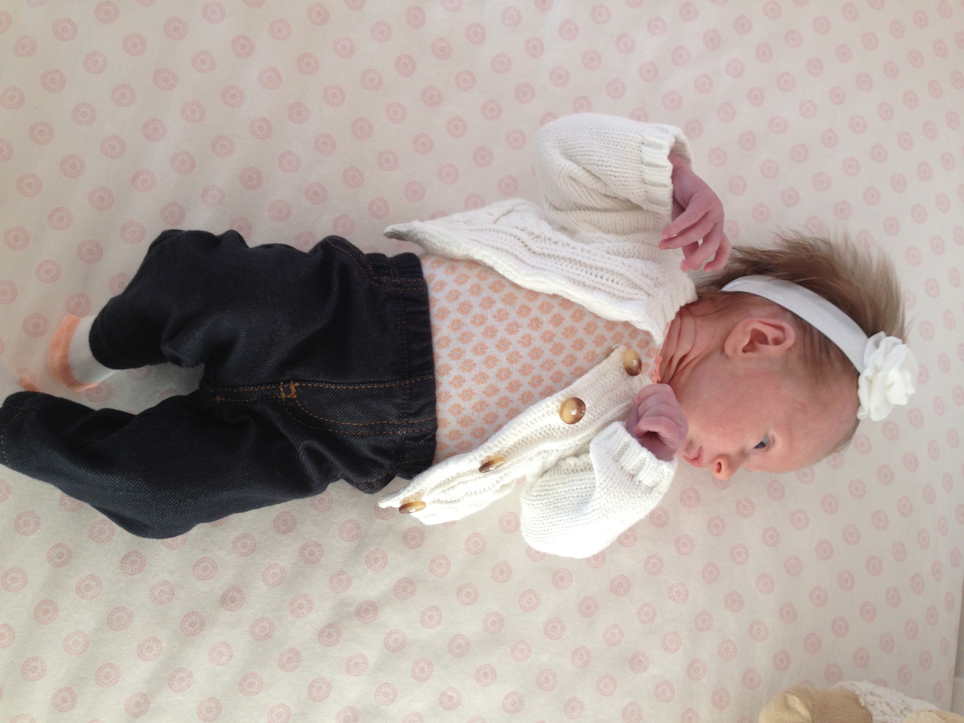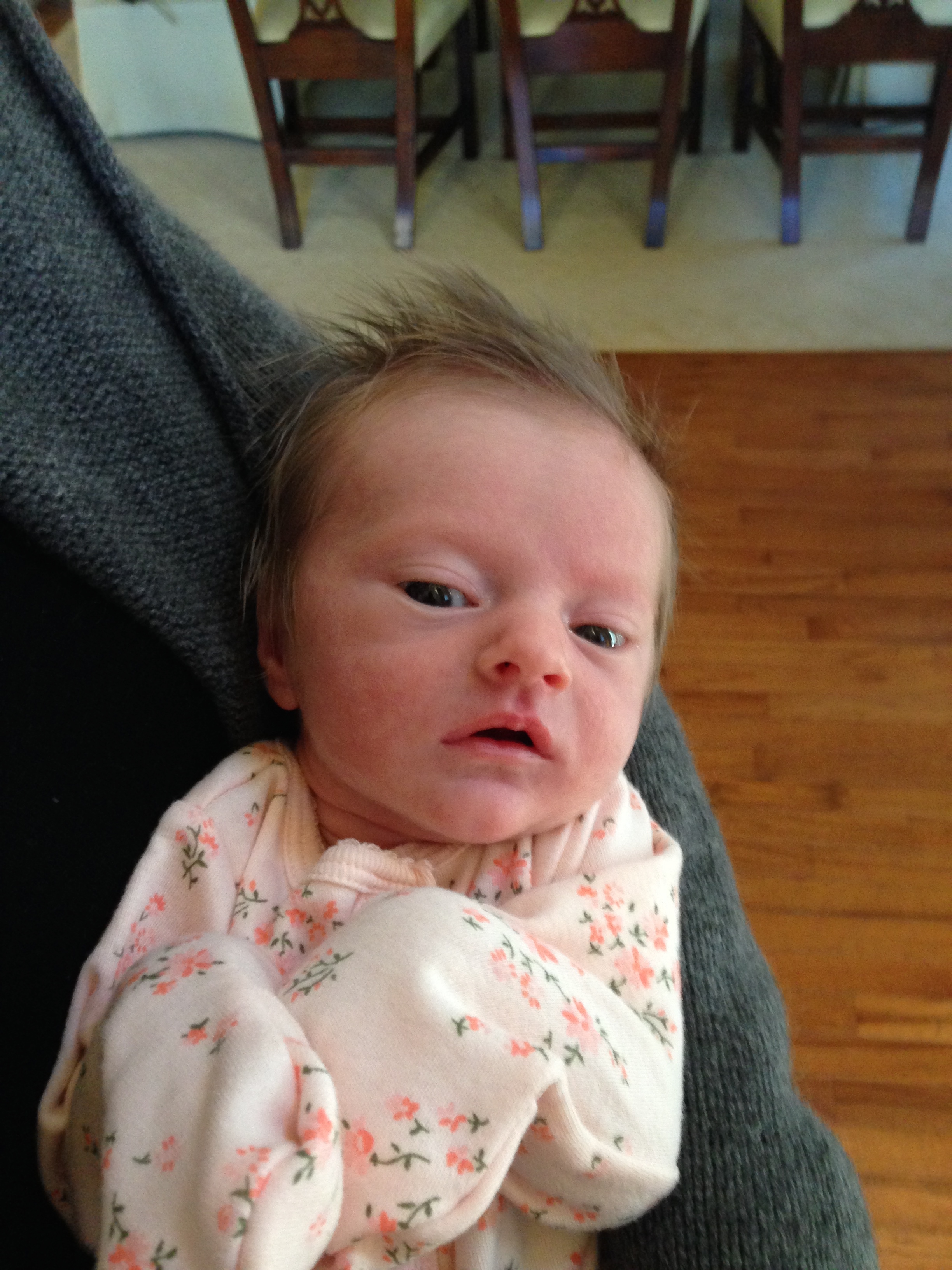 Charlotte you are almost 5 weeks old now and we survived our first month together…I have to say it went by very quickly. You are getting big and starting to pack on more weight which makes mommy very happy. At your doctor’s appointment this week you weighed 7lbs 2 oz and were 21 1/2 inches long. You also got your second hepatitis shot and you did not like it…and mommy did not like seeing you scream 😦 You are so much more alert and aware of your surroundings – watching everything, smiling and cooing. And on the down side you like to pee every time mommy goes to change your diaper – this time you peed all over our bed…on mommy’s side – no bueno!