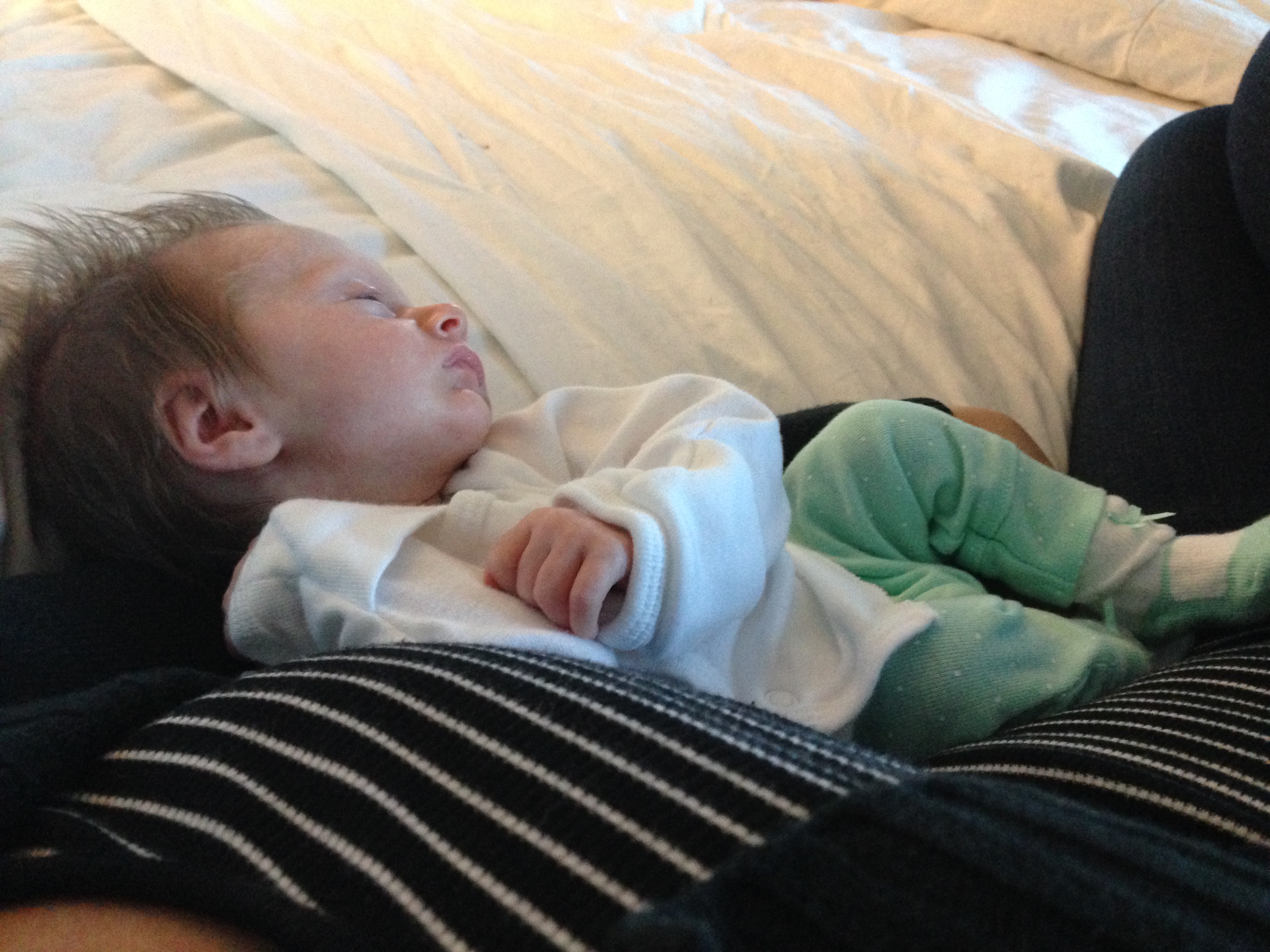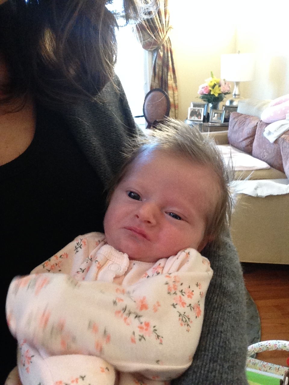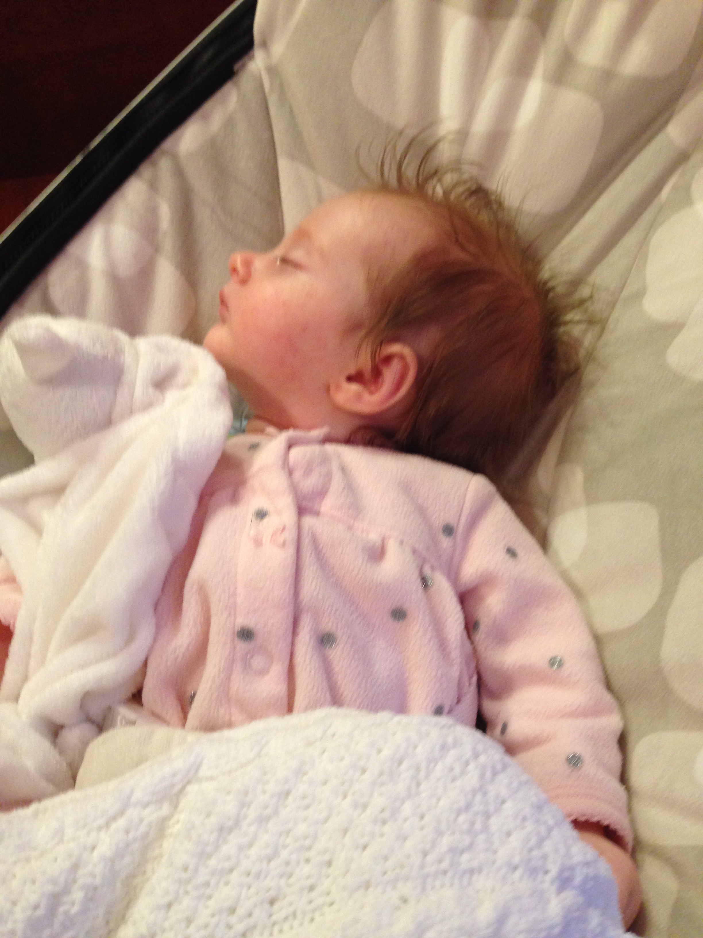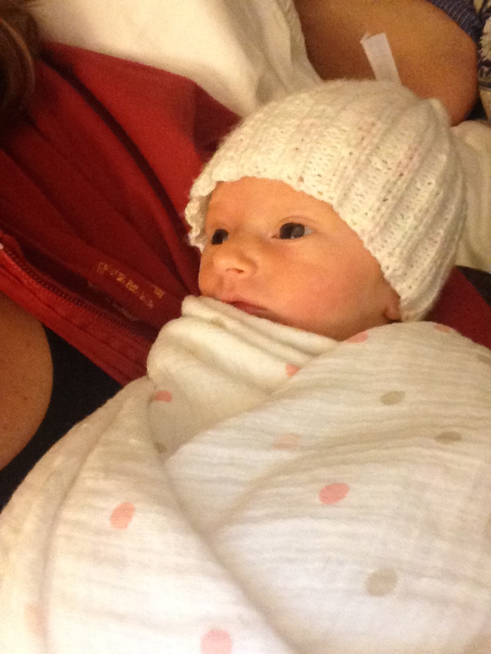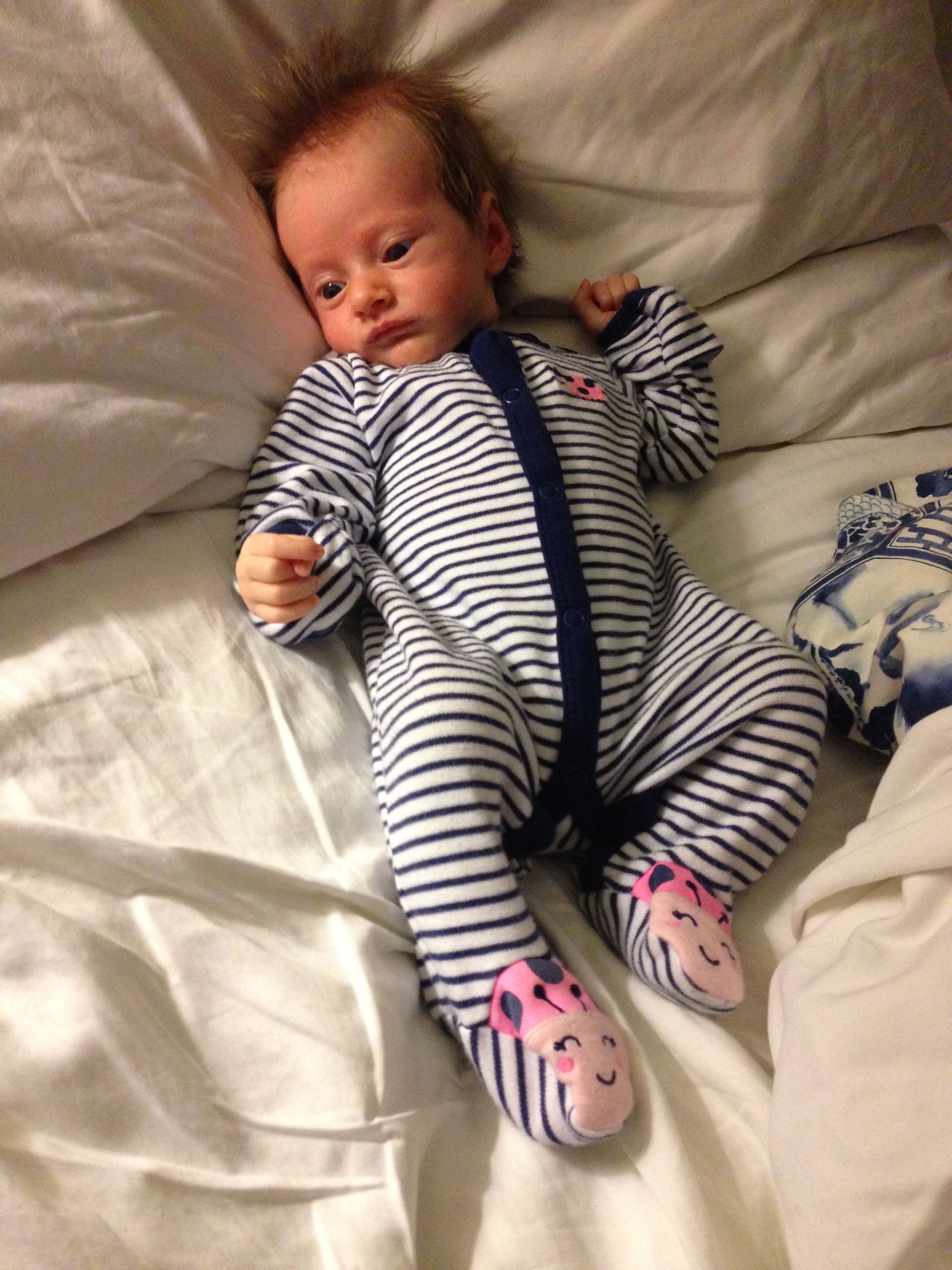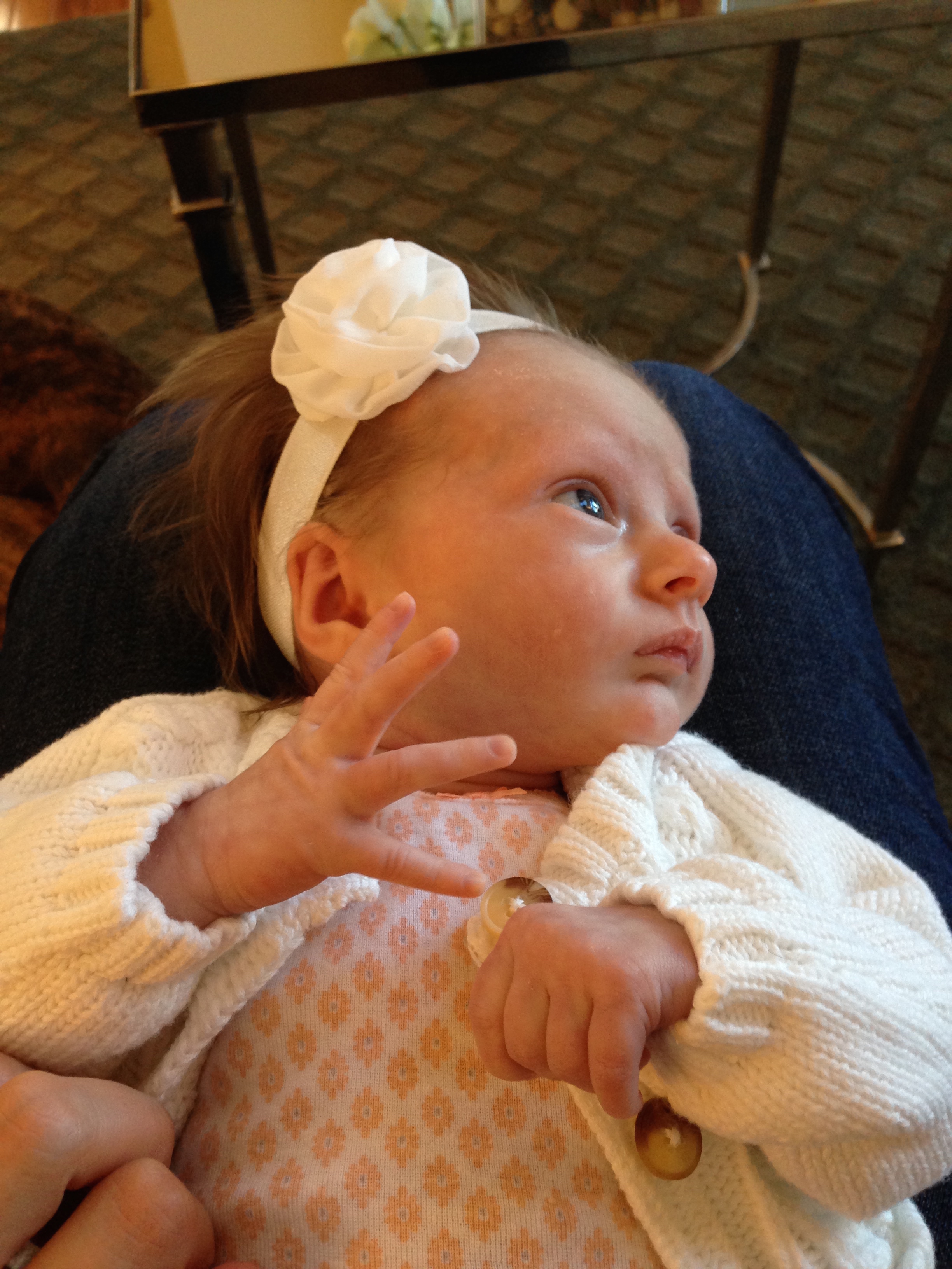 Charlotte you are almost 5 weeks old now and we survived our first month together…I have to say it went by very quickly. You are getting big and starting to pack on more weight which makes mommy very happy. At your doctor’s appointment this week you weighed 7lbs 2 oz and were 21 1/2 inches long. You also got your second hepatitis shot and you did not like it…and mommy did not like seeing you scream 😦 You are so much more alert and aware of your surroundings – watching everything, smiling and cooing. And on the down side you like to pee every time mommy goes to change your diaper – this time you peed all over our bed…on mommy’s side – no bueno!