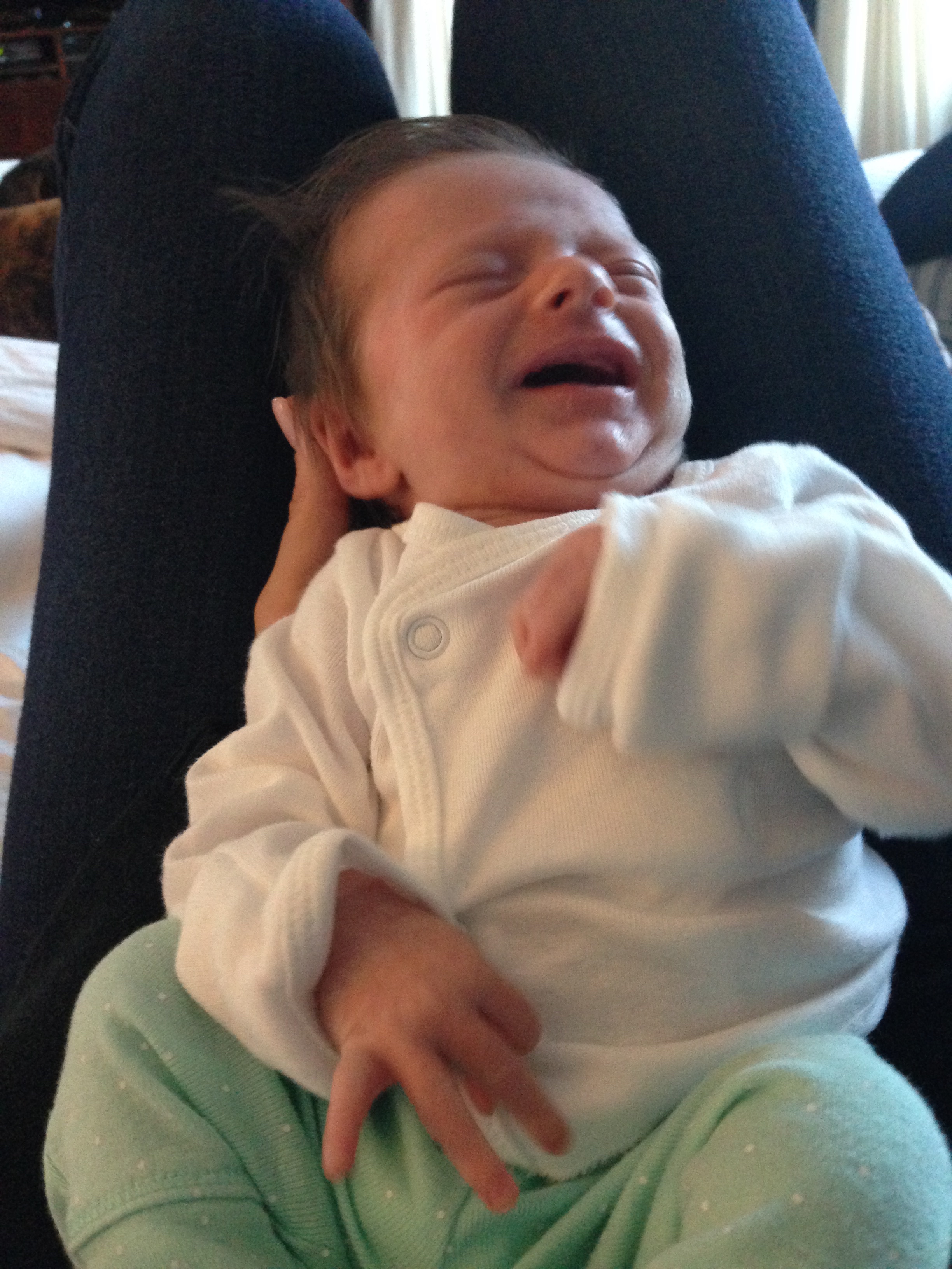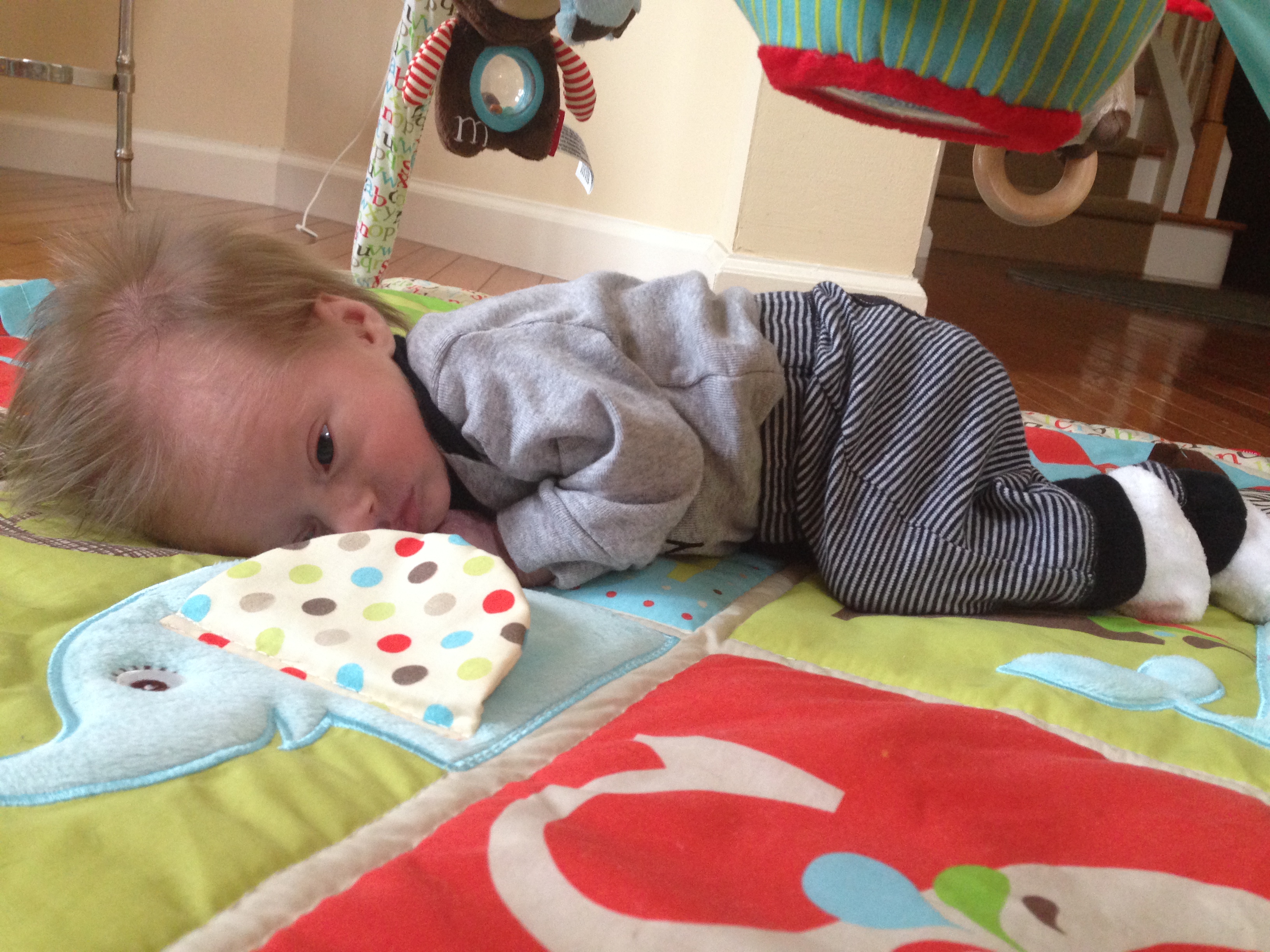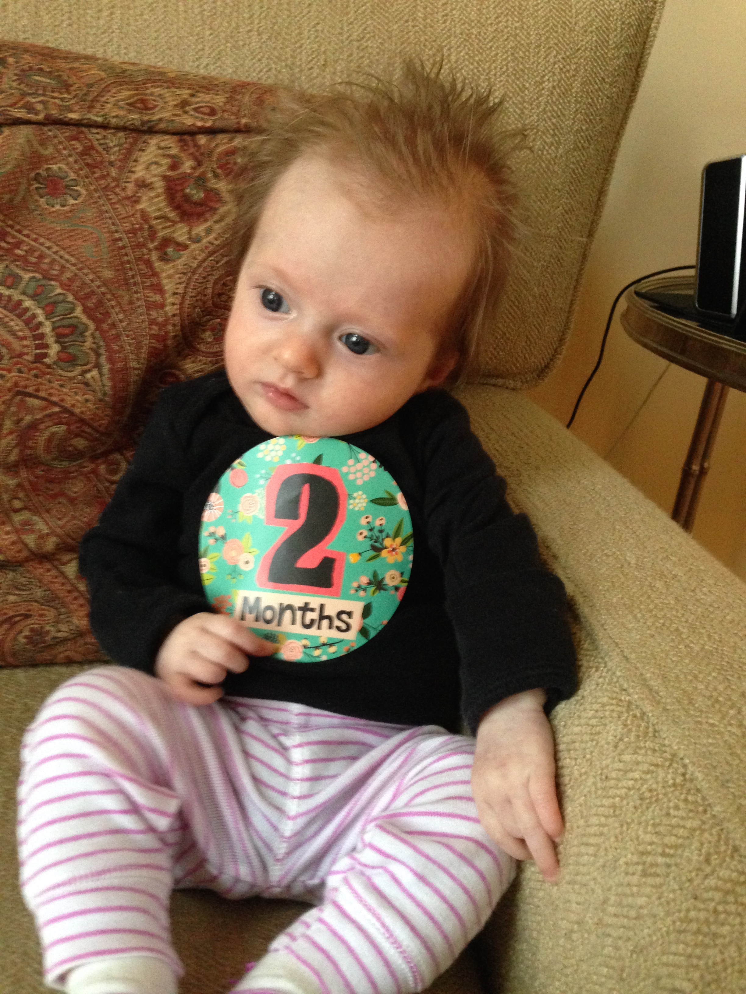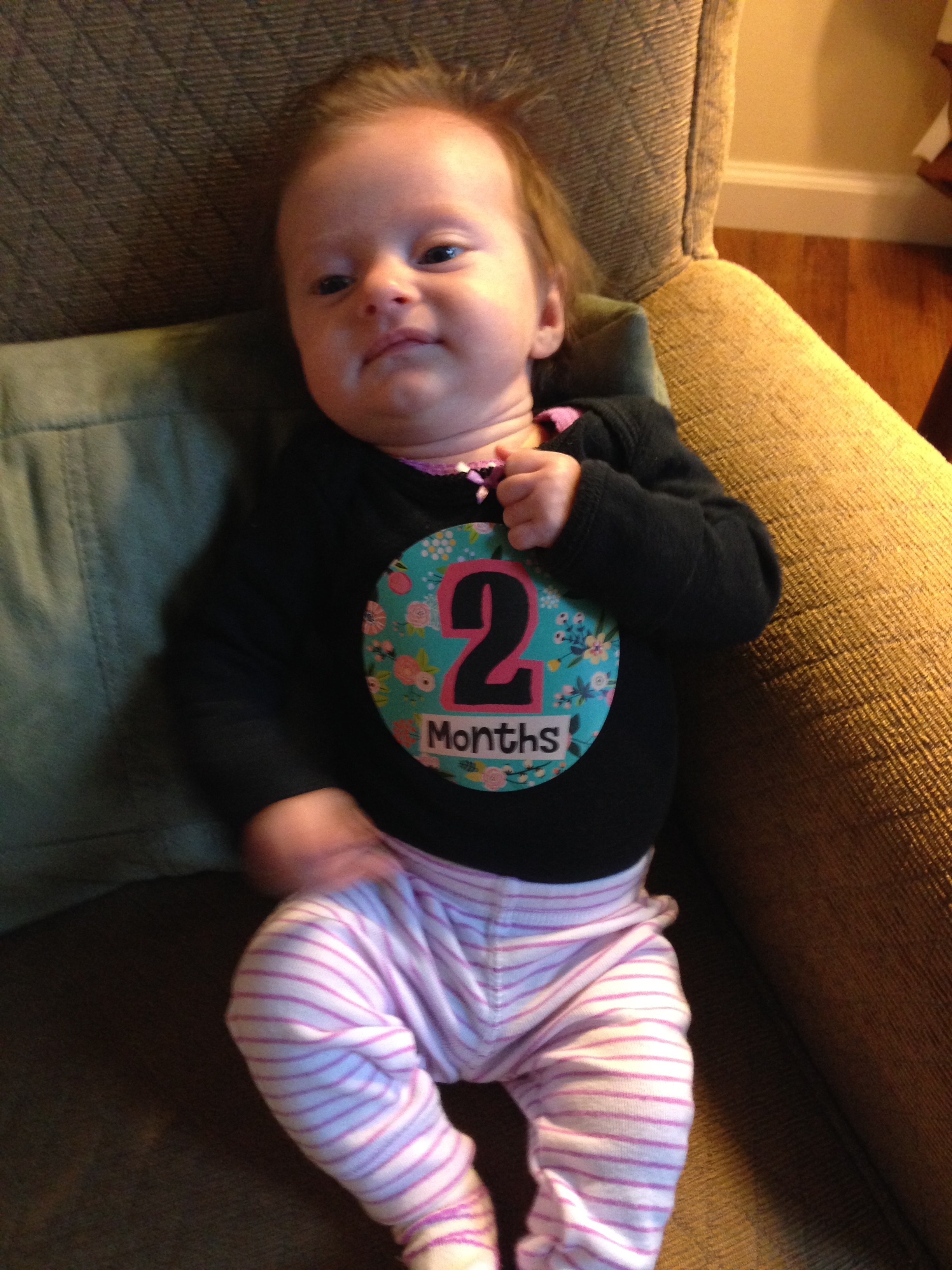 Getting bigger and stronger each day – weighing 9lbs and 3oz, and measuring 23 inches long. Had another round of vaccinations….you screamed your head up and were so unhappy, but not nearly as unhappy as mommy who had to see you cry 😦